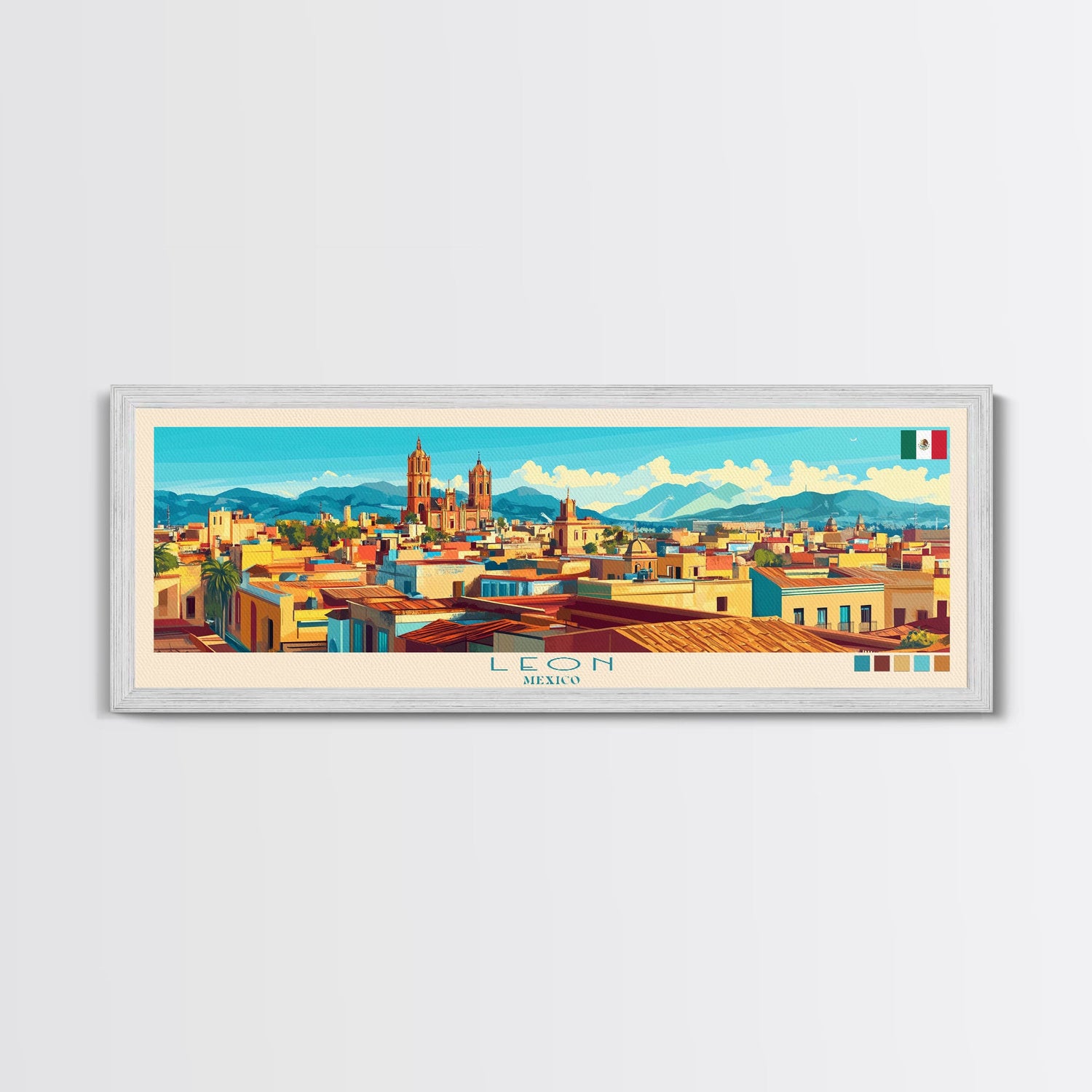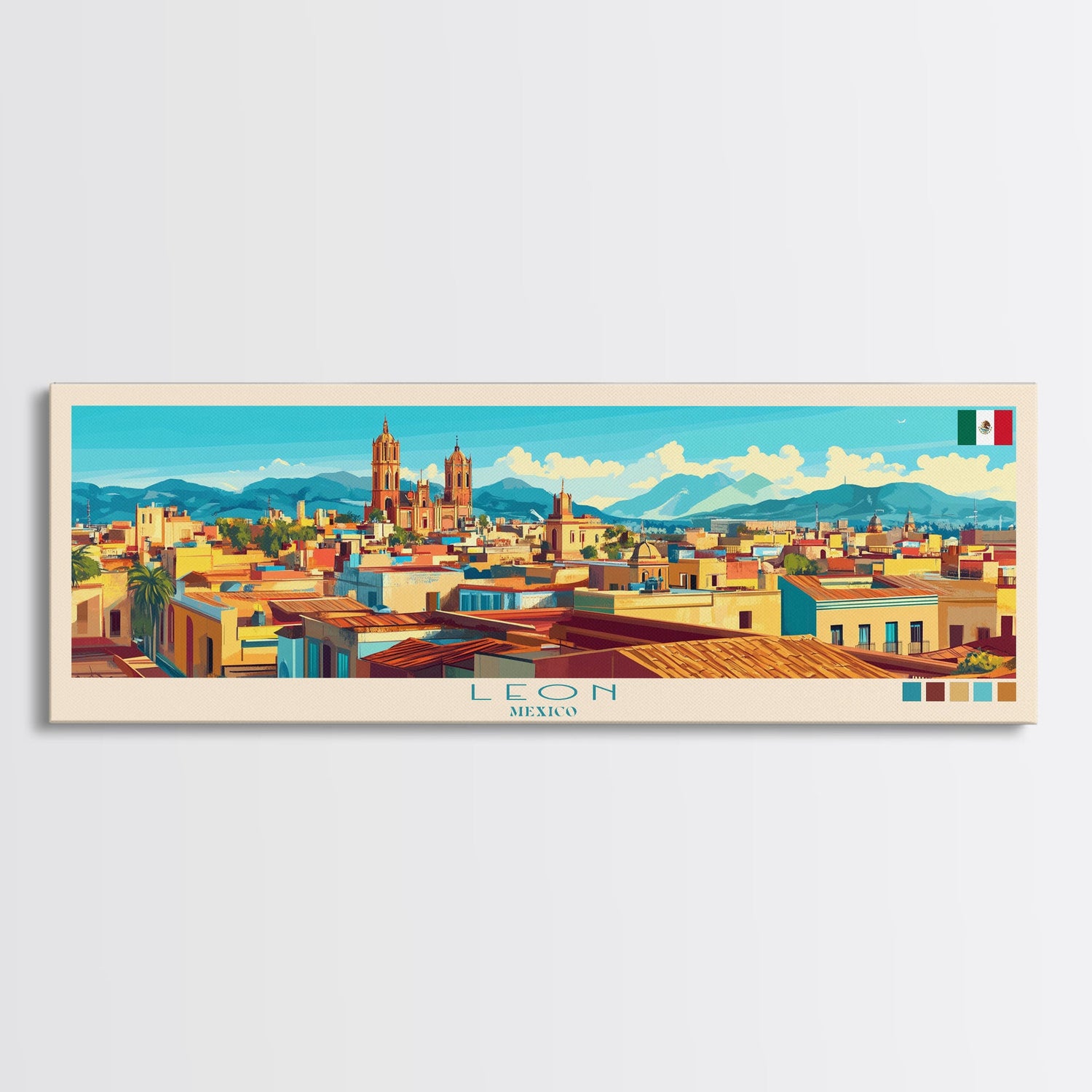 Leon, Mexico Panoramic Travel Poster Canvas Print, Leon, Mexico Painting, Mexico Art, Leon Travel Art, Guest Room Painting