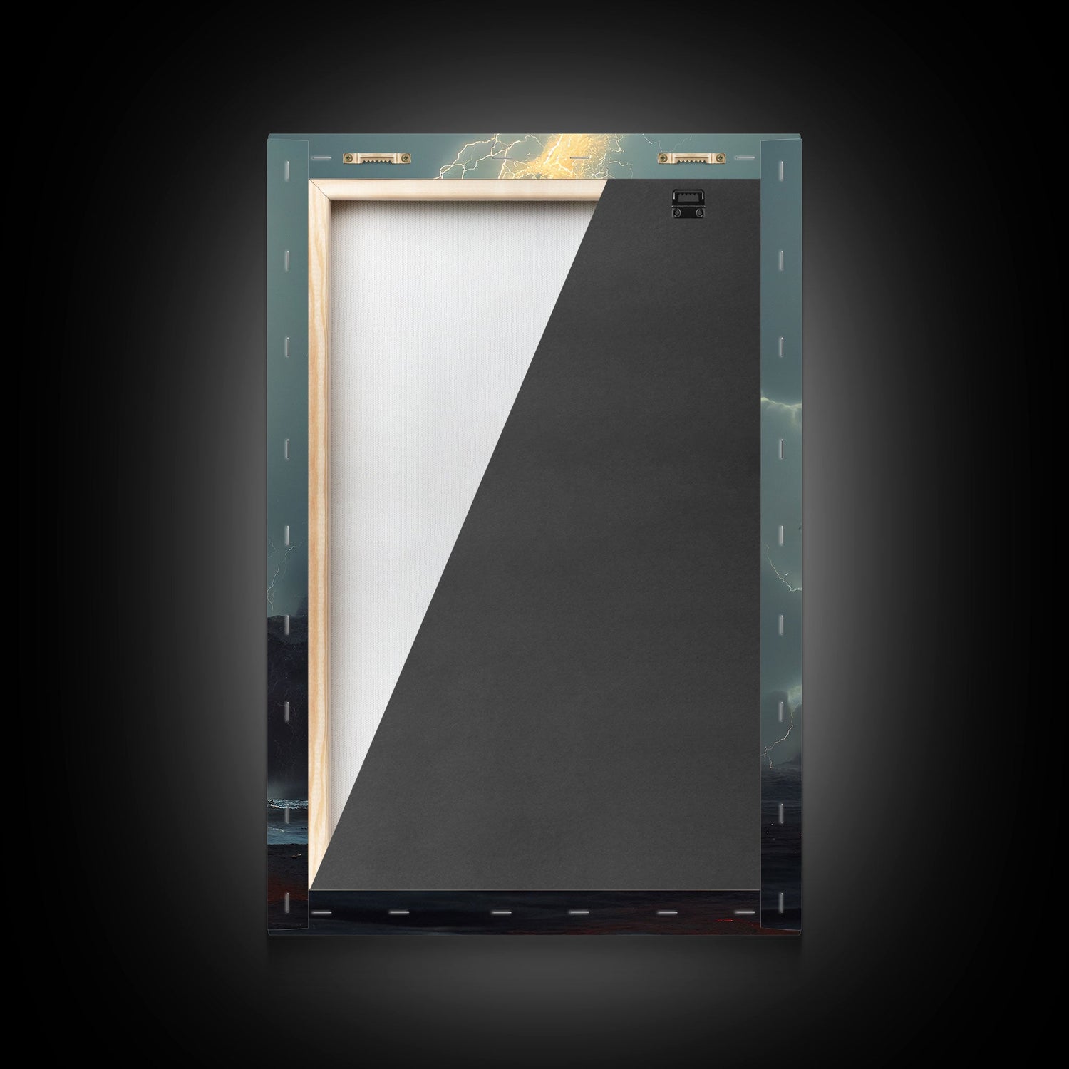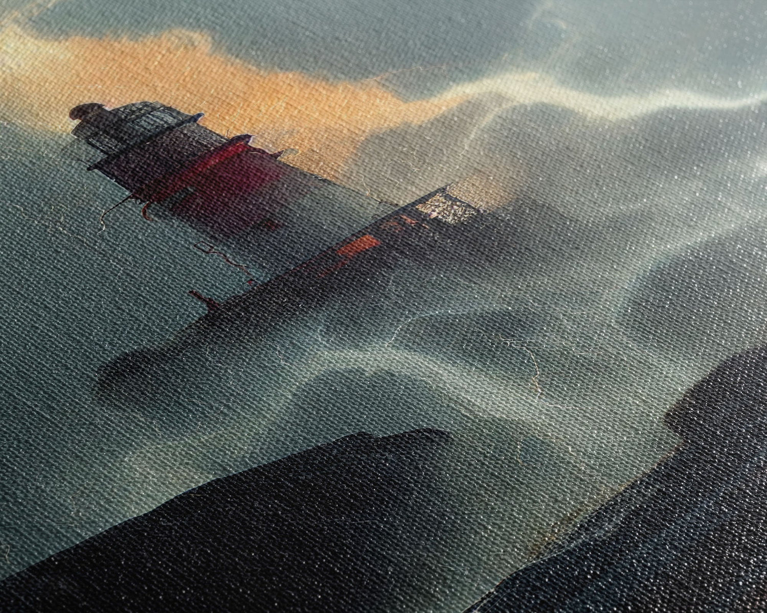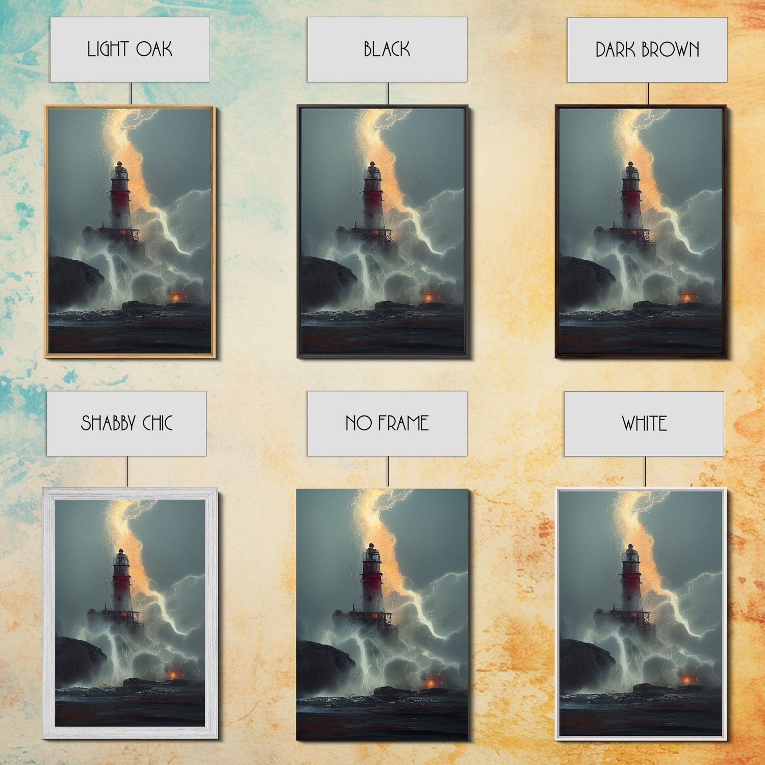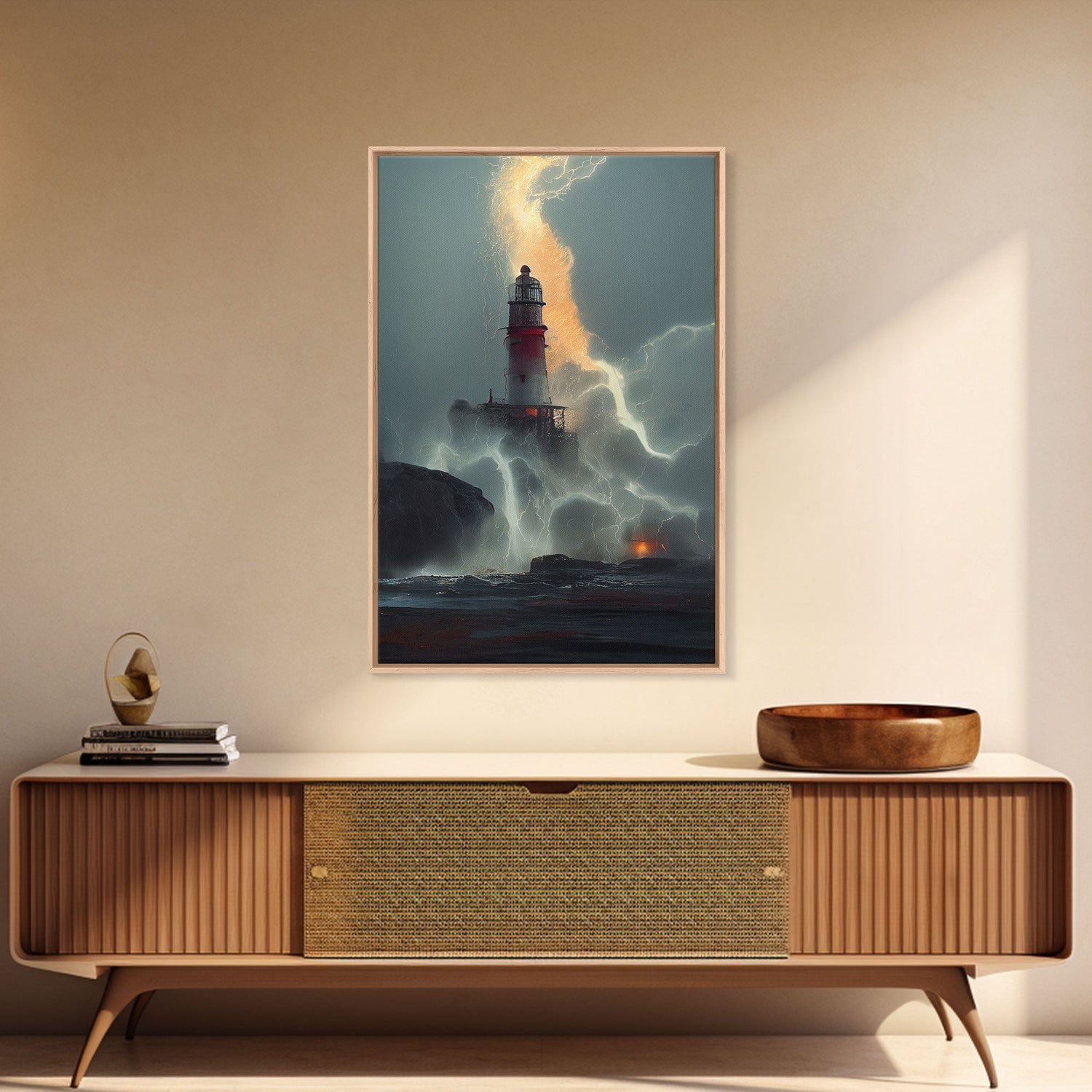 Lighthouse Oil Painting Canvas Print, Lightning striking a lighthouse during a dark stormy night, gloomy wall art