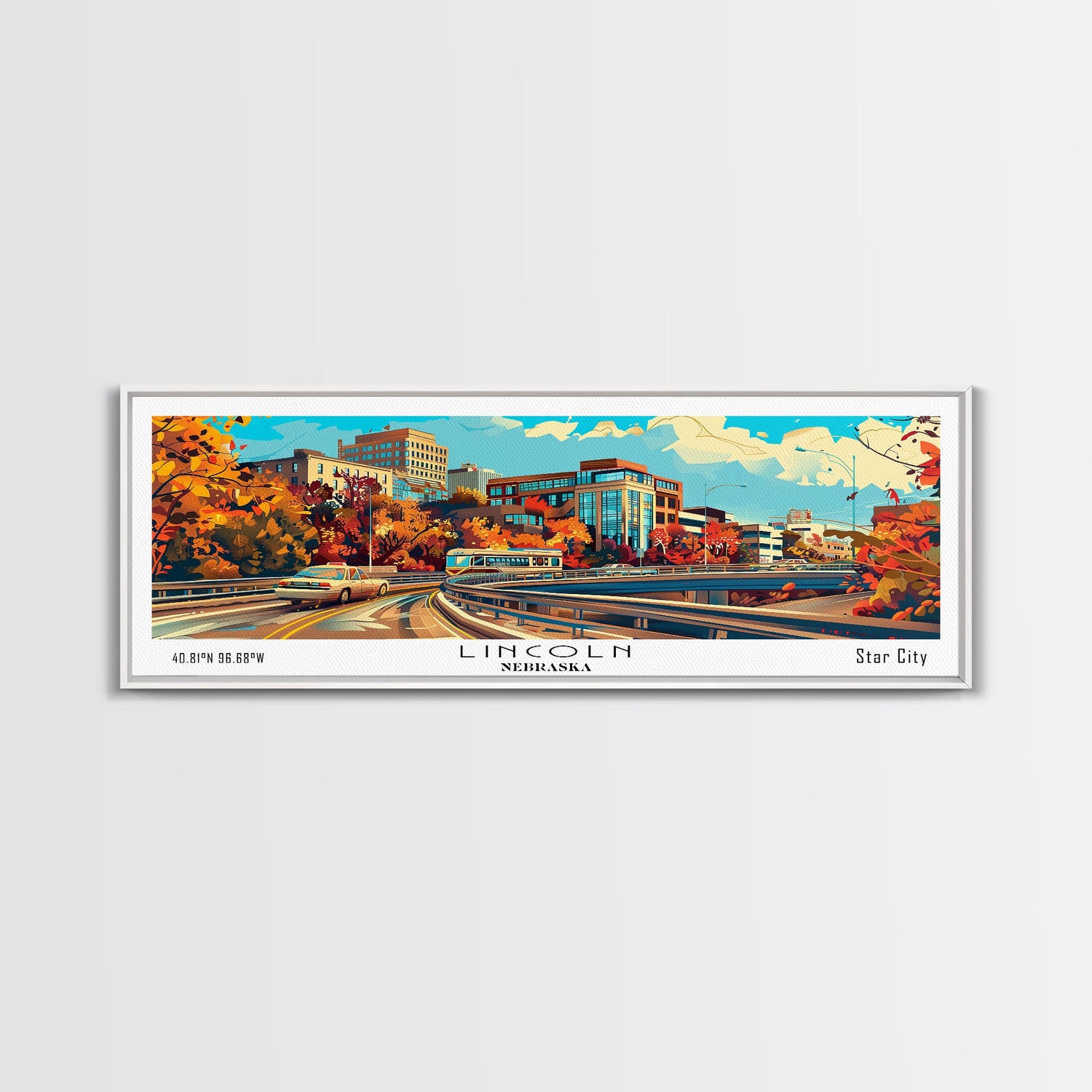 Lincoln Nebraska Panoramic Wall Art, Mid Century Modern Framed Canvas Print, Retro Pop Art Travel Poster, Home Decor