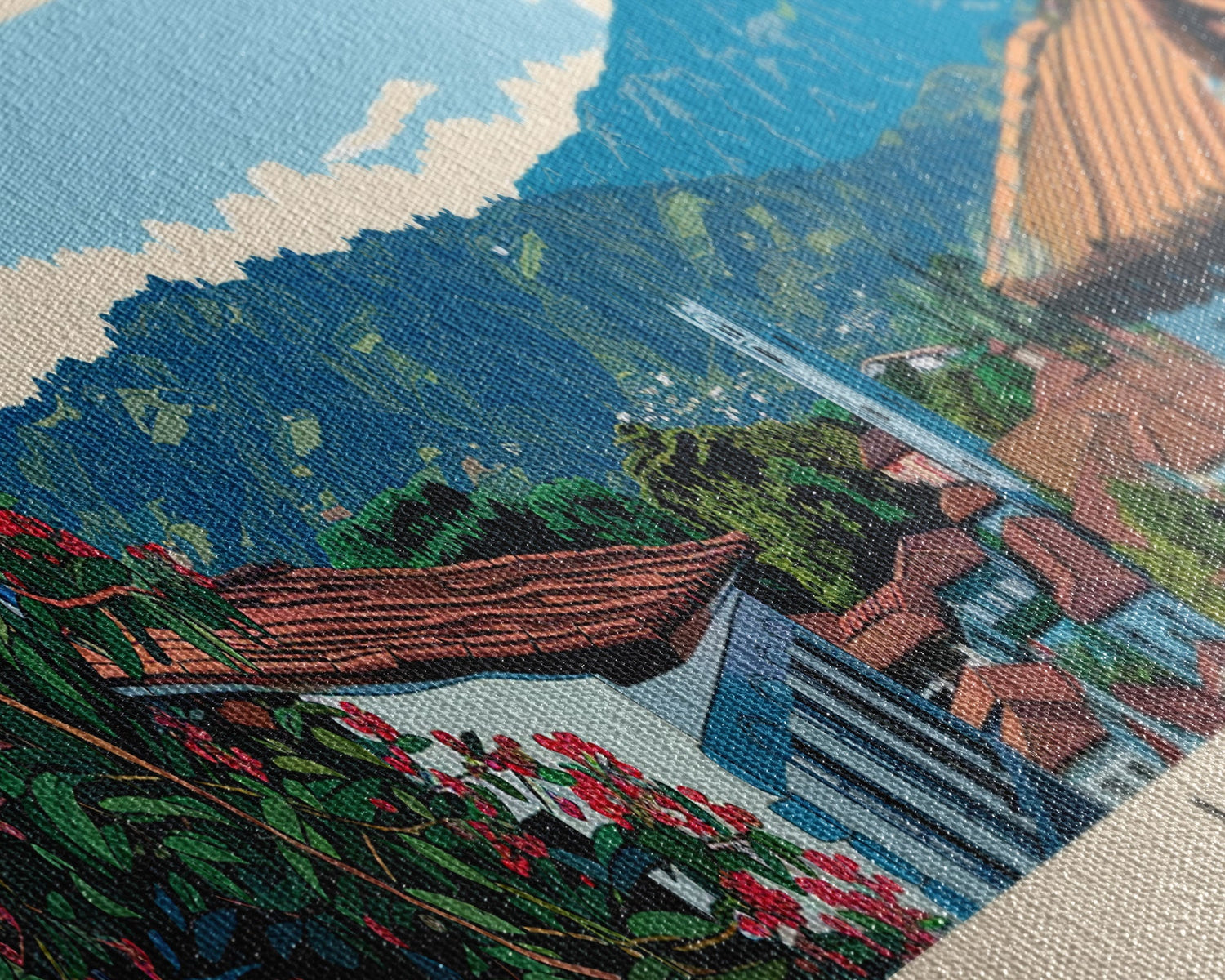 Most of our canvases are made in the USA, with the exception of canvases ordered with the light oak unstained frames, and any large canvases (24x48, 30x60, 16x48 and 20x60) ordered WITH a frame. These are temporarily made in and shipped from Europe, while we try to find a more consistent supplier in the USA.