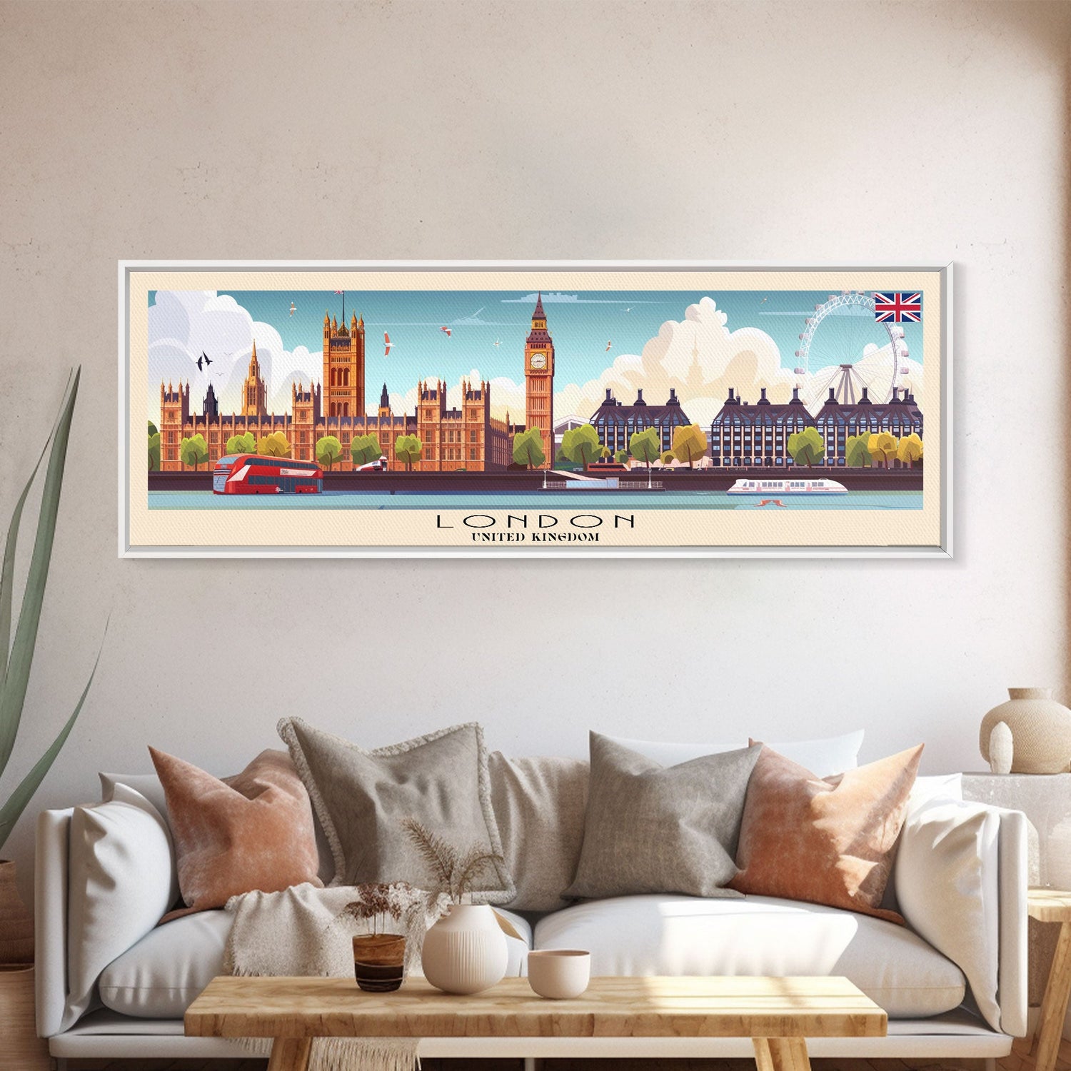 London United Kingdom Panoramic Travel Poster, Framed Canvas Print or Metal Wall Art, Travel Art, Home Decor, Panoramic Painting, Midcentury Art