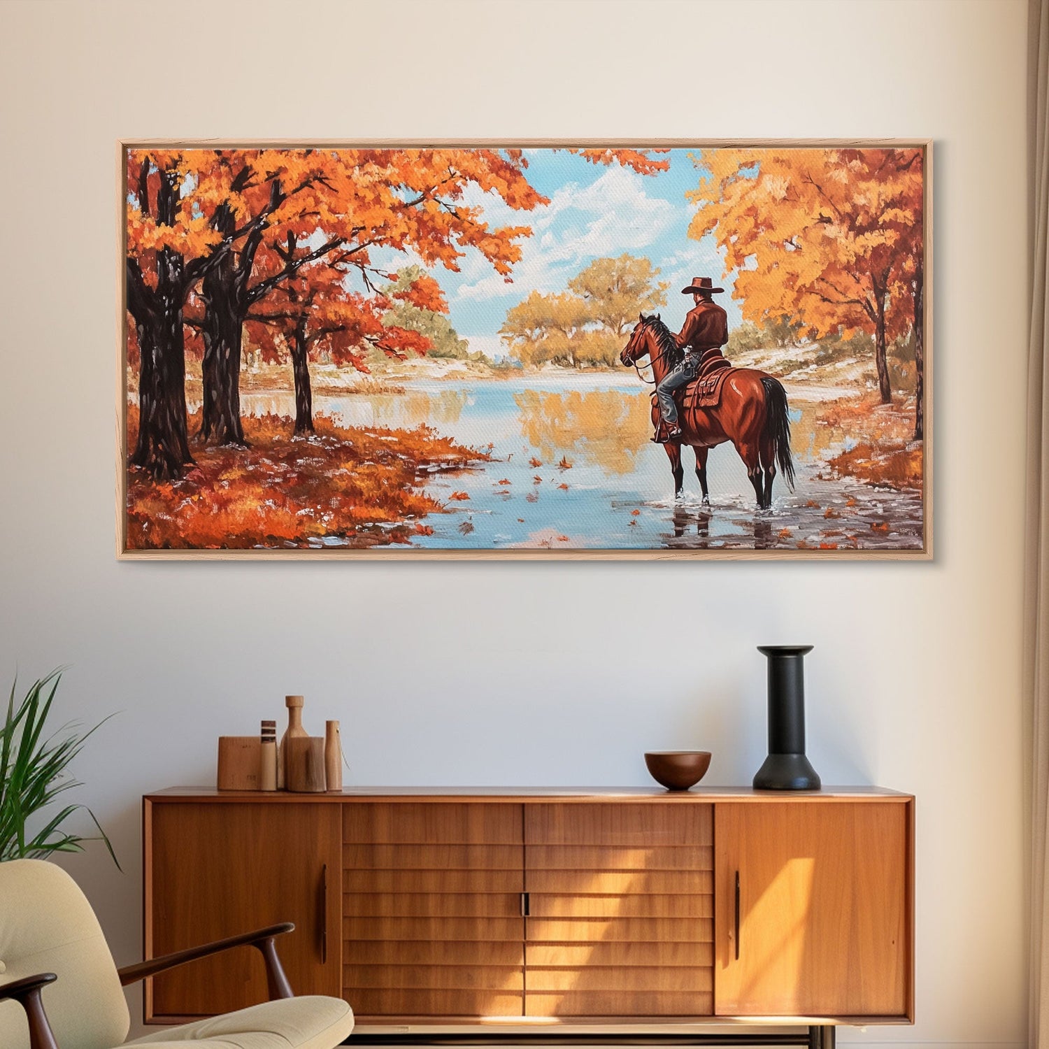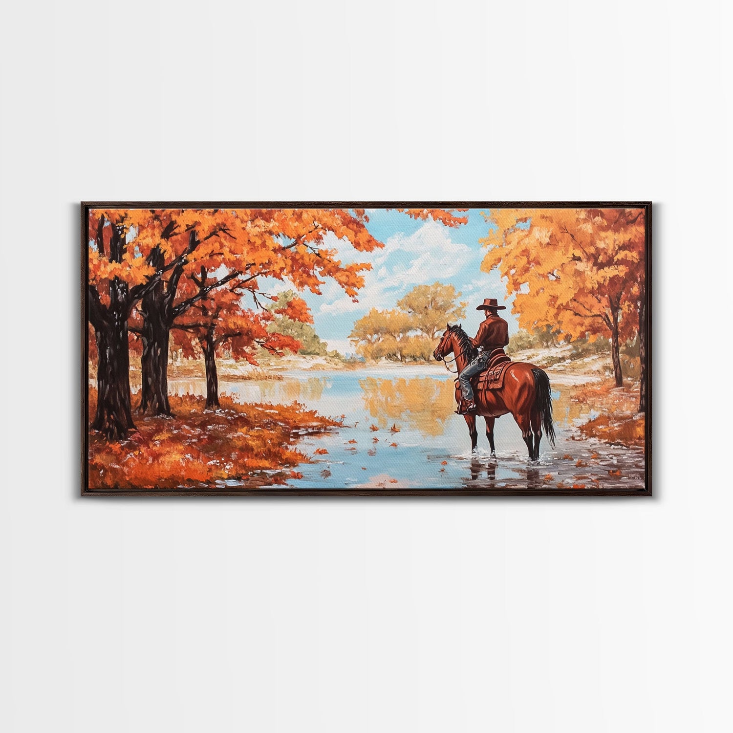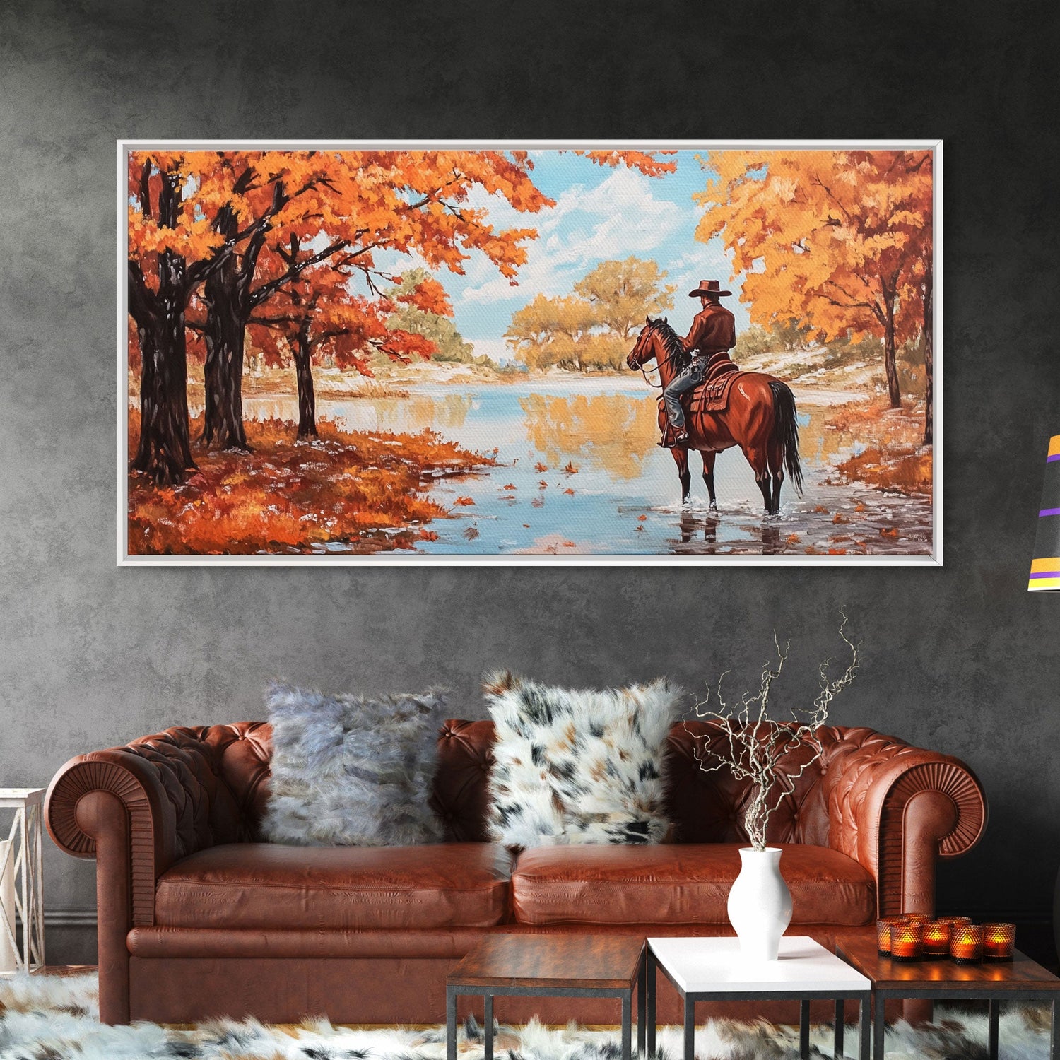 Lone cowboy by the river in black white, snow-covered valley, Framed Canvas Print, minimalist winter landscape wall art, moody western scene