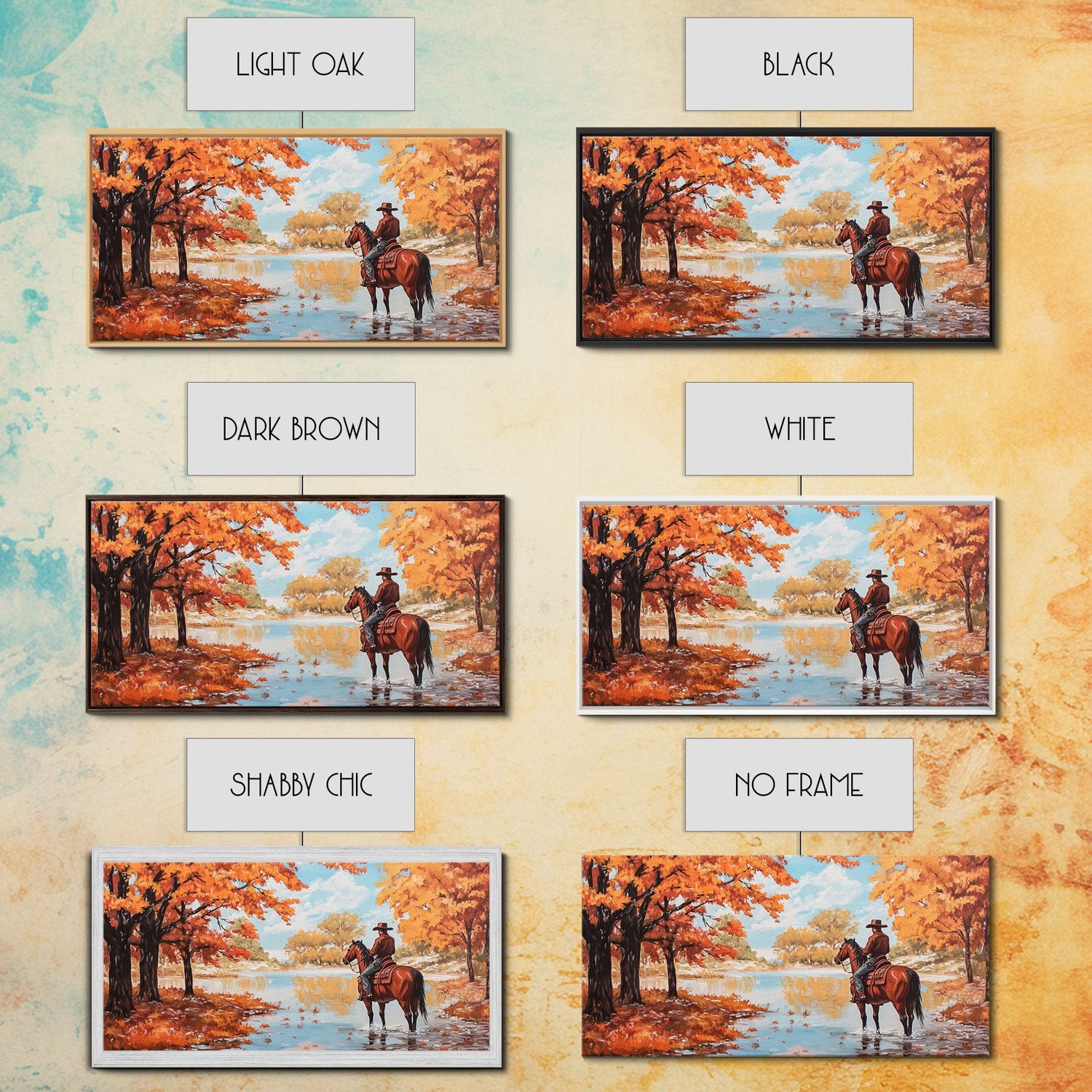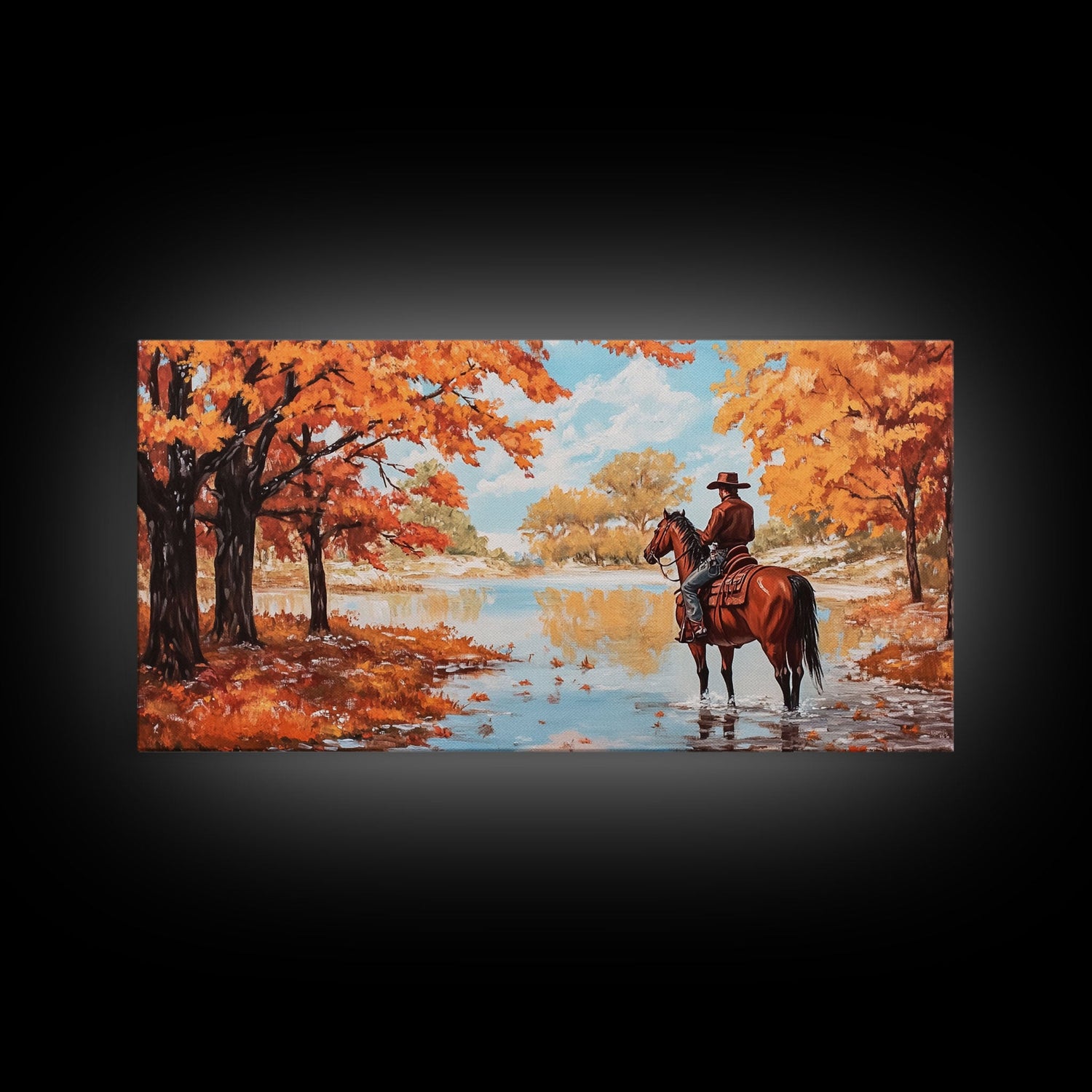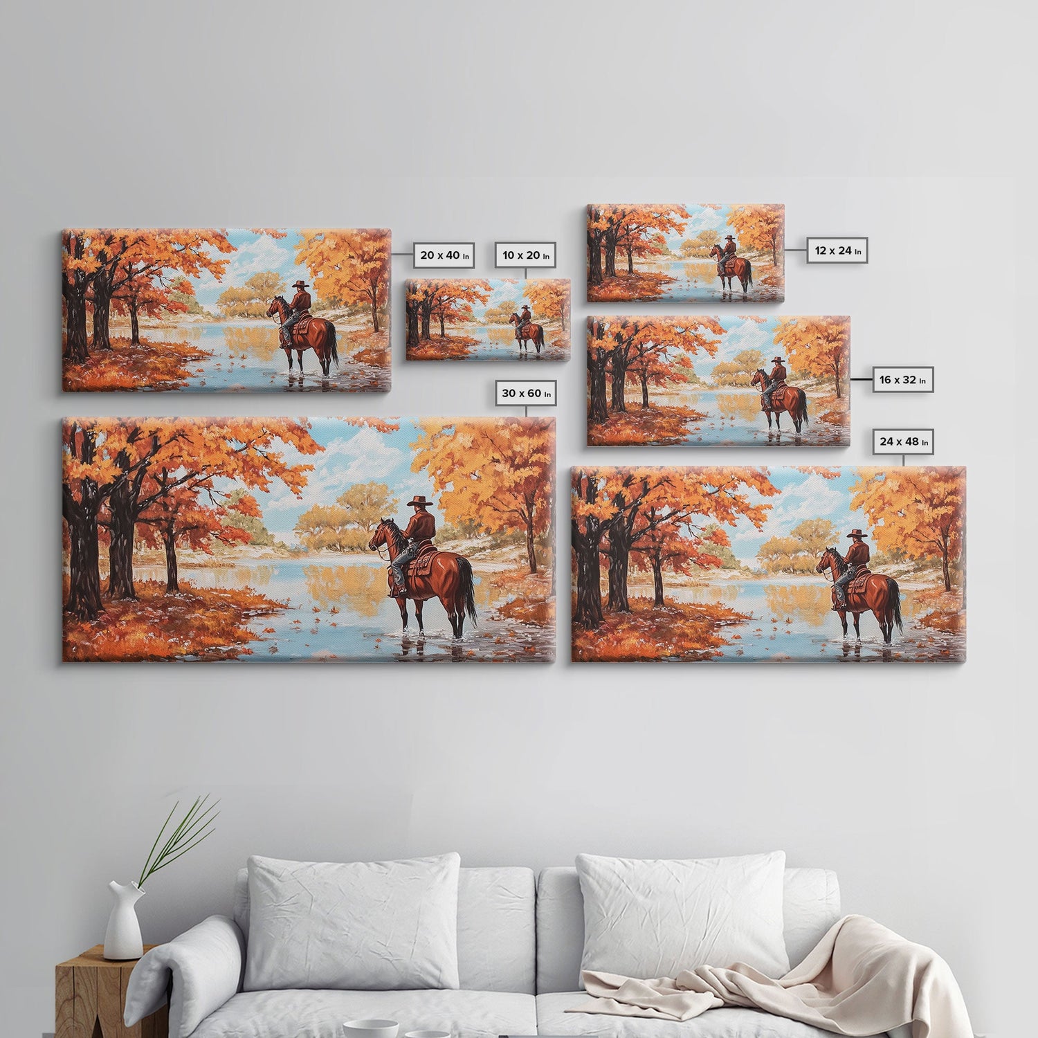 Lone cowboy by the river in black white, snow-covered valley, Framed Canvas Print, minimalist winter landscape wall art, moody western scene