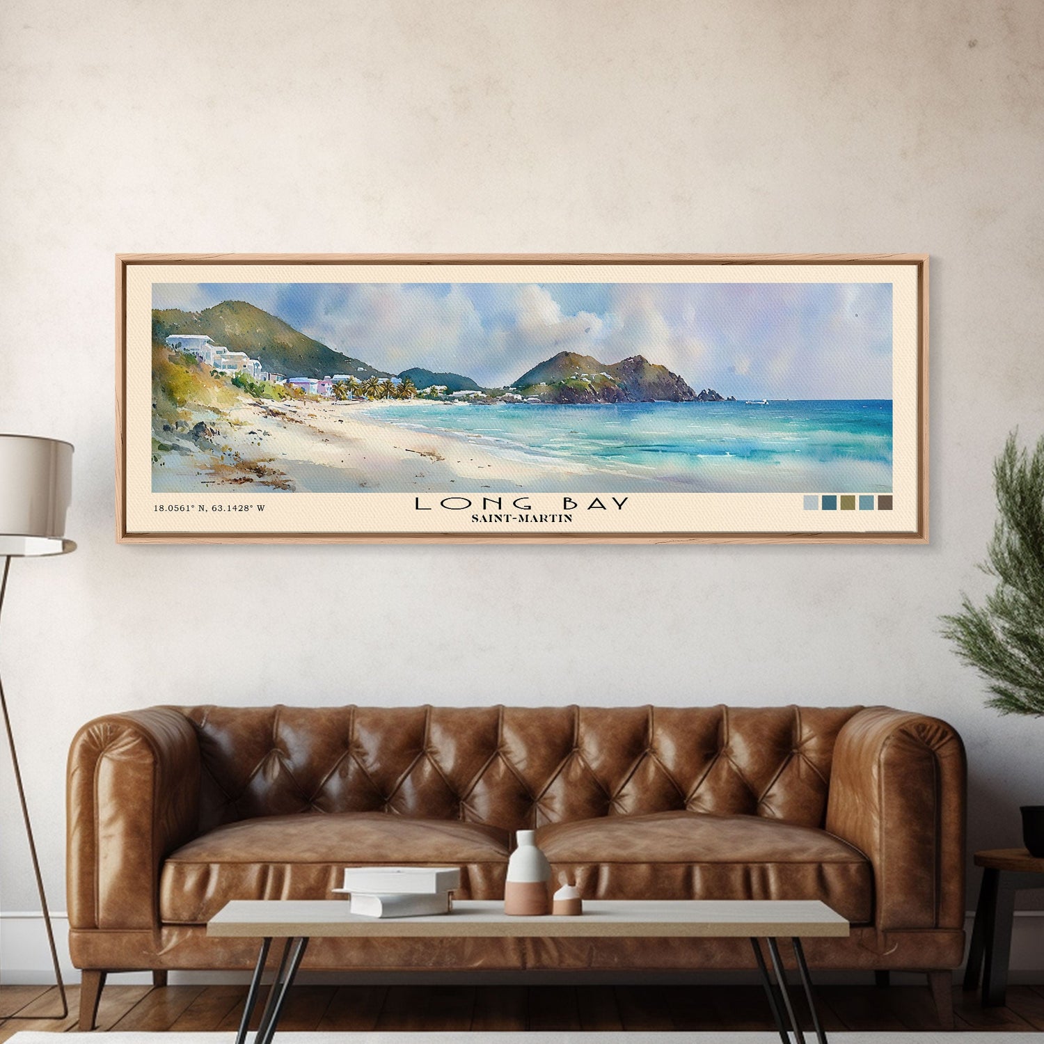 Long Bay, Saint-Martin Watercolor Print, Vacation Gift, Saint-Martin Wall Art, Beach Painting, Beach Decor, Large Wall Art, Wood Frame Art - 10x30 Inches / No Frame - Stretched Canvas Only is backordered and will ship as soon as it is back in stock.