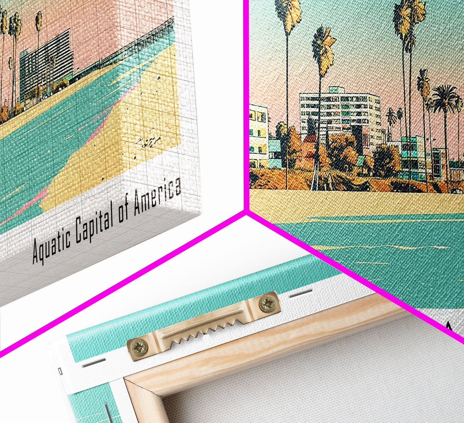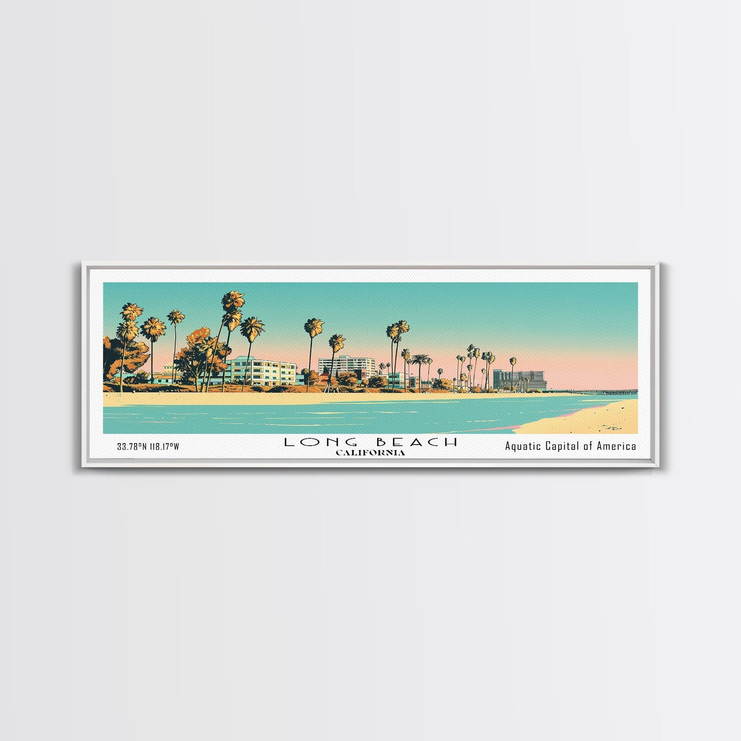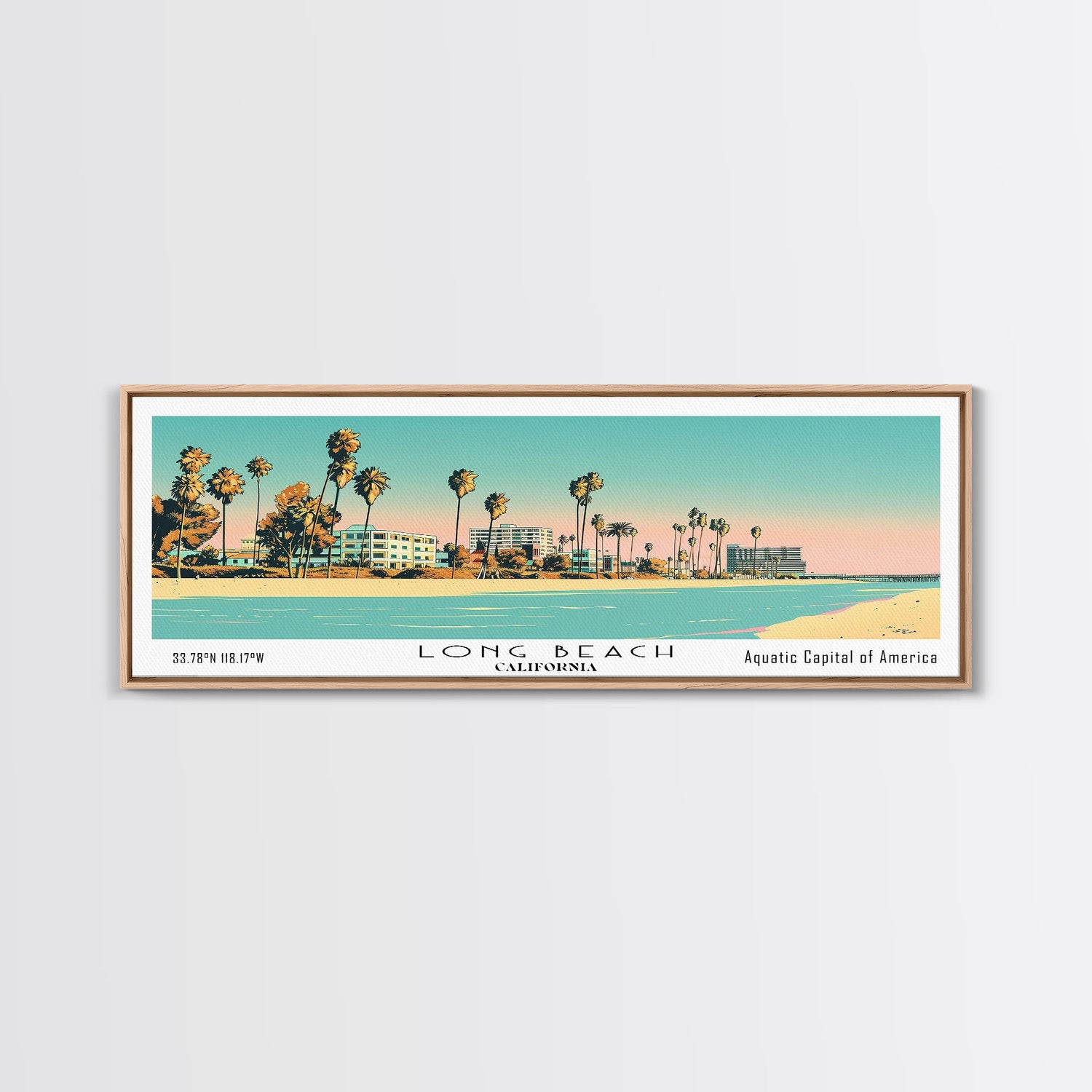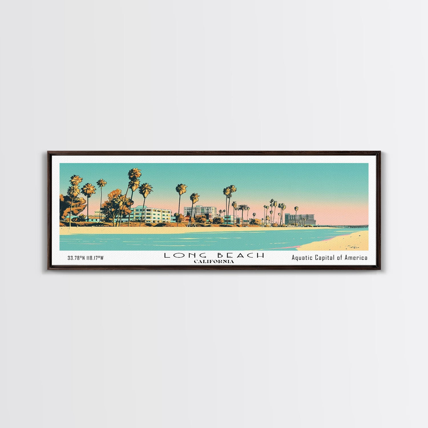 Long Beach California Panoramic Painting, Mid Century Modern Framed Canvas Print, Retro Pop Art Travel Poster, Office Decor