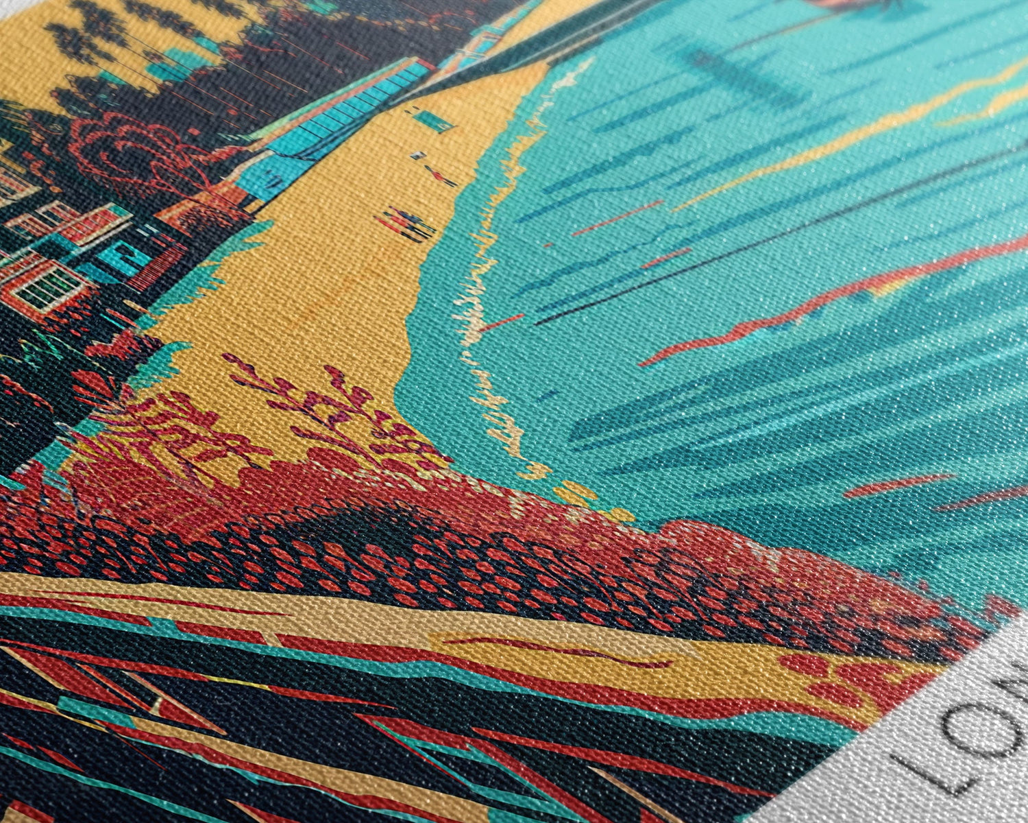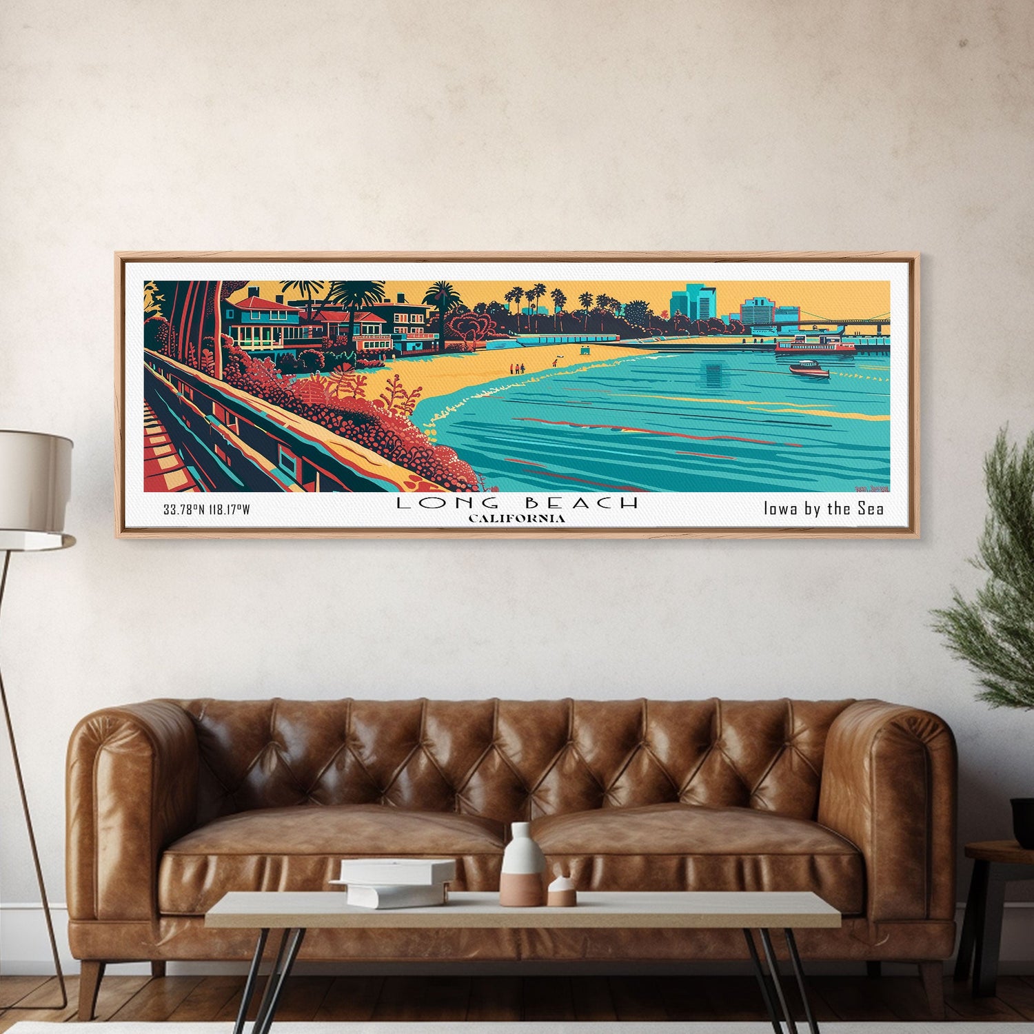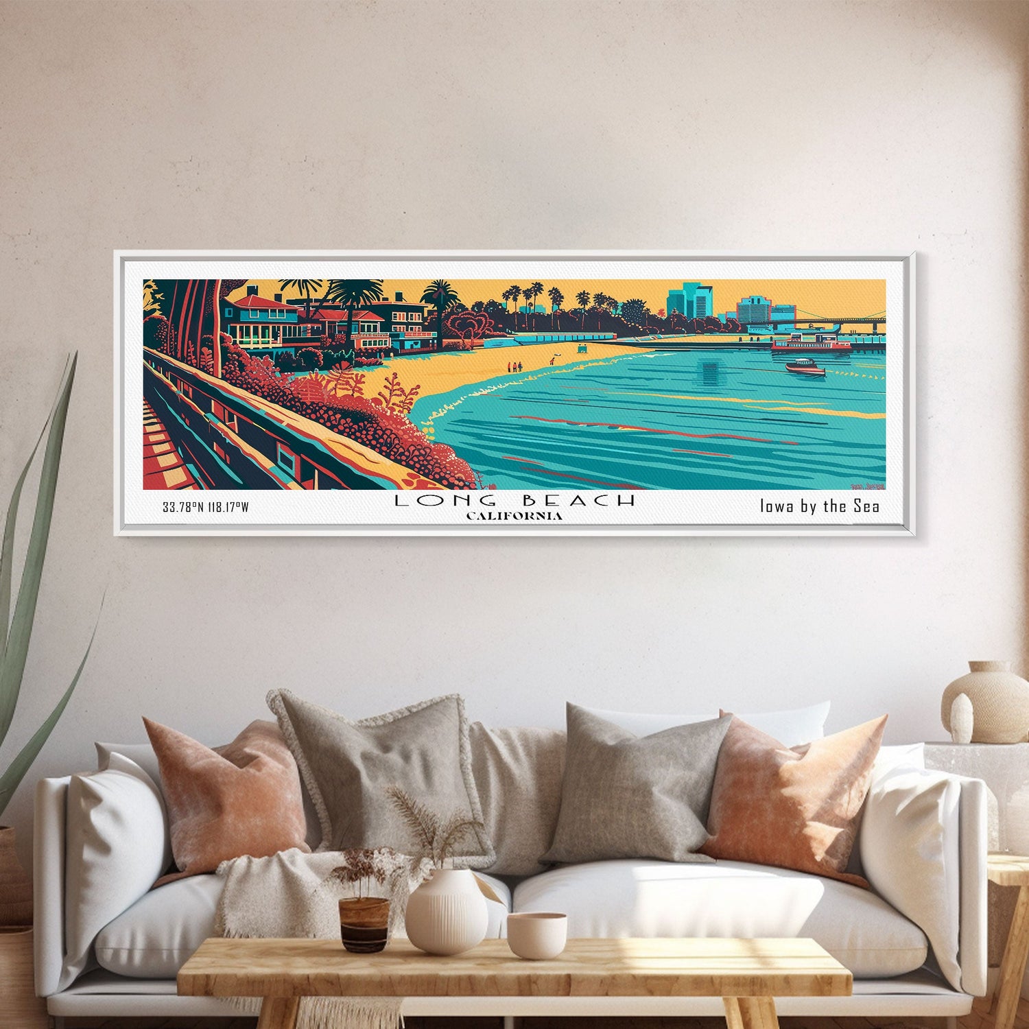 Long Beach California Panoramic Travel Poster Framed Canvas Print, Mid Century Modern Art, Pop Art Style, Wall Art, Home Decor, Wall Hanging