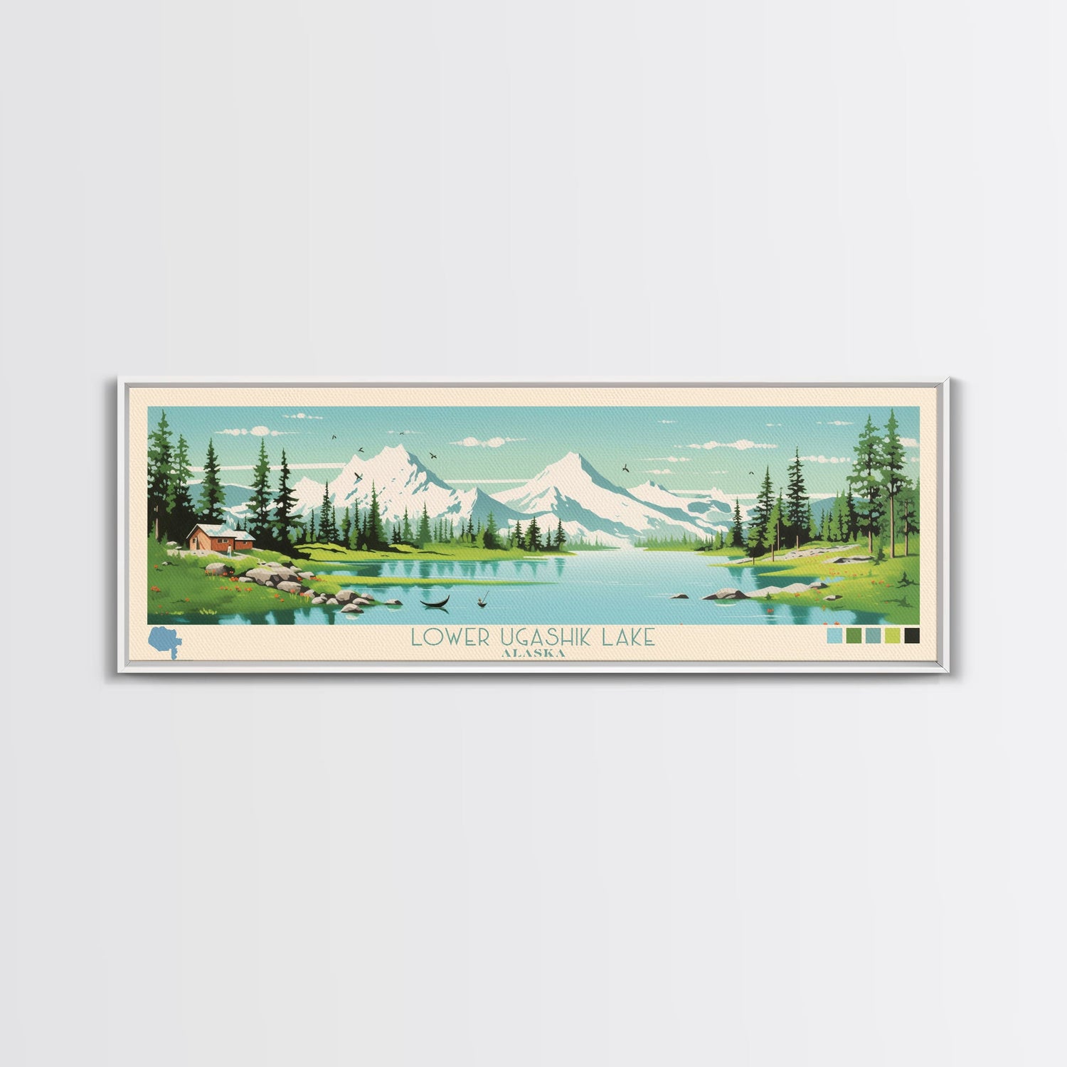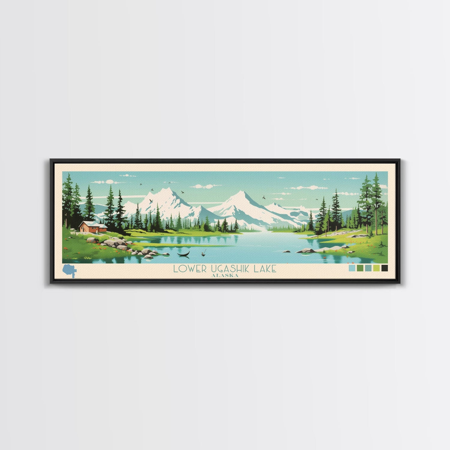 Lower Ugashik Lake, Alaska Panoramic Wall Art Framed Canvas Print, Midcentury Modern, Pop Art, Home Decor, Travel Poster, Bedroom Art