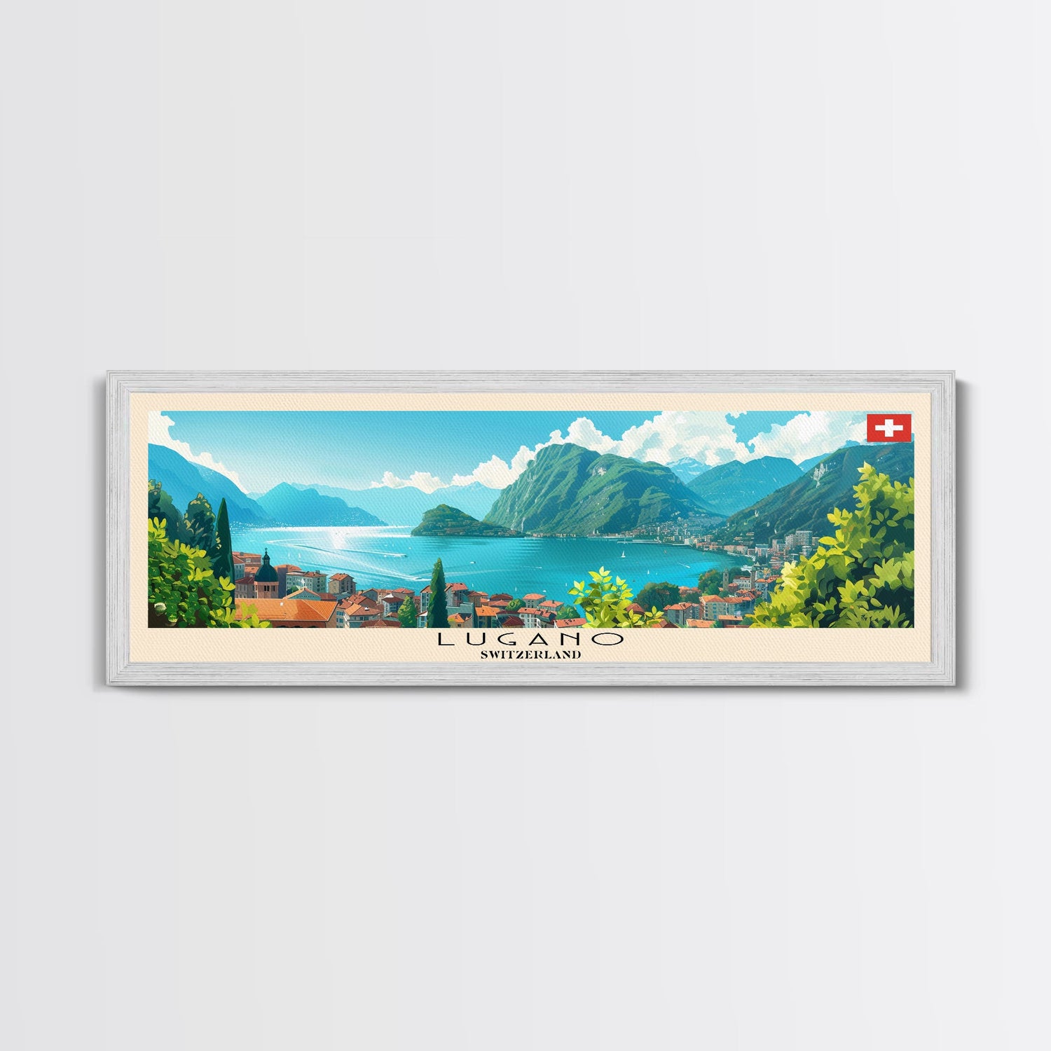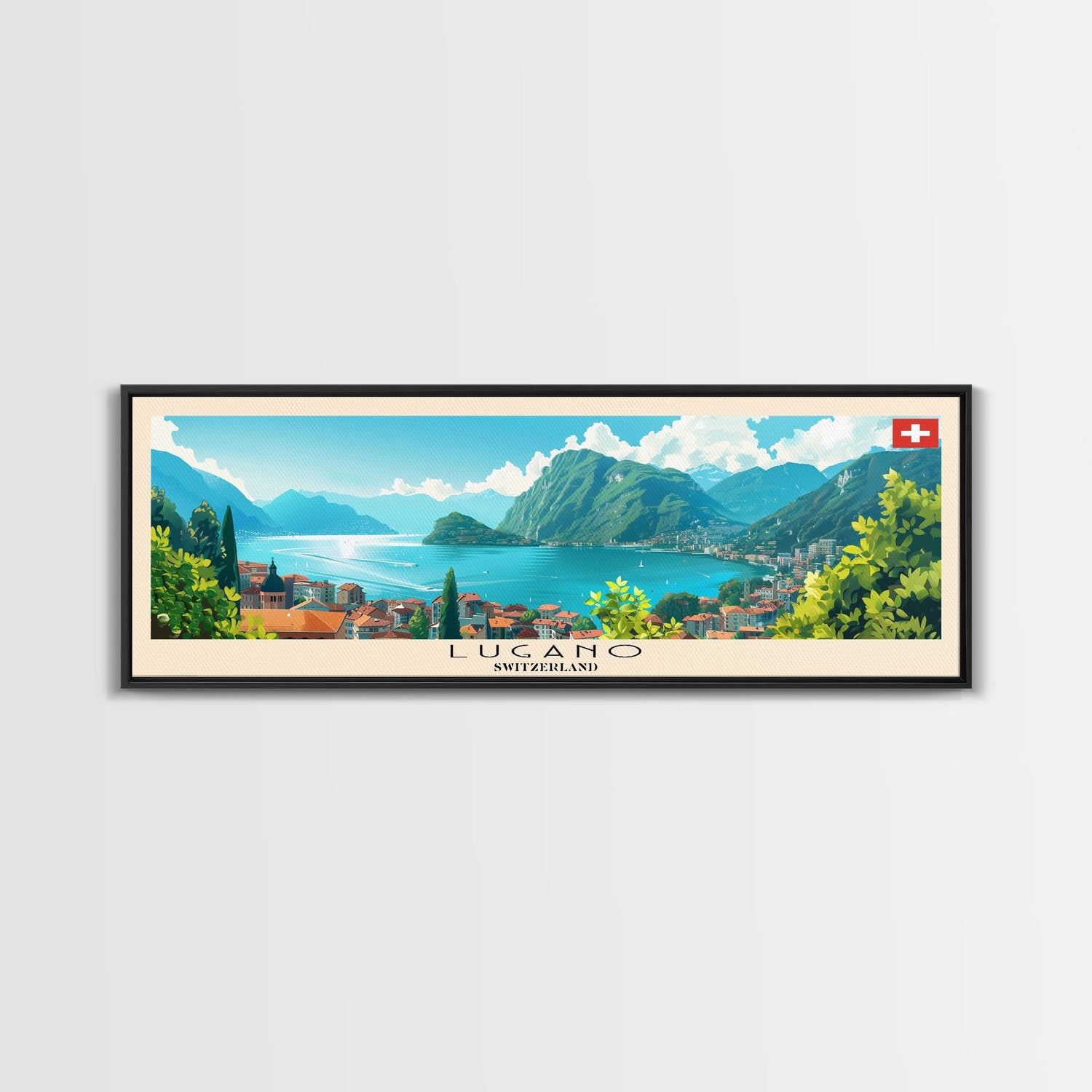 Lugano Switzerland Panoramic Travel Poster, Framed Canvas Print or Metal Wall Art, Travel Art, Home Decor, Panoramic Painting, Midcentury Art
