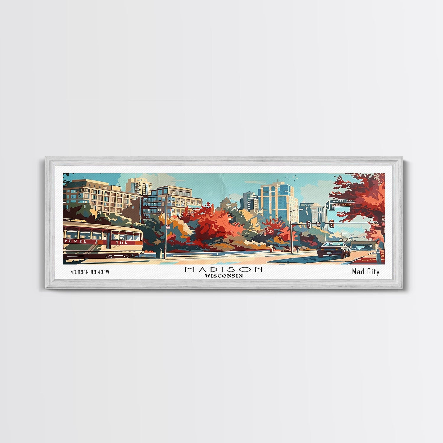 Madison Wisconsin Panoramic Painting, Mid Century Modern Framed Canvas Print, Retro Pop Art Travel Poster, Wall Art, Home Decor, Office Wall Art, Living Room Decor
