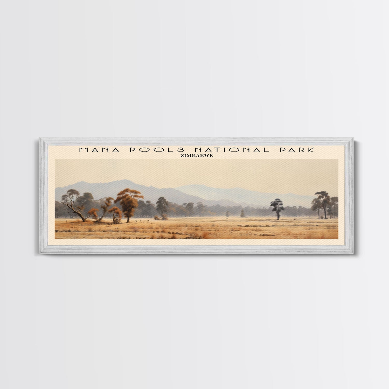 Mana Pools National Park COUNTRY Travel Poster Print, Framed Canvas Print, COUNTRY Travel Art, Wood Framed Art, Wall Hanging, Home Decor - 10x30 Inches / No Frame - Stretched Canvas Only is backordered and will ship as soon as it is back in stock.
