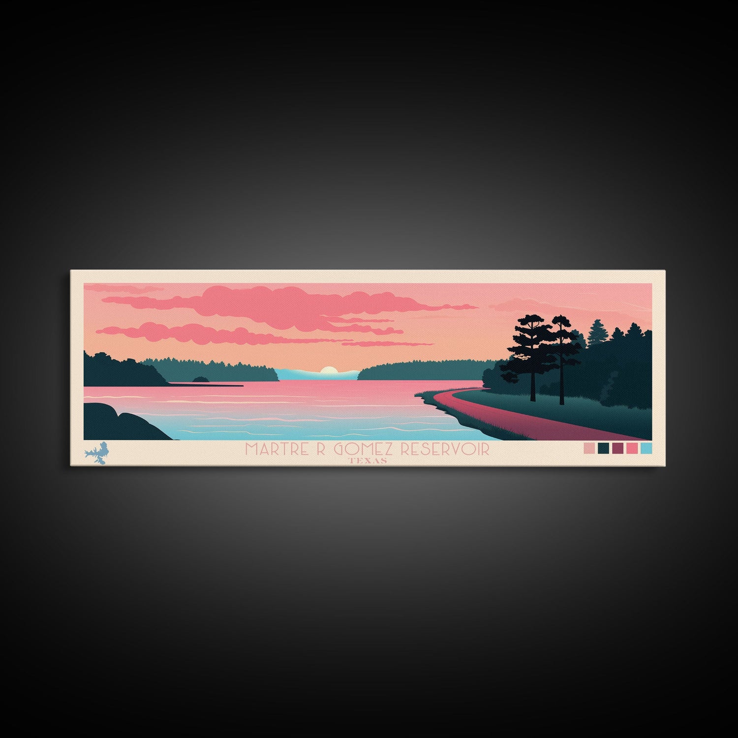 Martre R Gomez Reservoir, Texas Panoramic Wall Art Framed Canvas Print, Midcentury Modern, Pop Art, Home Decor, Travel Poster, Bedroom Art