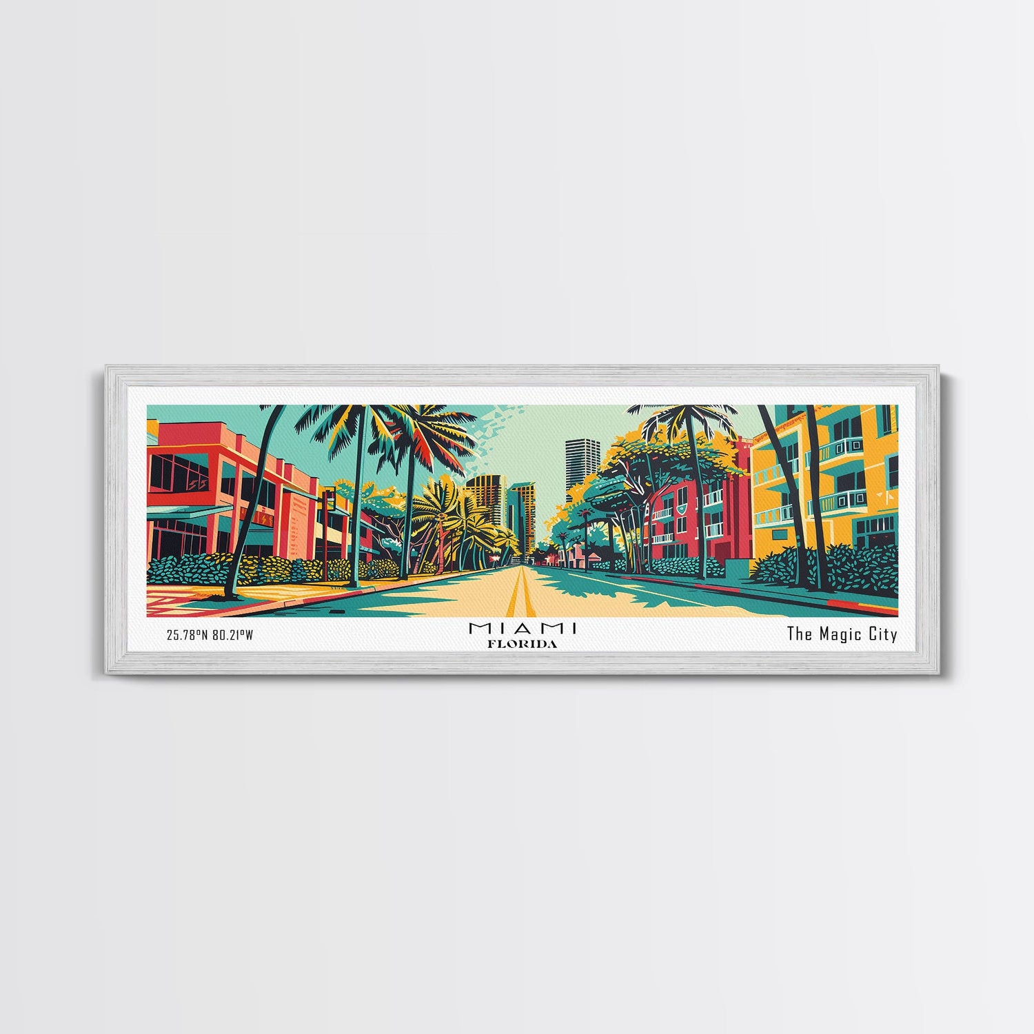 Miami Florida Panoramic Painting Framed Canvas Print, Travel Poster, Mid Century Modern Art, Pop Art Style, Wall Decor, Office Wall Art - 10x30 Inches / No Frame - Stretched Canvas Only is backordered and will ship as soon as it is back in stock.