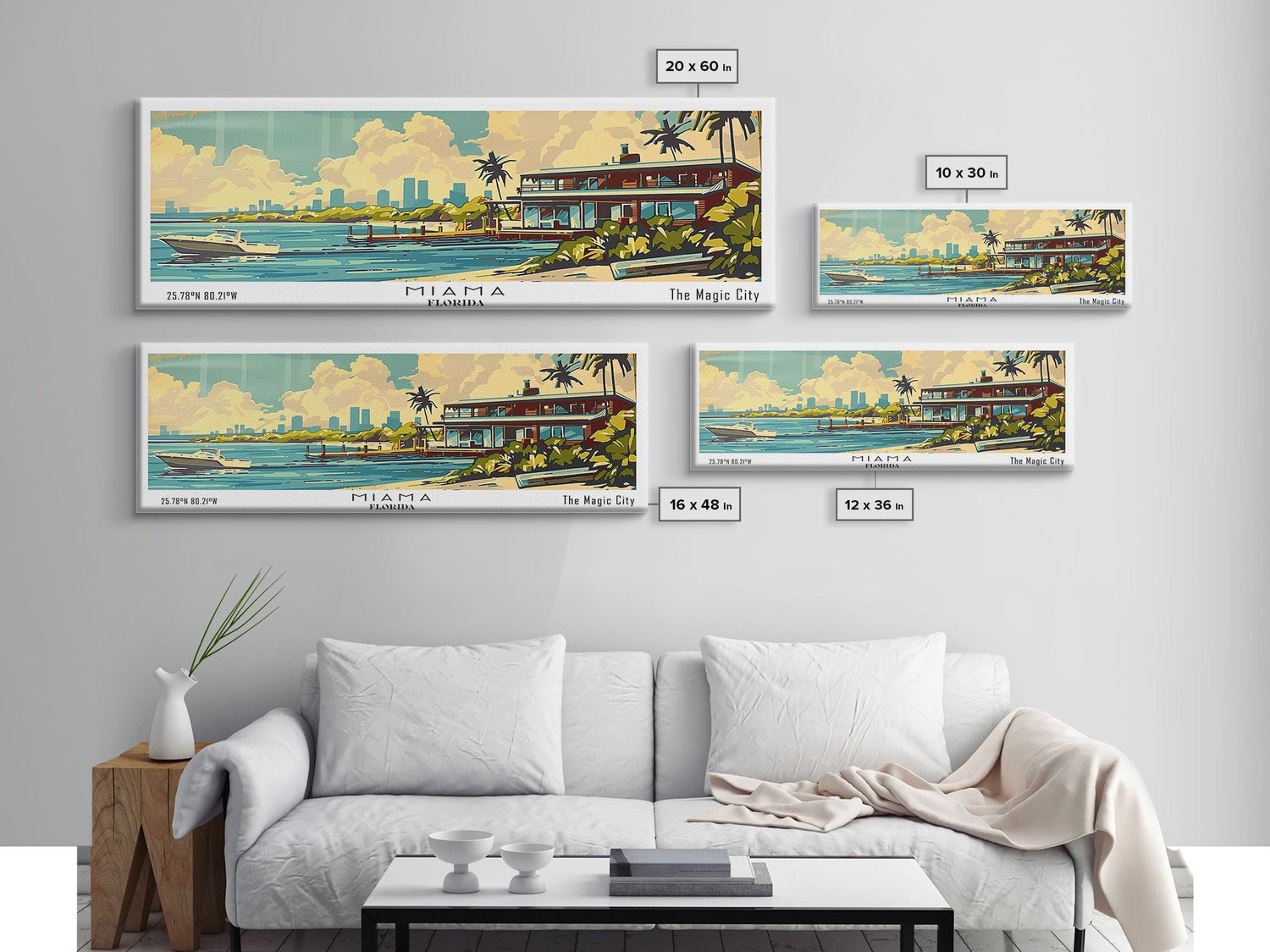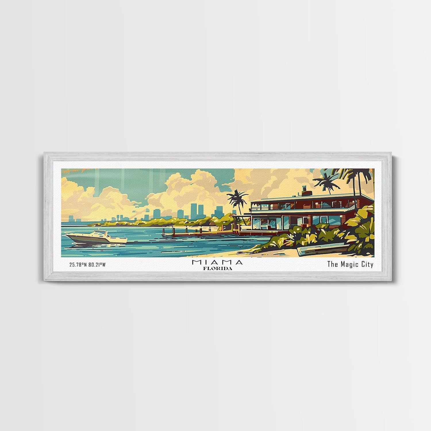 Miami Florida Panoramic Wall Art, Mid Century Modern Framed Canvas Print, Retro Pop Art Travel Poster, Home Decor, Office Art, Living Room Wall Hanging, Gift Idea
