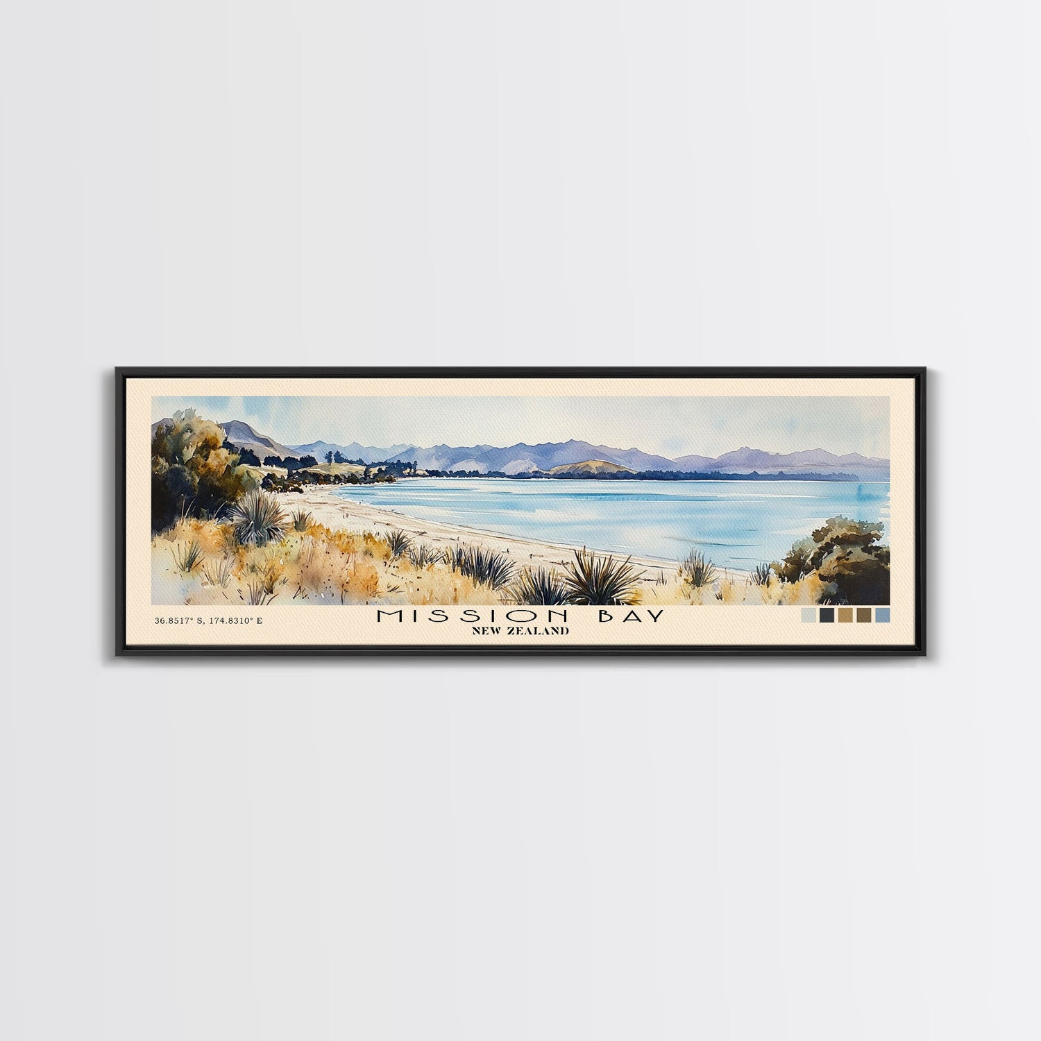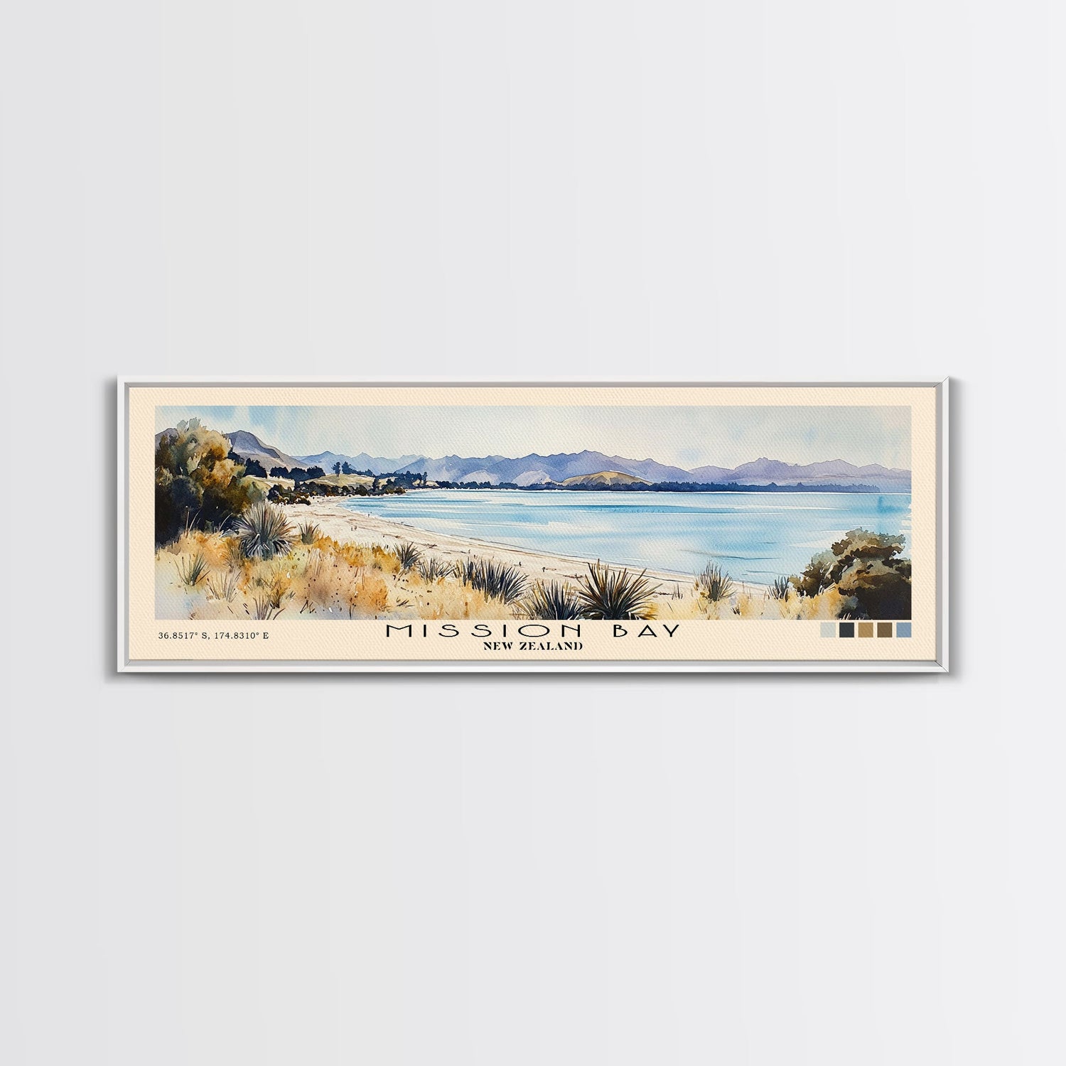 Mission Bay, New Zealand Watercolor Beach Print, Vacation Gift, New Zealand Wall Art, Beach Painting, Beach Decor, Beach Painting - 10x30 Inches / No Frame - Stretched Canvas Only is backordered and will ship as soon as it is back in stock.