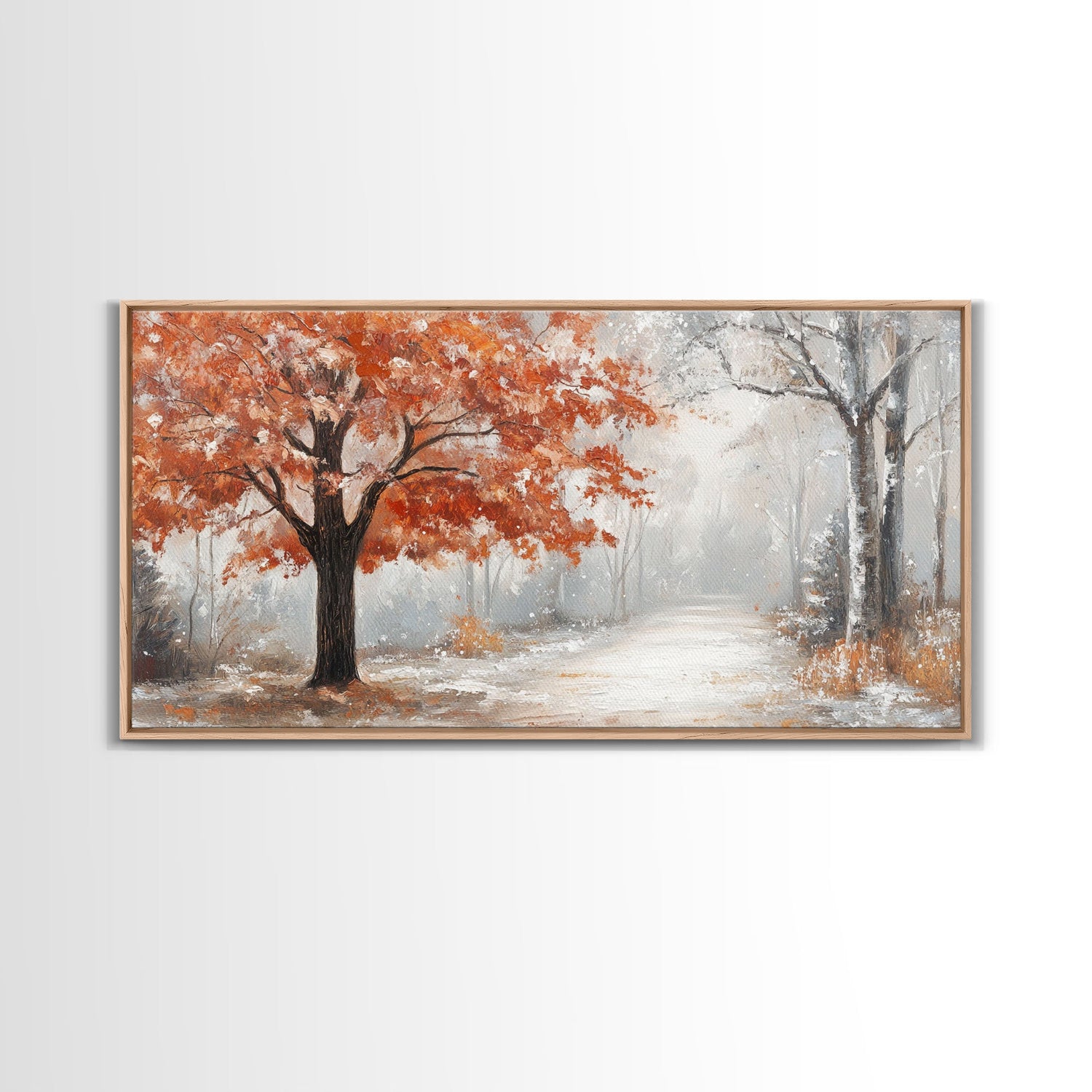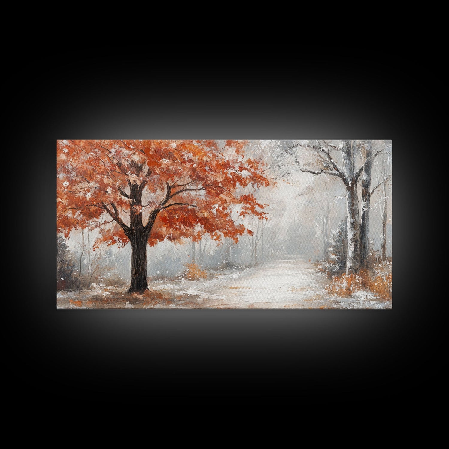 Misty Forest Path with Orange Leaves Framed Canvas Print, Ideal Autumn Decor or Fall Wall Art for Cozy Home Interiors - 10x20 Inches / No Frame - Stretched Canvas Only is backordered and will ship as soon as it is back in stock.