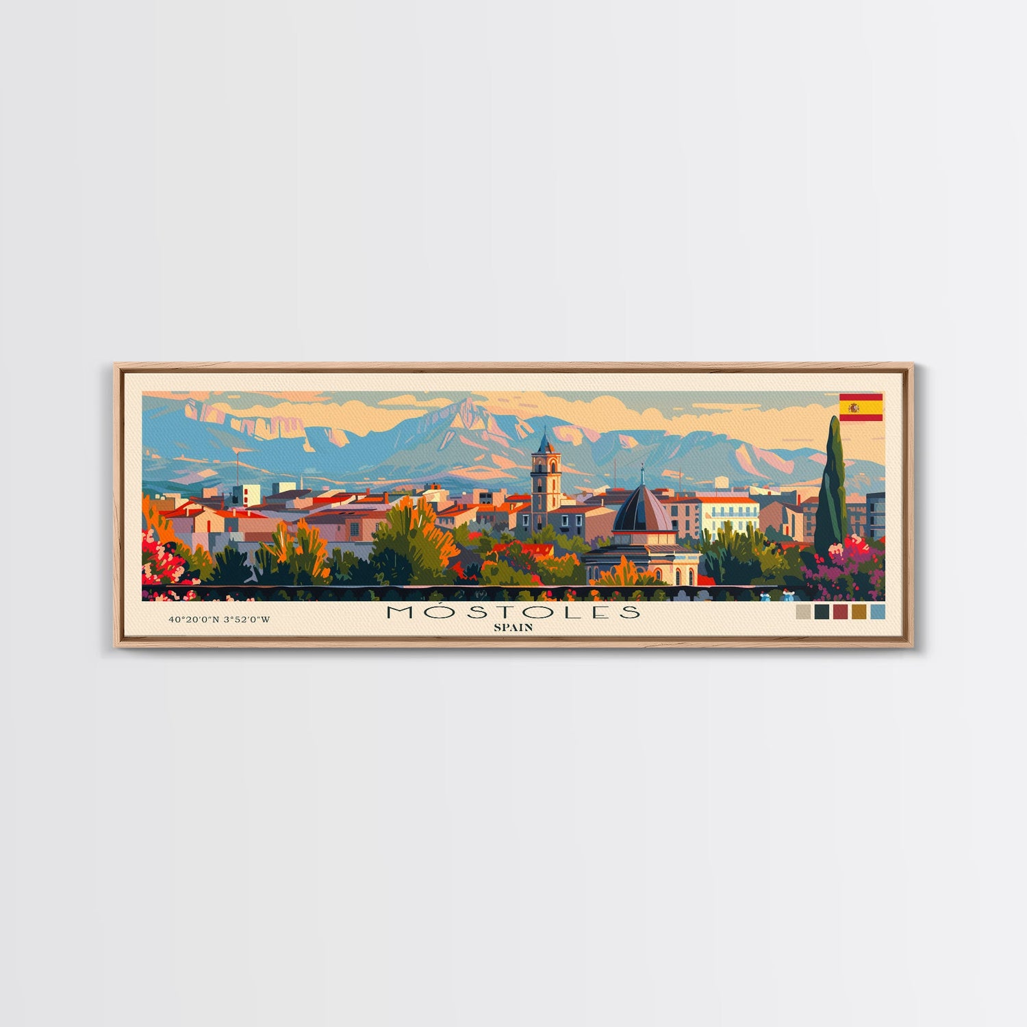 Mostoles Spain Panoramic Travel Poster, Framed Canvas Print or Metal Wall Art, Travel Art, Home Decor, Panoramic Painting, Midcentury Art