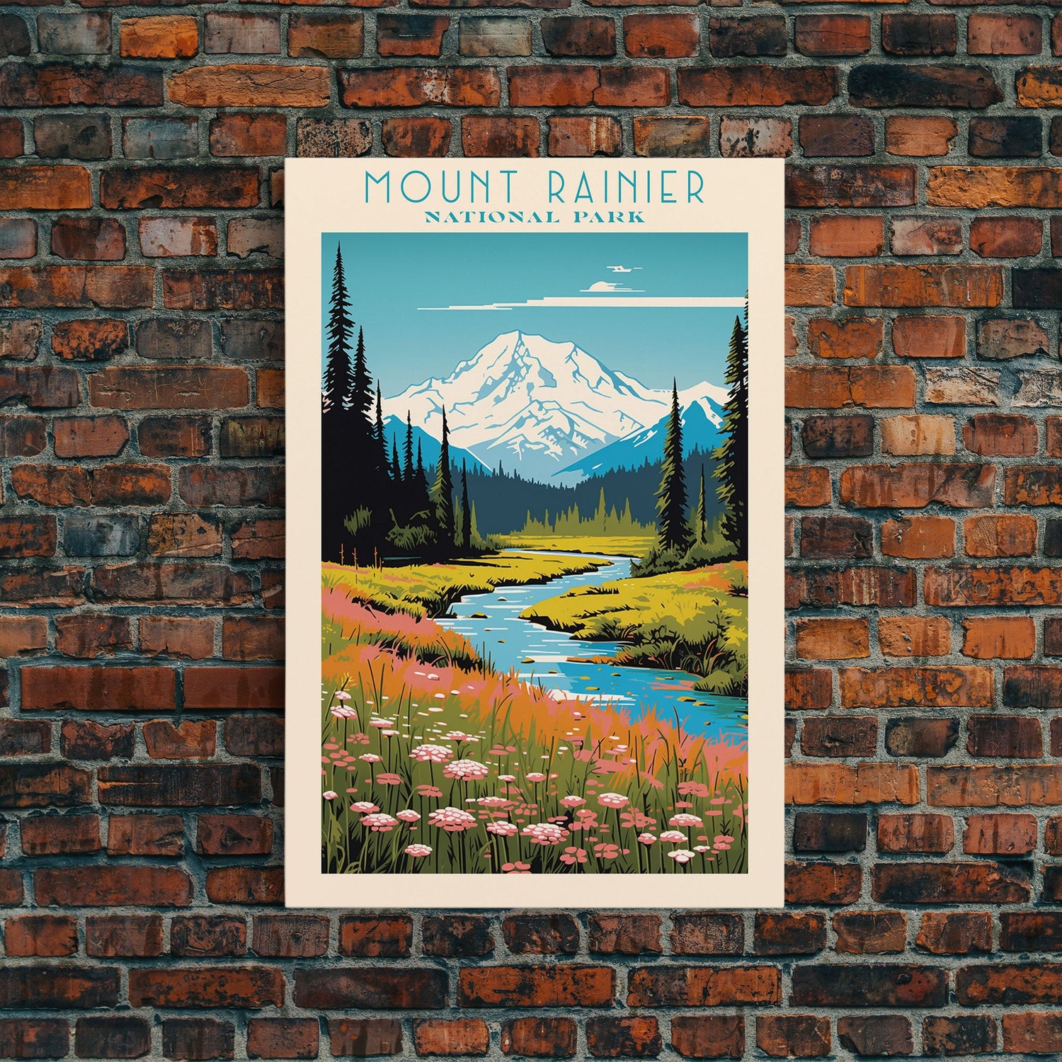 Mount Rainier National Park, Washington Travel Art, National Park Print, Minimalist Travel Art, Midcentury Modern Retro Style Landscape - 8x12 Inches / No Frame - Stretched Canvas Only is backordered and will ship as soon as it is back in stock.