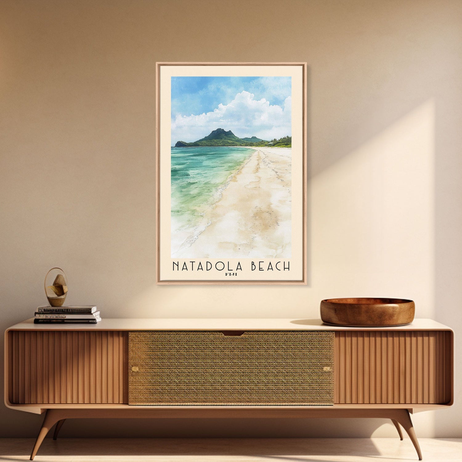 Natadola Beach, Fiji Watercolor Print, Vacation Gift, Fiji Wall Art, Beach Painting, Beach Decor, Large Wall Art, Wood Frame Art