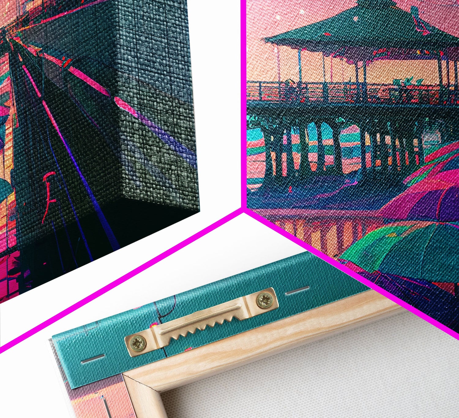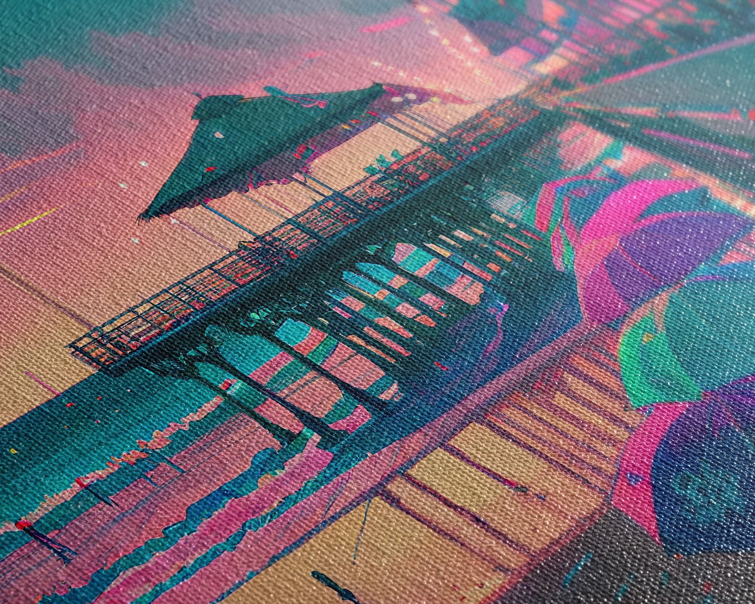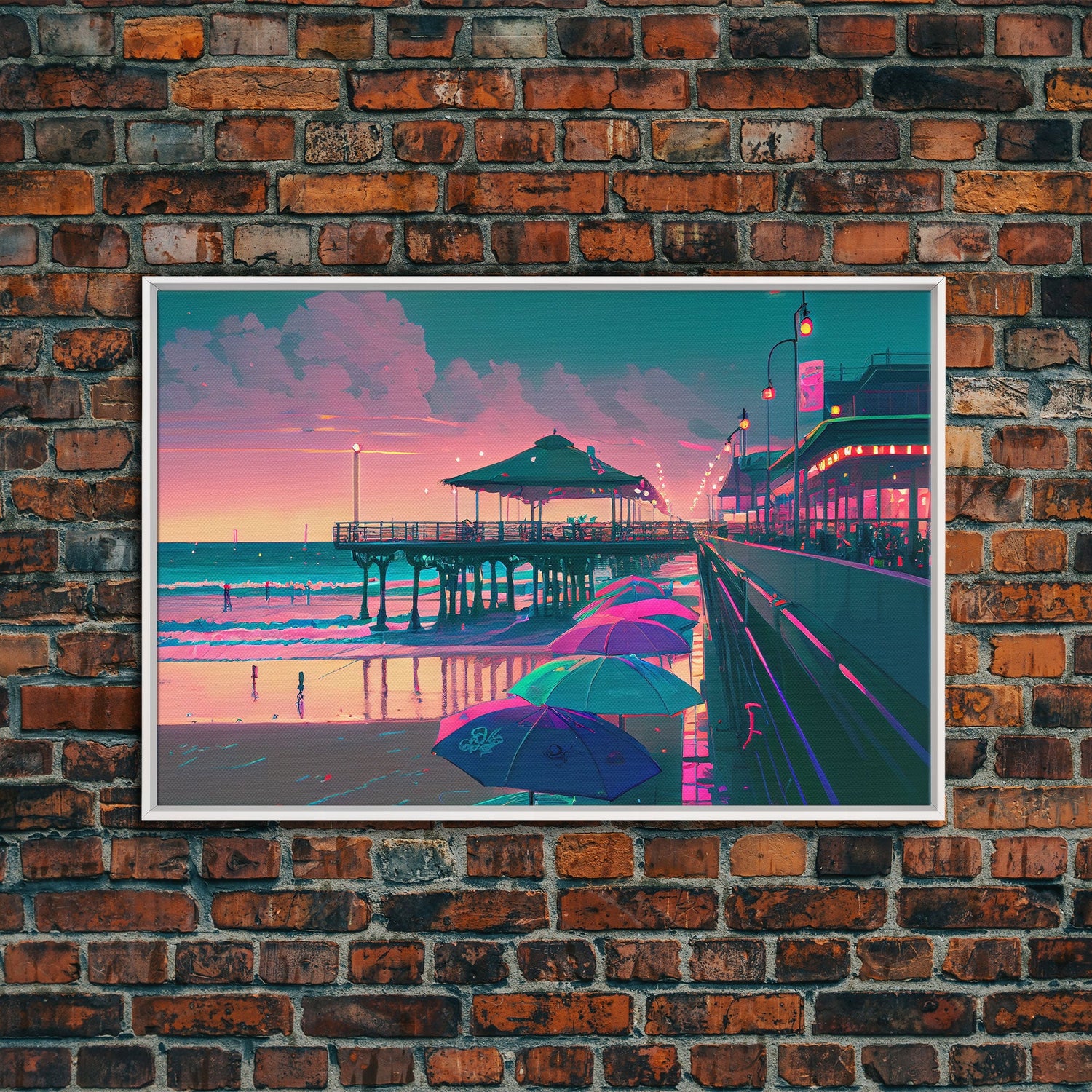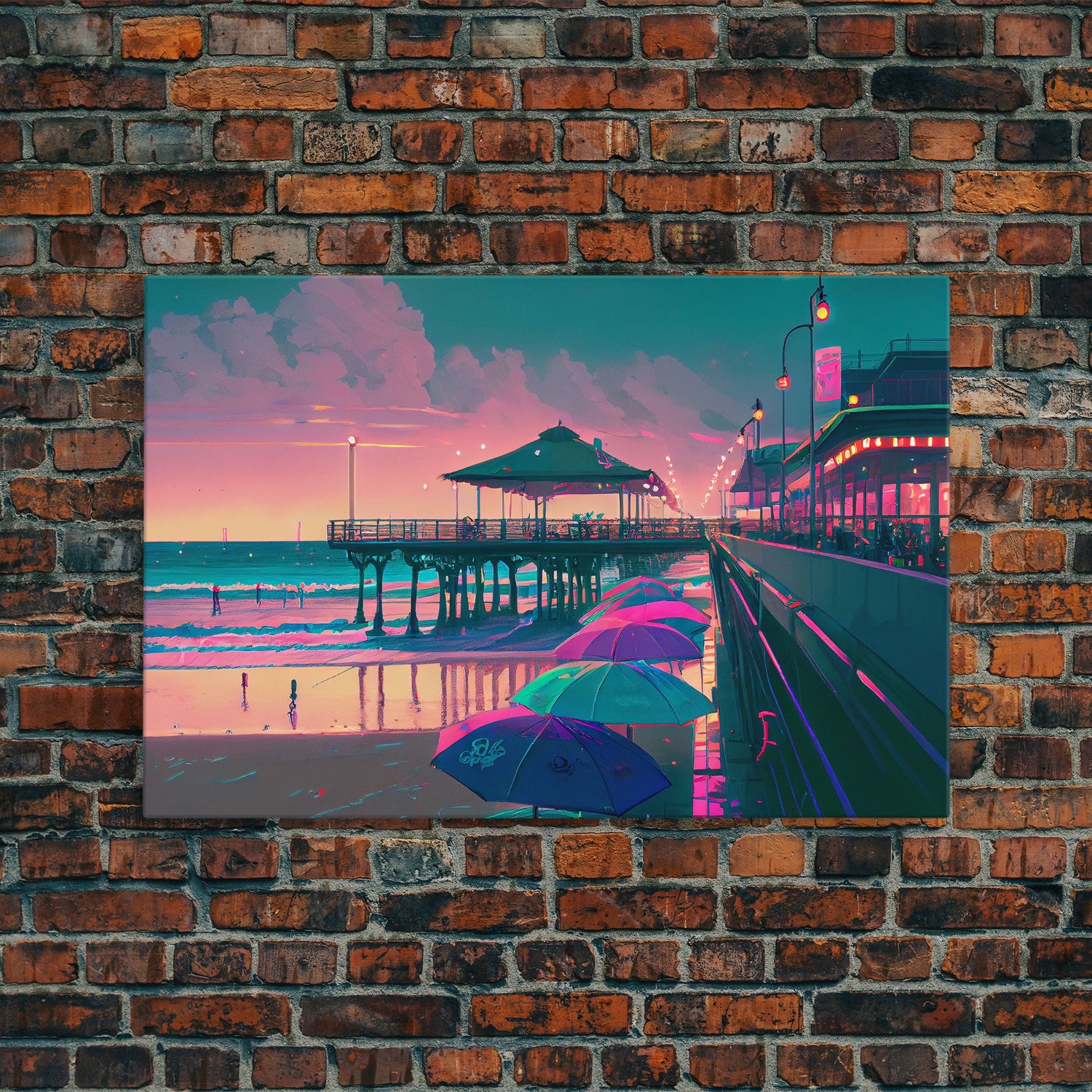 Neon Beach, cool beach house wall decor, synthwave pier and boardwalk, framed canvas print, framed wall art