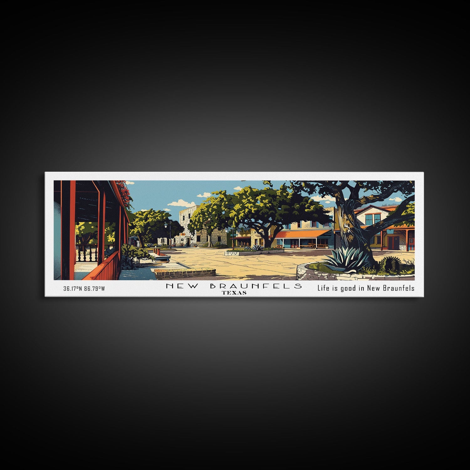 New Braunfels Texas Panoramic Painting, Mid Century Modern Framed Canvas Print, Retro Pop Art Travel Poster, Home Wall Art