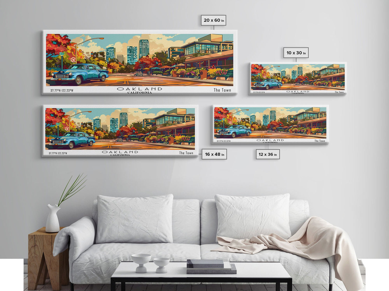 Oakland California Panoramic Wall Art, Pop Art Framed Canvas Print, Mid Century Modern Home Decor, Retro Style Travel Poster - 10x30 Inches / No Frame - Stretched Canvas Only is backordered and will ship as soon as it is back in stock.
