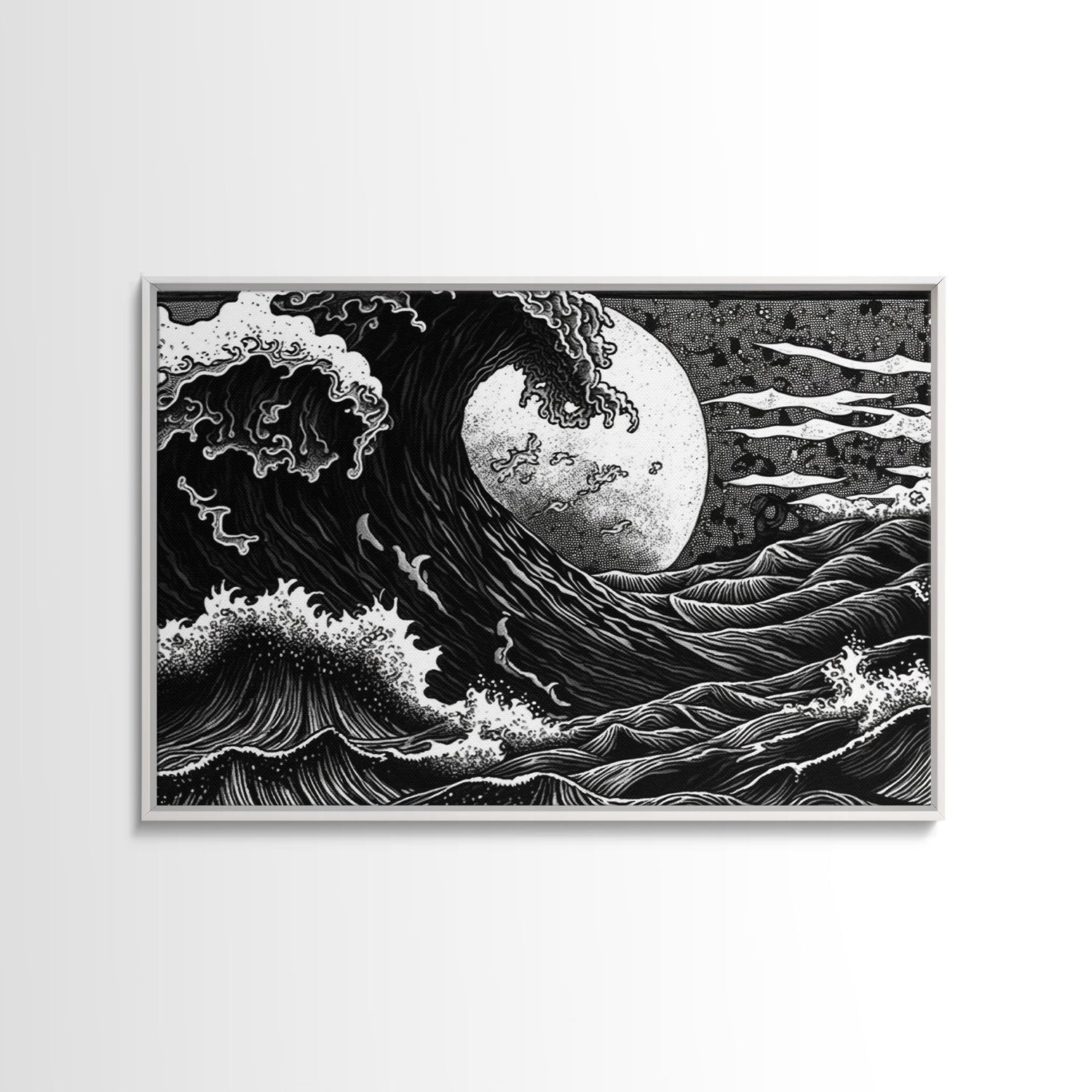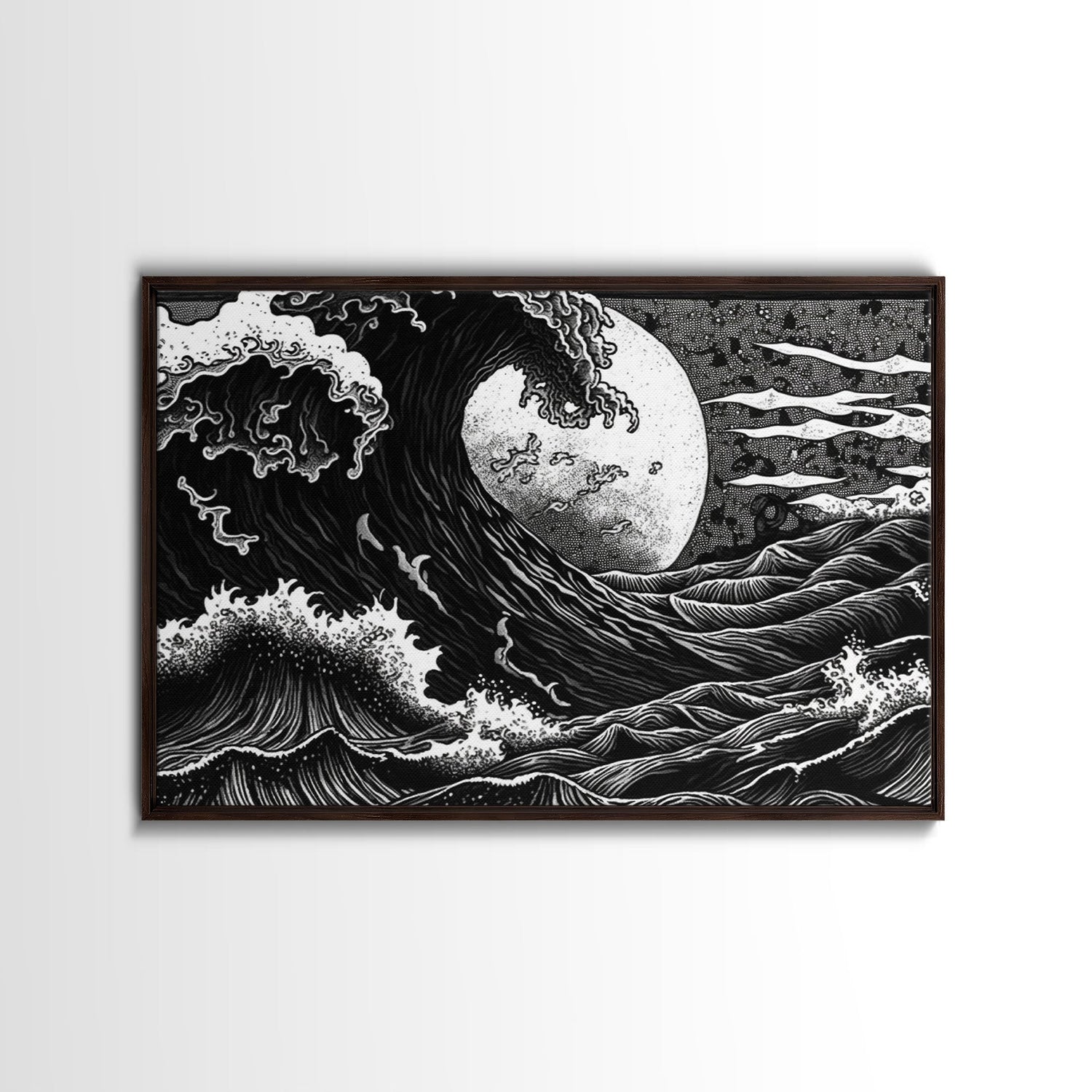 Ocean Wave Wall Art Framed Canvas Print, Unique Wall Art, Hokusai Inspired Japanese Style Wall Art, Oversized Art Ocean Print, Retro Art
