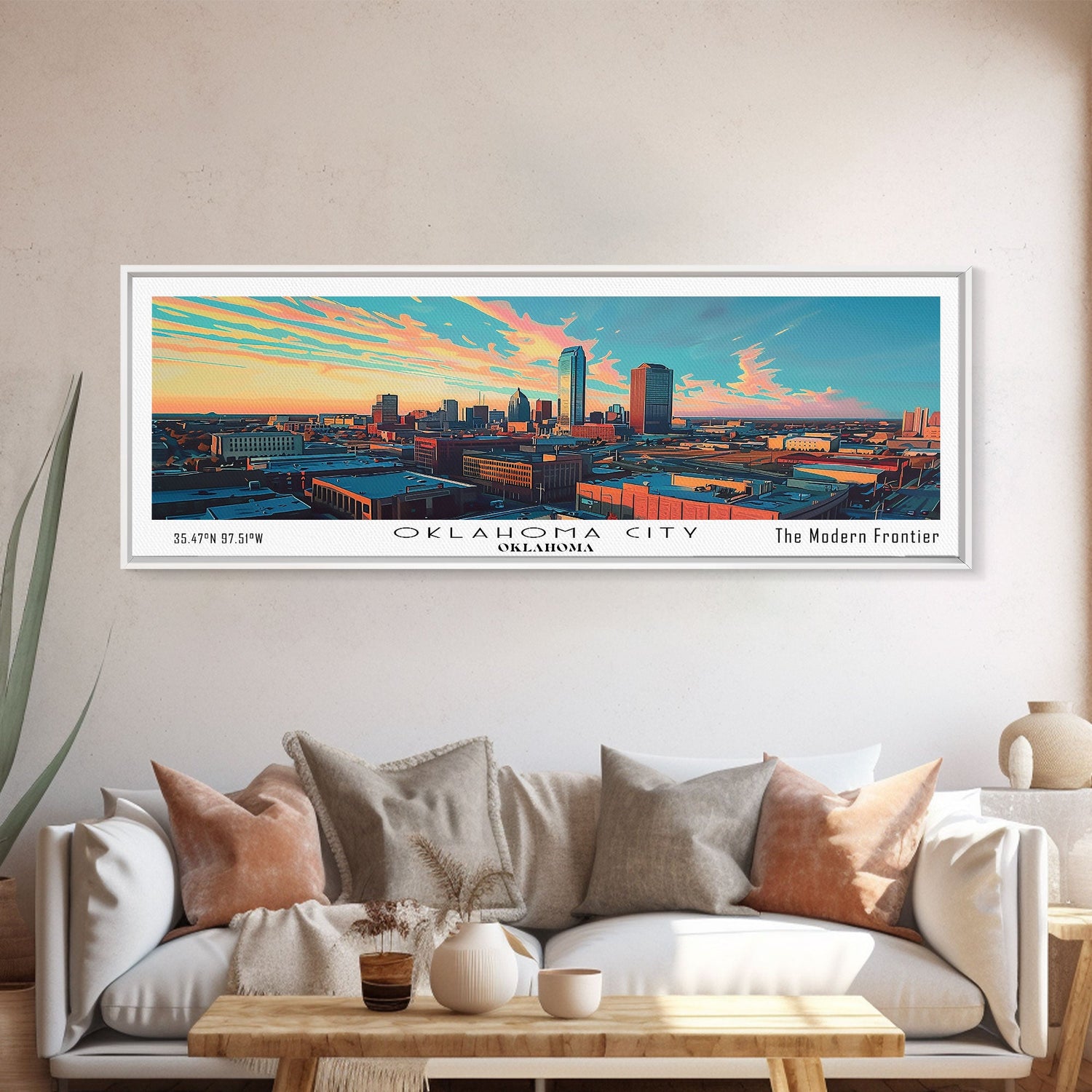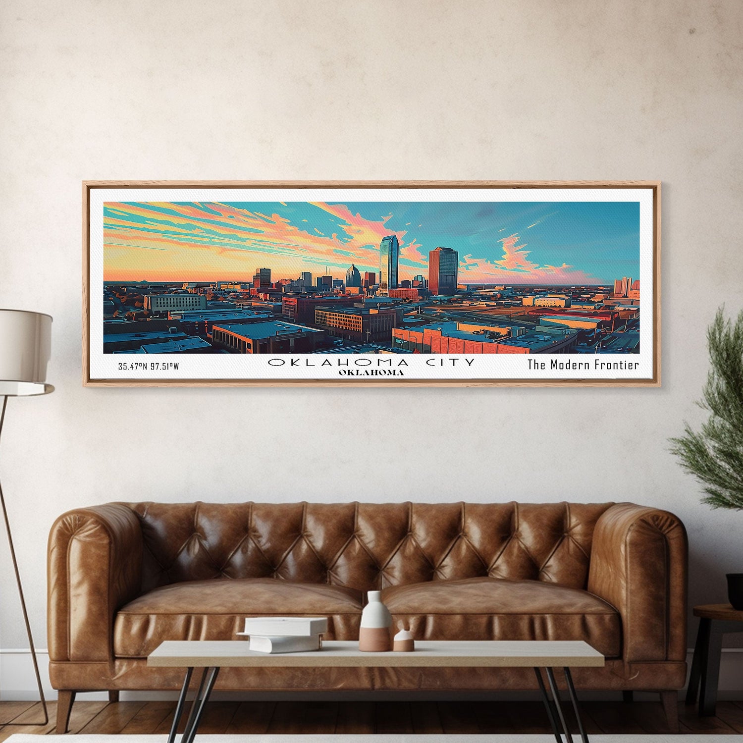 Oklahoma City Oklahoma Panoramic Painting, Mid Century Modern Framed Canvas Print, Retro Pop Art Travel Poster, City Art, Office Wall Decor, Living Room Art