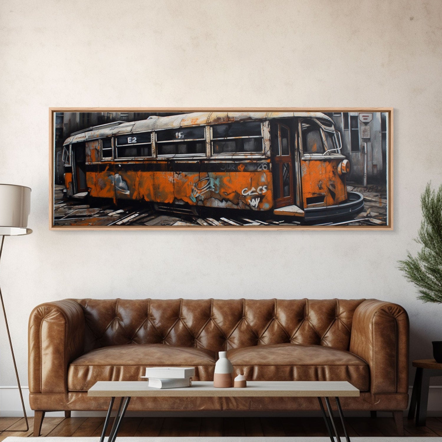 Old Abandoned Orange Streetcar Print, Graffiti Art, Urban Art Print, Street Art, Large Canvas Print, Panoramic, Wall Art, Canvas Print