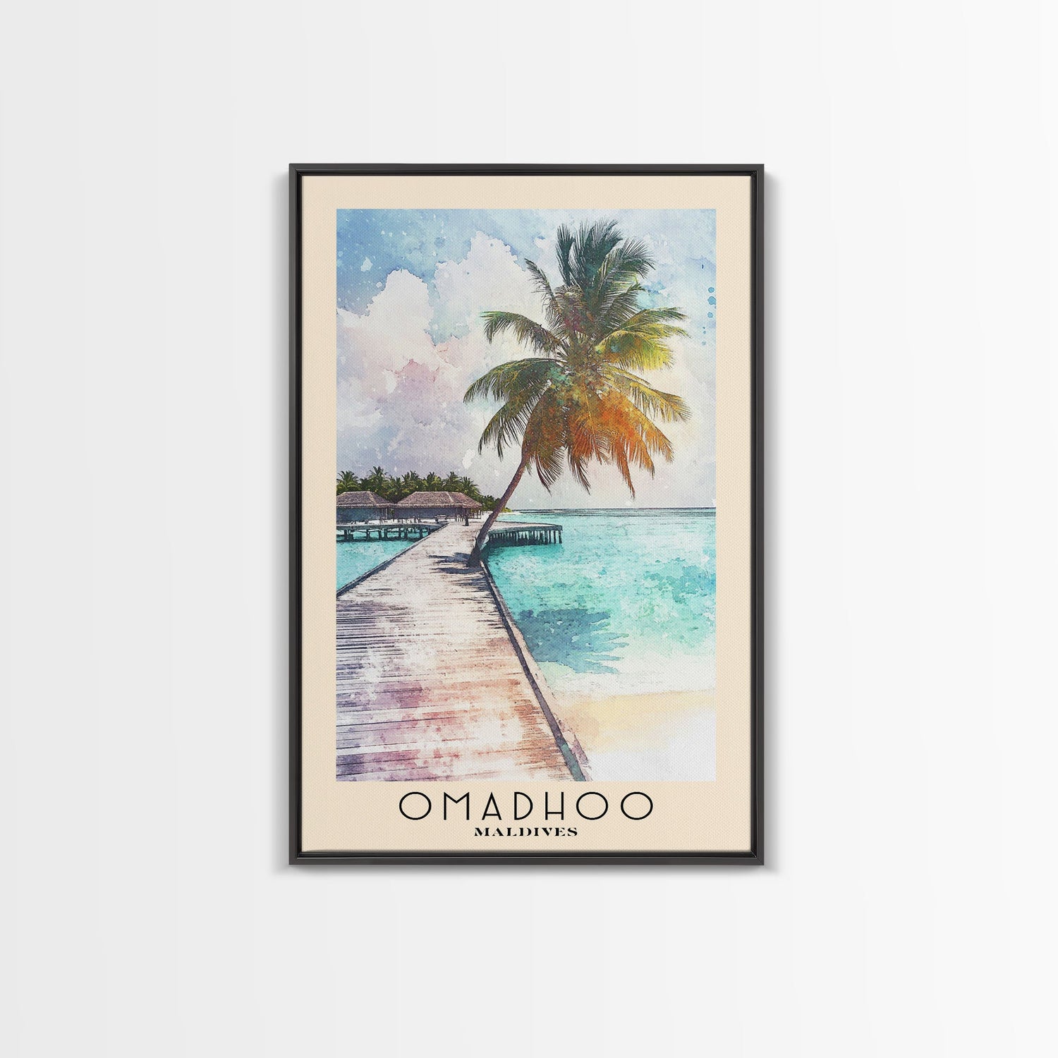 Omadhoo, Maldives Watercolor Print, Vacation Gift, Maldives Wall Art, Beach Painting, Beach Decor, Large Wall Art, Wood Frame Art