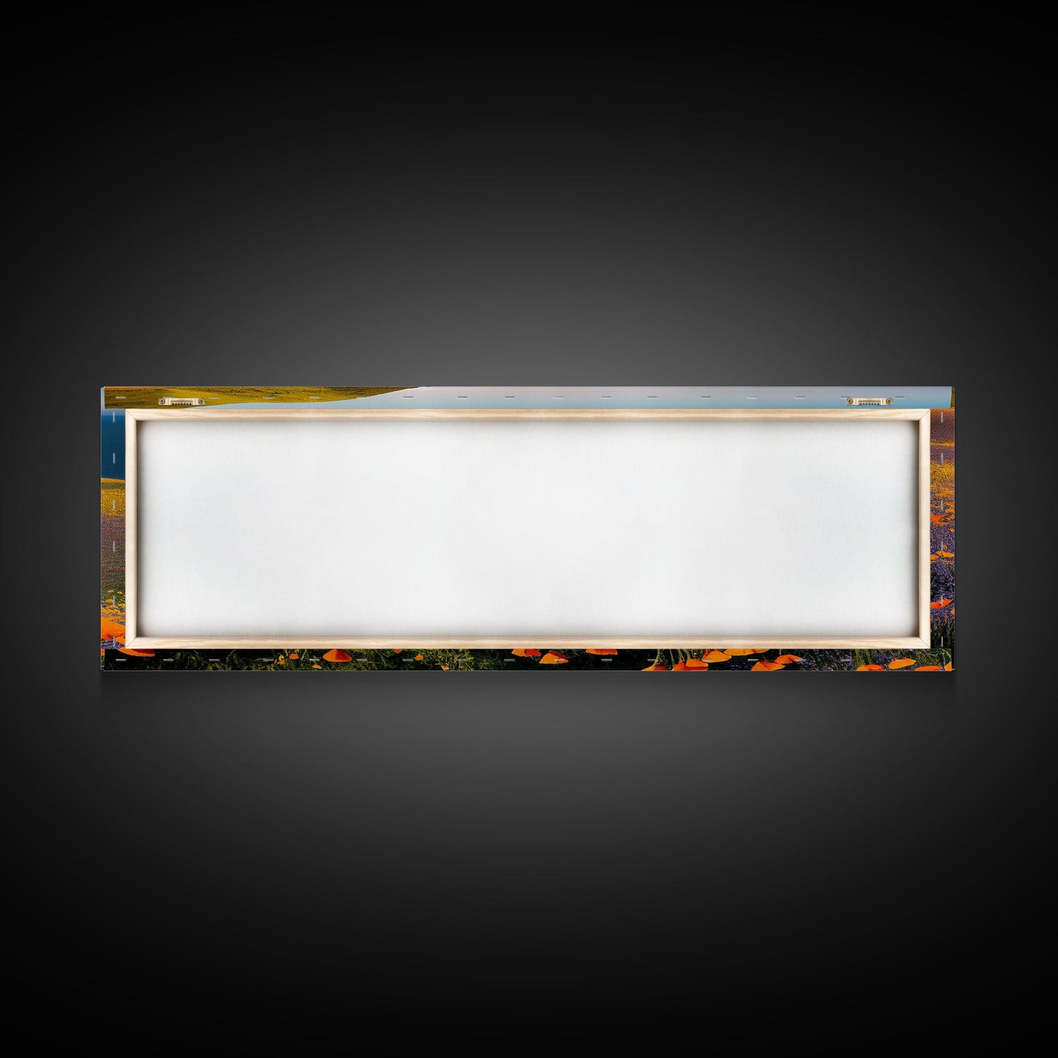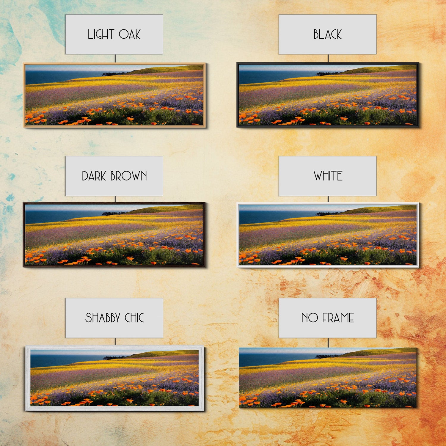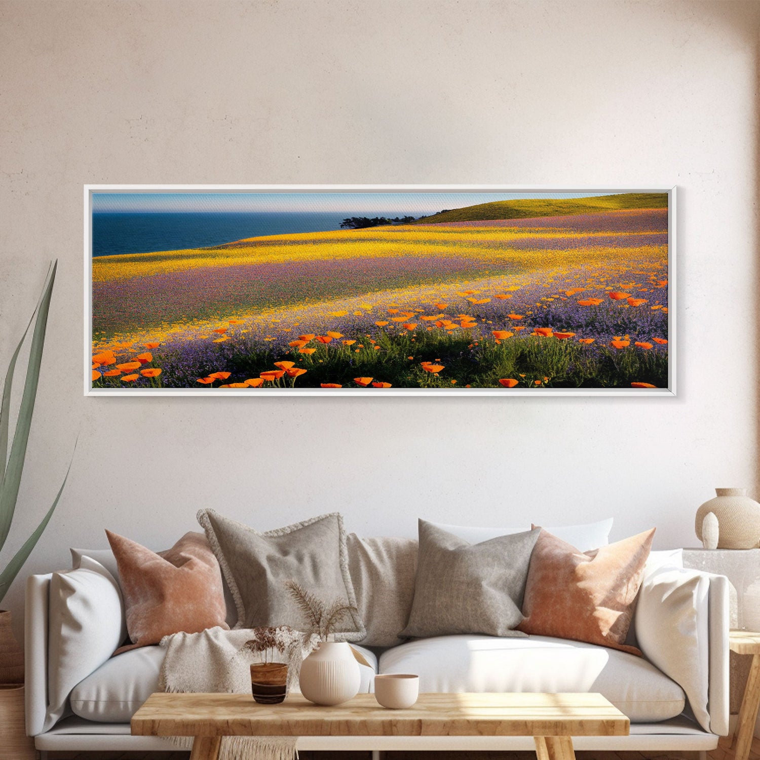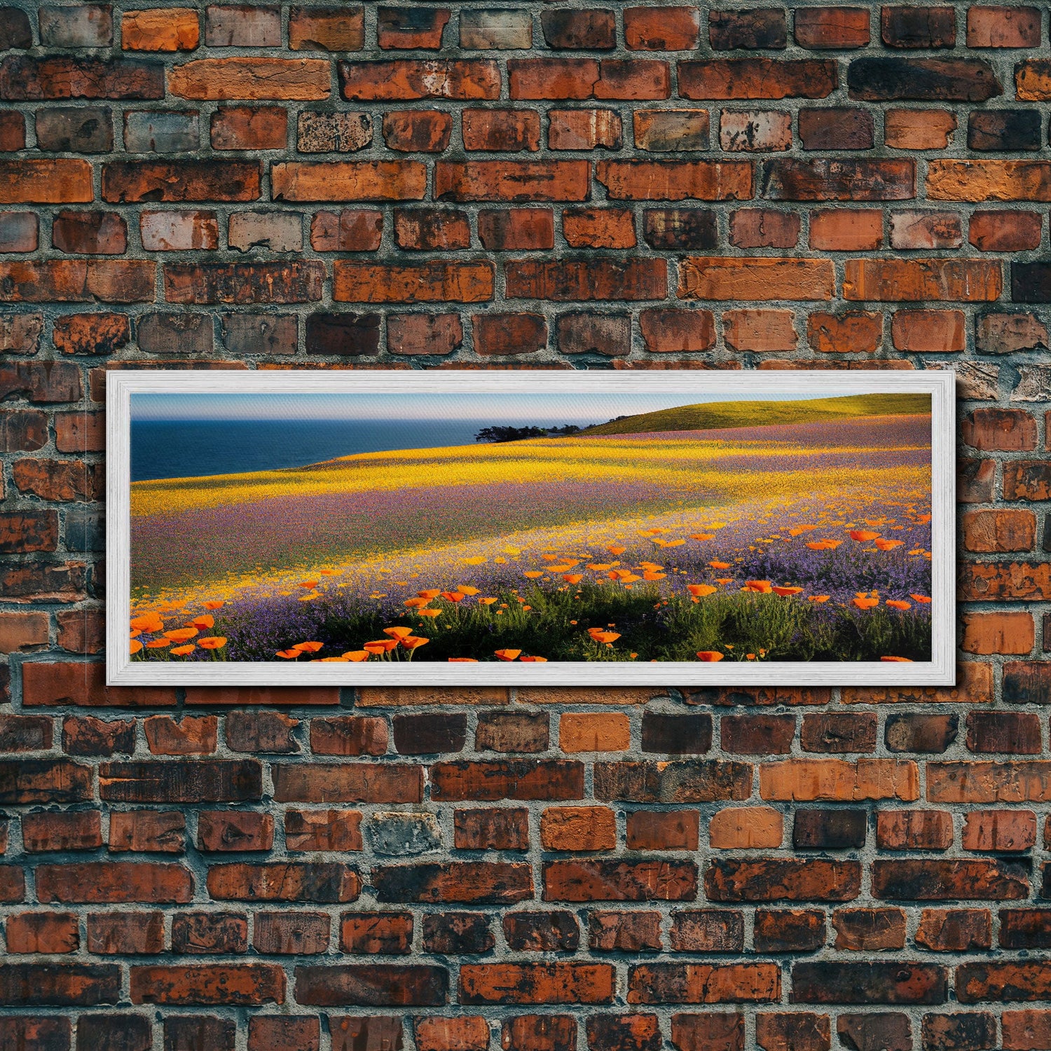 Orange and Purple Flowers in Bloom, Office Poster, Extra Large Wall Art, Framed Panoramic Canvas Print, Framed Wall Decor - 10x30 Inches / No Frame - Stretched Canvas Only is backordered and will ship as soon as it is back in stock.
