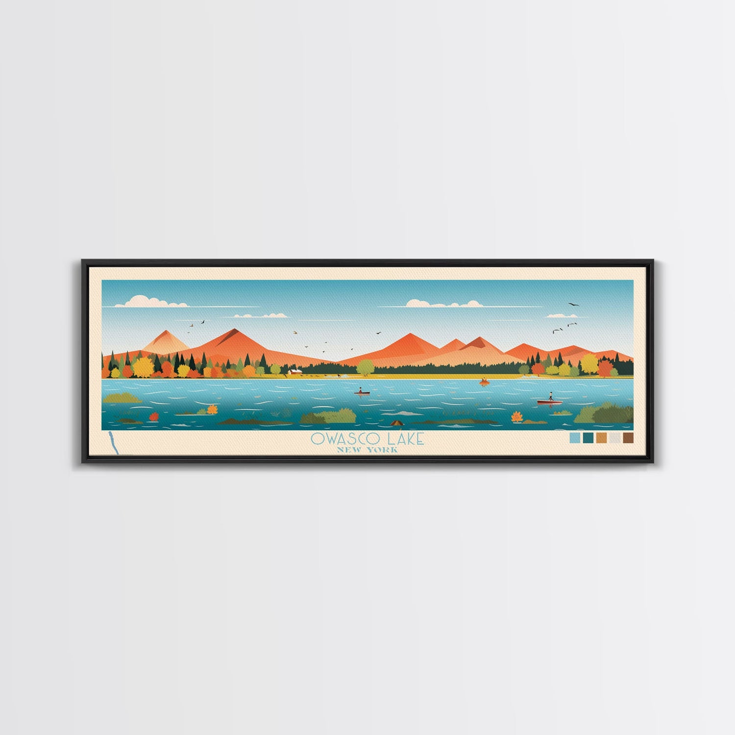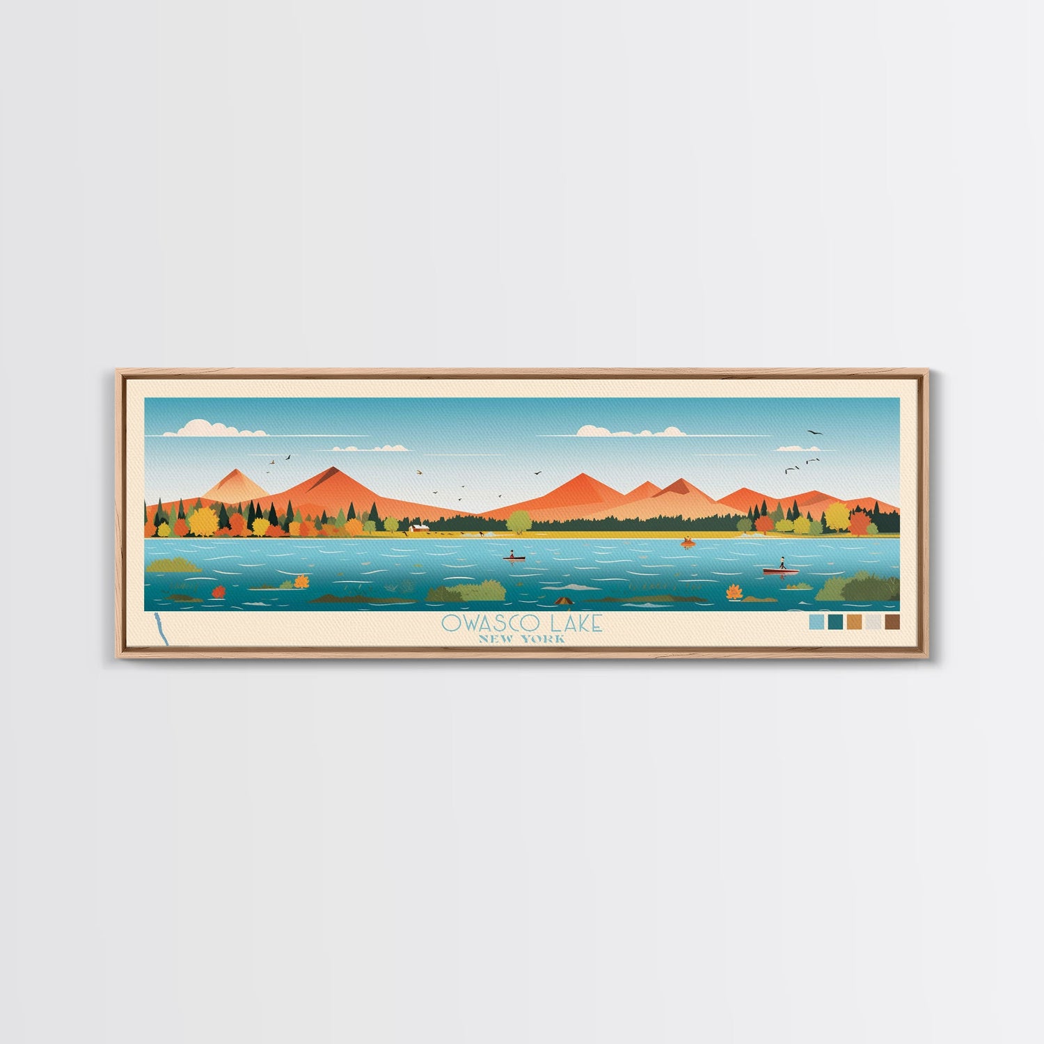 Owasco Lake, New York Framed Canvas Print, Panoramic Wall Art, Midcentury Modern, Pop Art, Home Decor, Travel Poster, Living Room Art