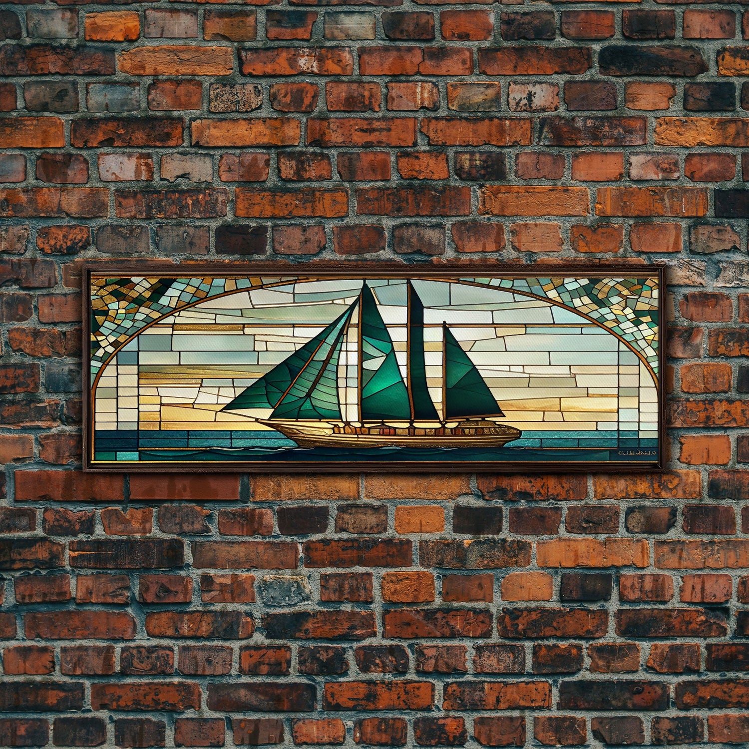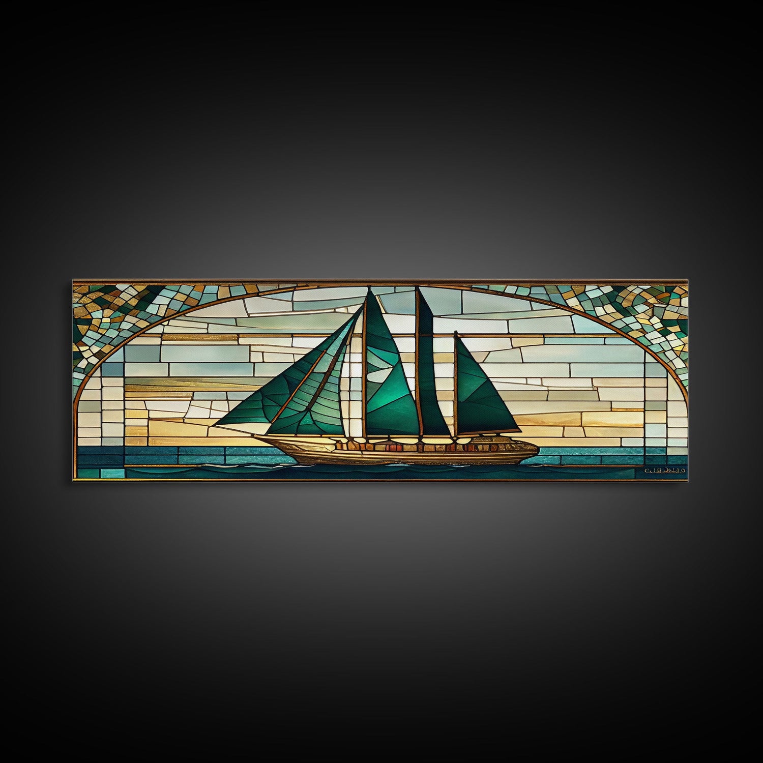 Panoramic Art Deco Sail Boat, Stained Glass, Early 20s Style Art, Roarin' 20s Art, Nautical Theme Framed Canvas Print, Extra Large Art - 10x30 Inches / No Frame - Stretched Canvas Only is backordered and will ship as soon as it is back in stock.