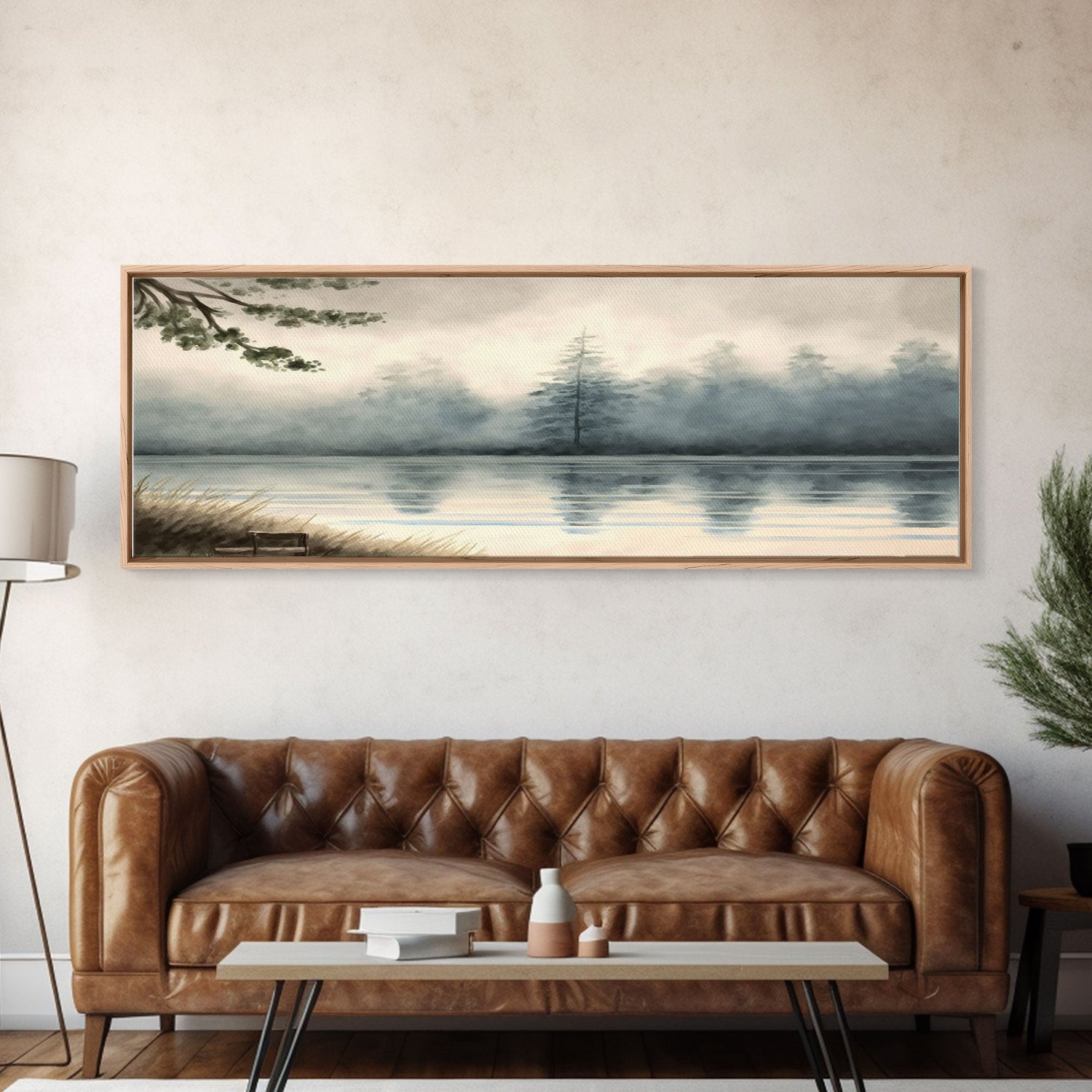 Panoramic Framed Canvas Print of Misty Fog Covered Lake and Pine Tree Forest, Perfect for Living Room, Bedroom, Fog Covered Lake