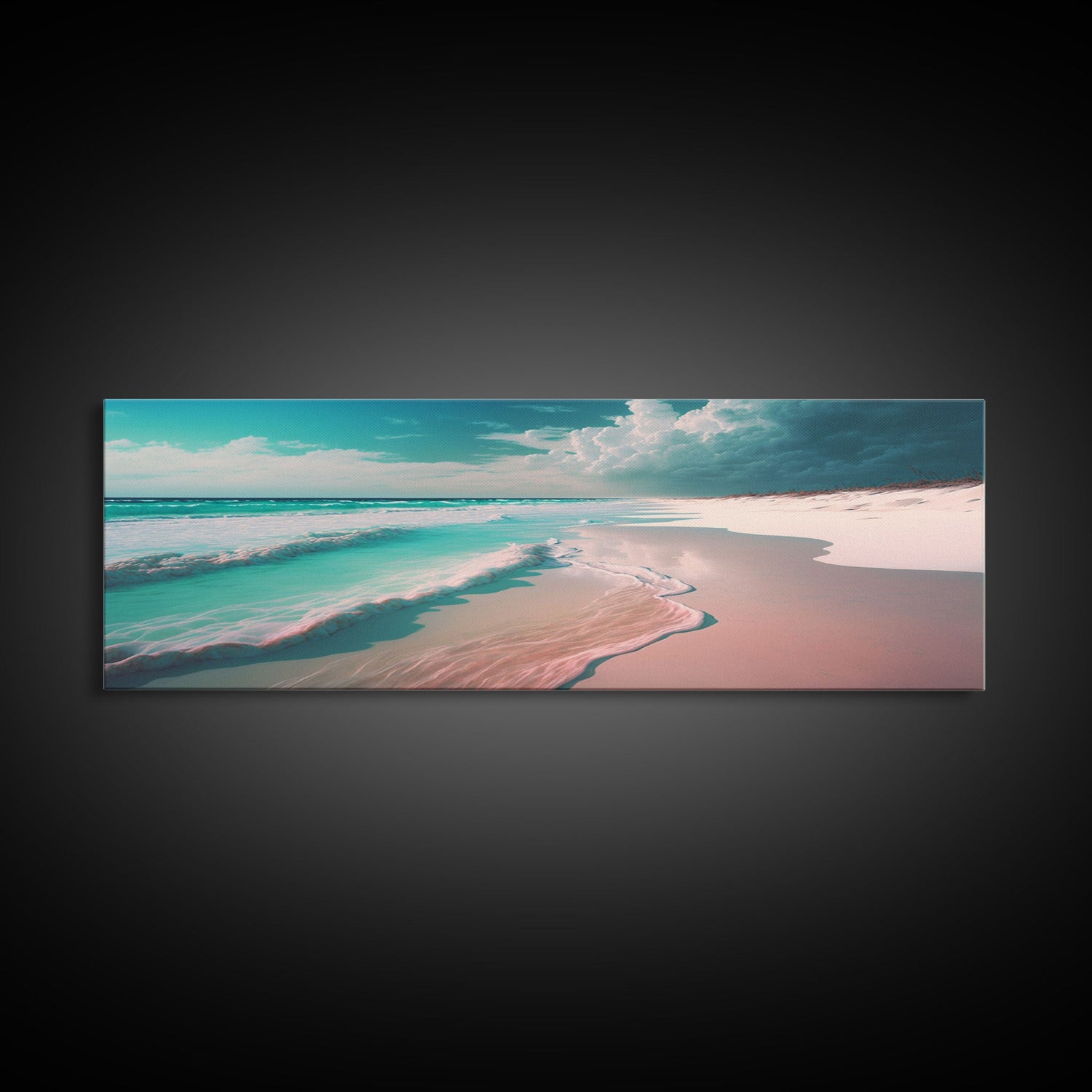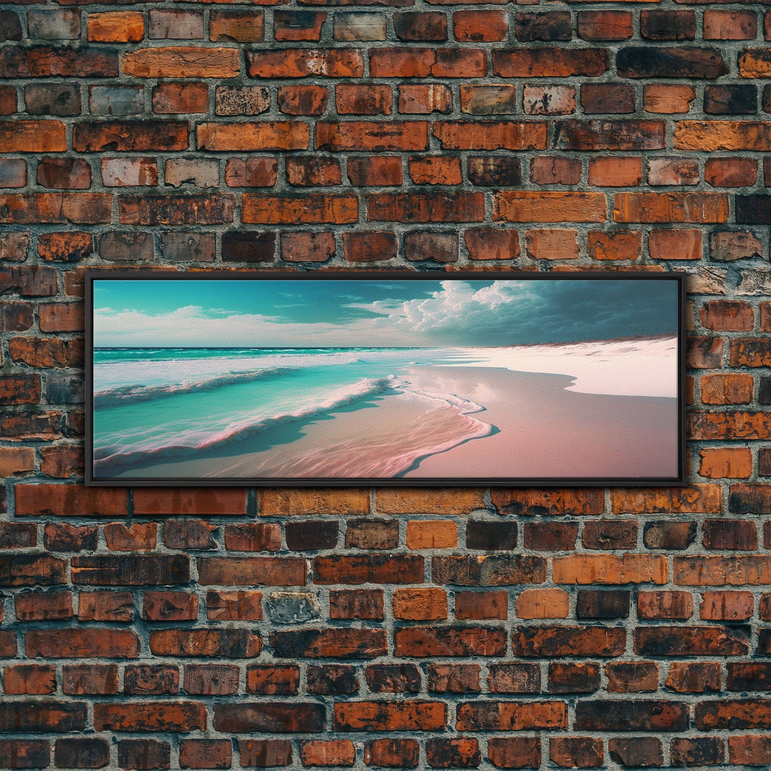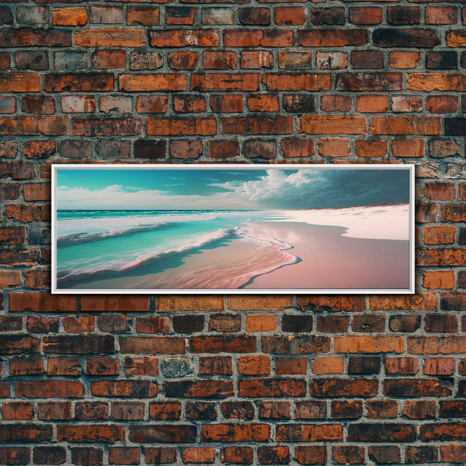 Panoramic Framed Canvas Print of Watercolor Beach Sunset Landscape Painting, Blue Ocean Waves, Tranquil Art, Peaceful Art