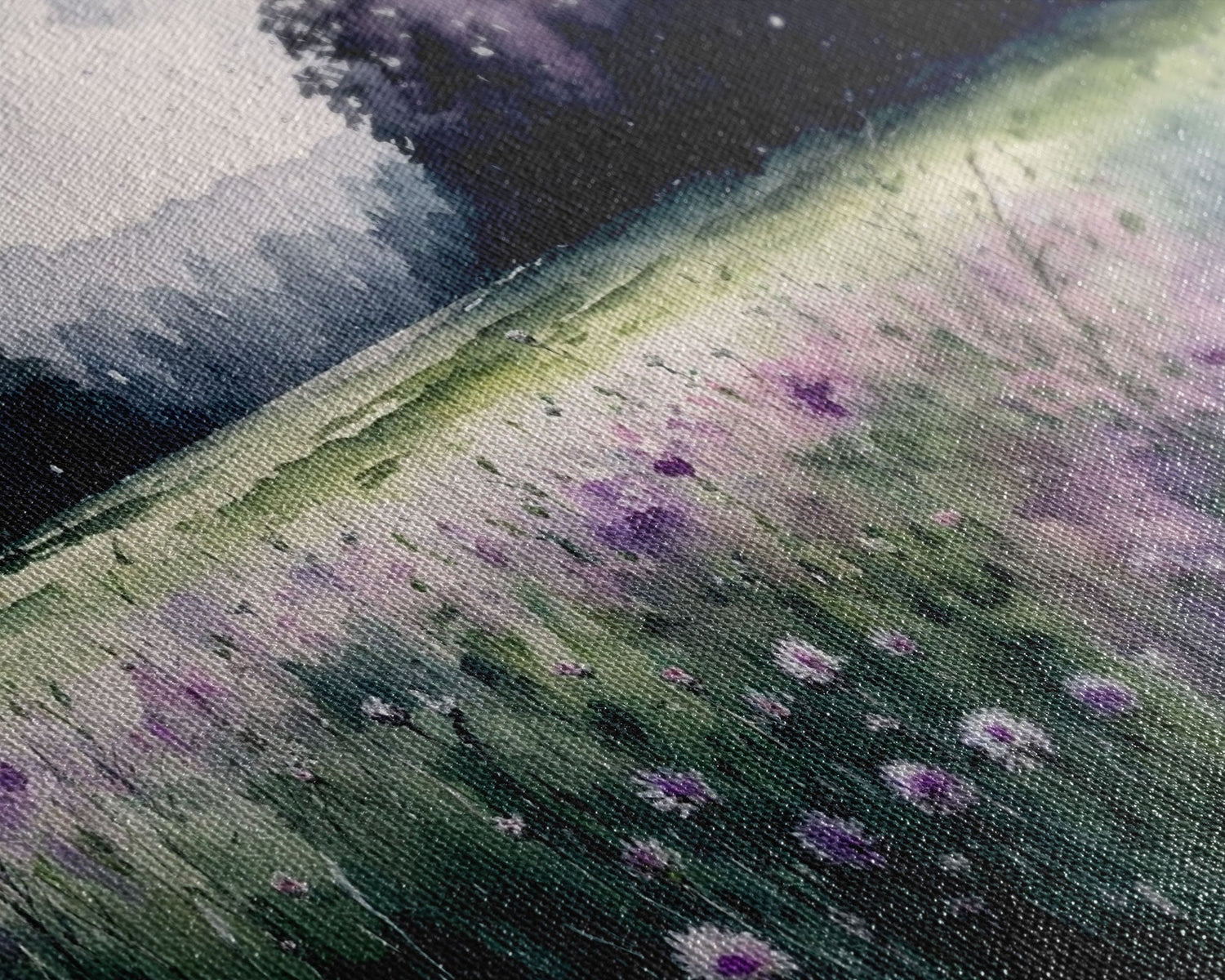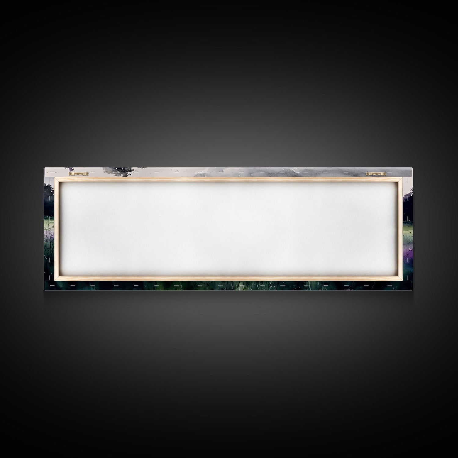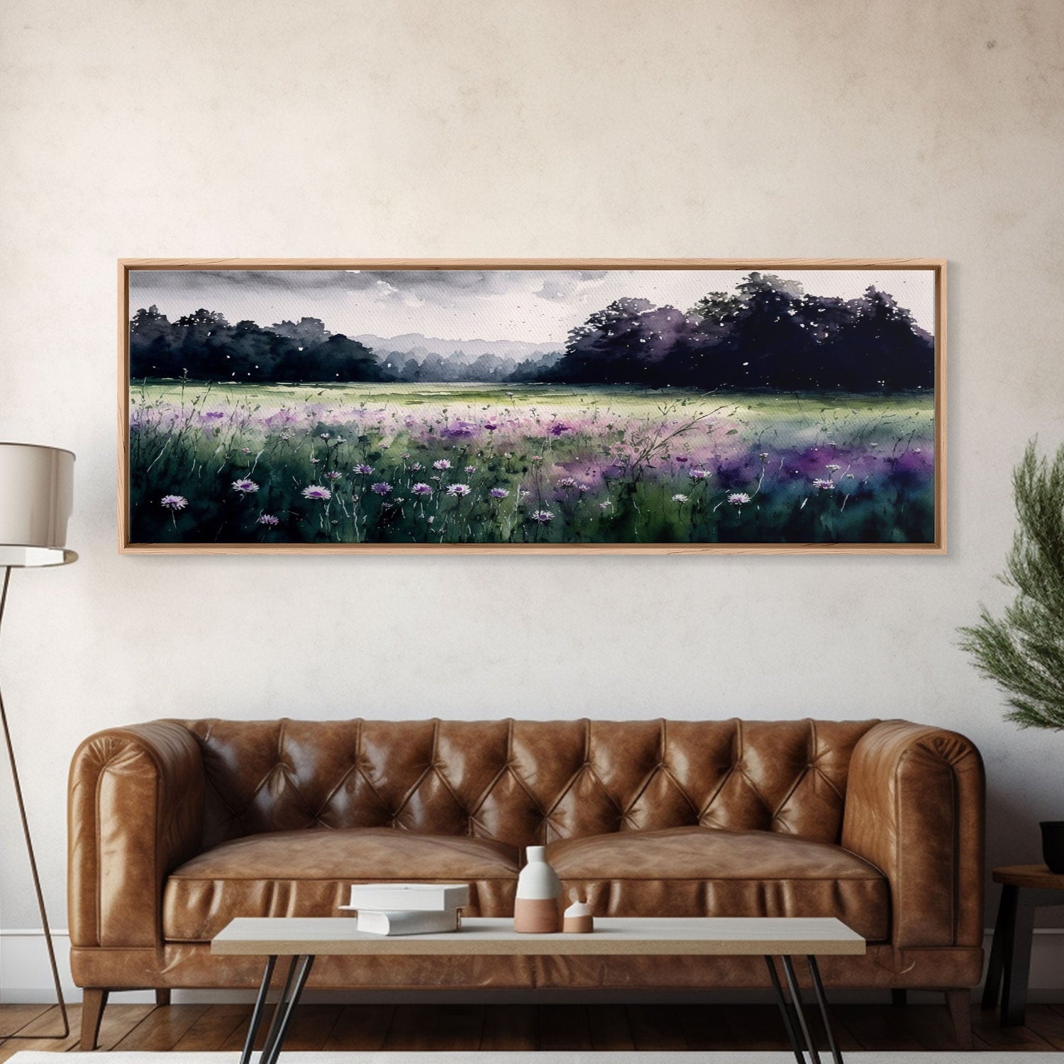 Panoramic Framed Canvas Print - Watercolor Purple Flower Field Landscape - Perfect for Living Room, Bedroom, Office, Guest Room Art