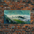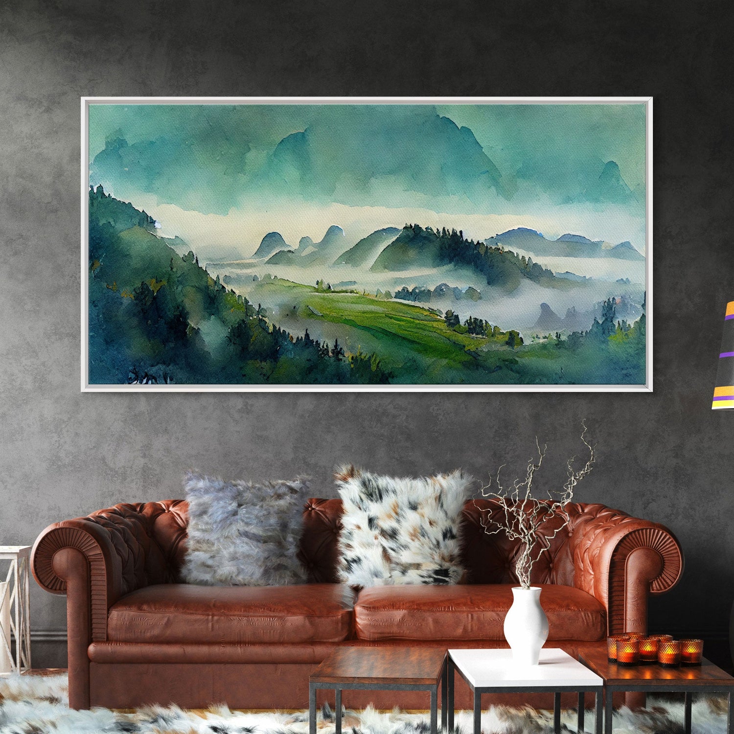 Panoramic Green Blue Foggy Mountain Valley Watercolor Canvas Art Print, Misty Rolling Hills Landscape, Extra Large Panorama Print