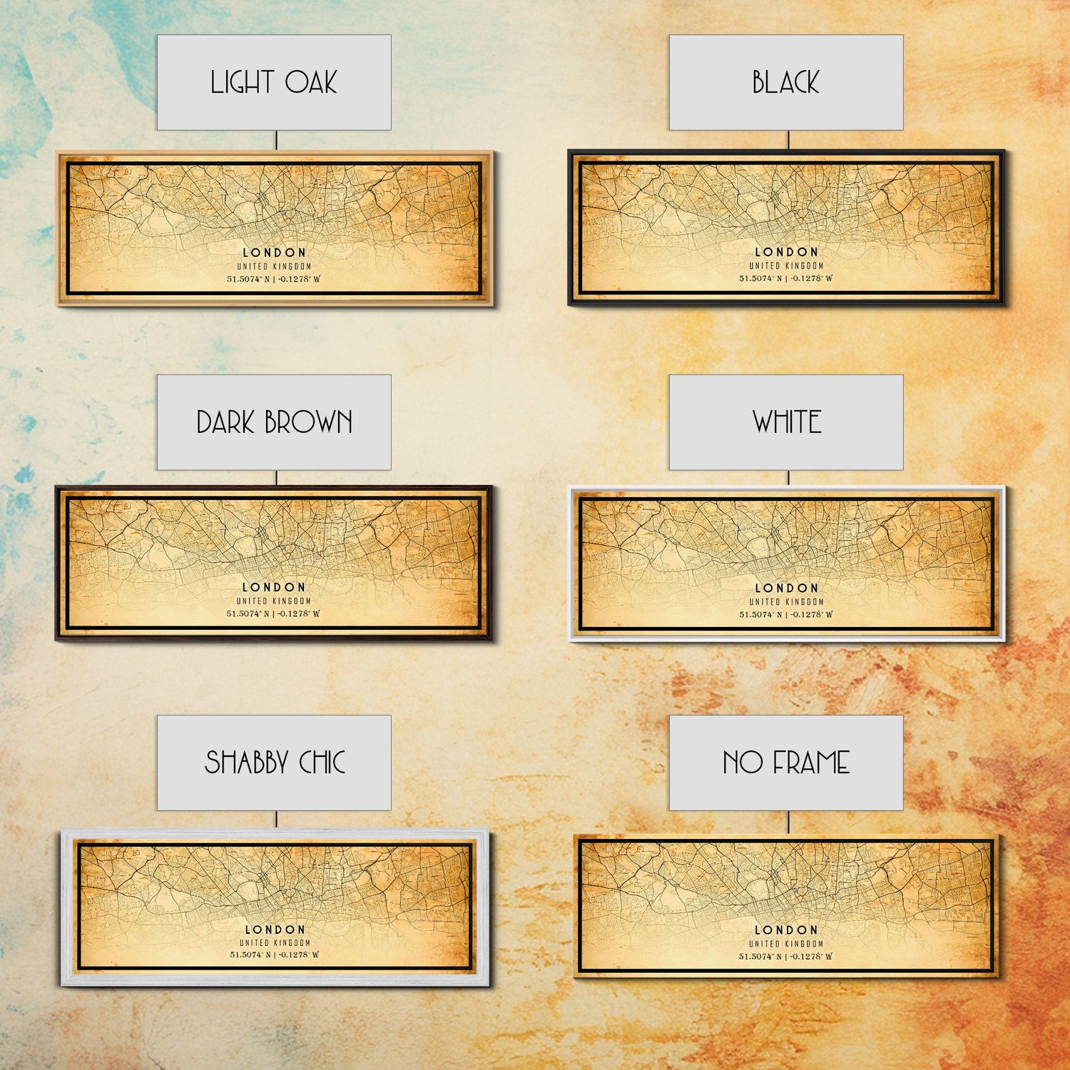 Panoramic London UK map print poster or framed canvas, London map print canvas, London city map print poster canvas, Vintage Travel Art - 10x30 Inches / No Frame - Stretched Canvas Only is backordered and will ship as soon as it is back in stock.