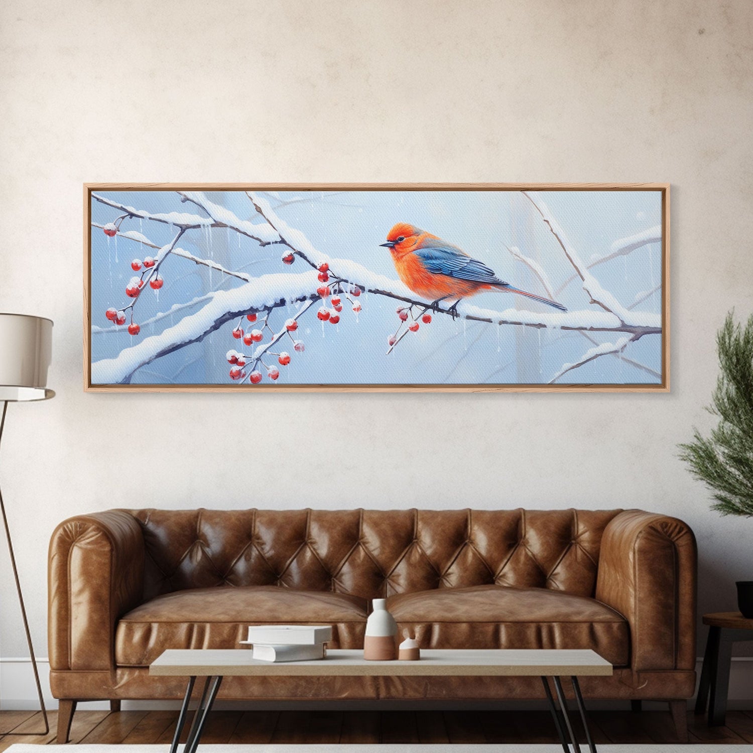 Panoramic Print of a Bluebird In A Snow Storm, Winter Decor, Christmas Centerpiece, Beautiful Animal Print, Animal Painting, Canvas Print - 10x30 Inches / No Frame - Stretched Canvas Only is backordered and will ship as soon as it is back in stock.
