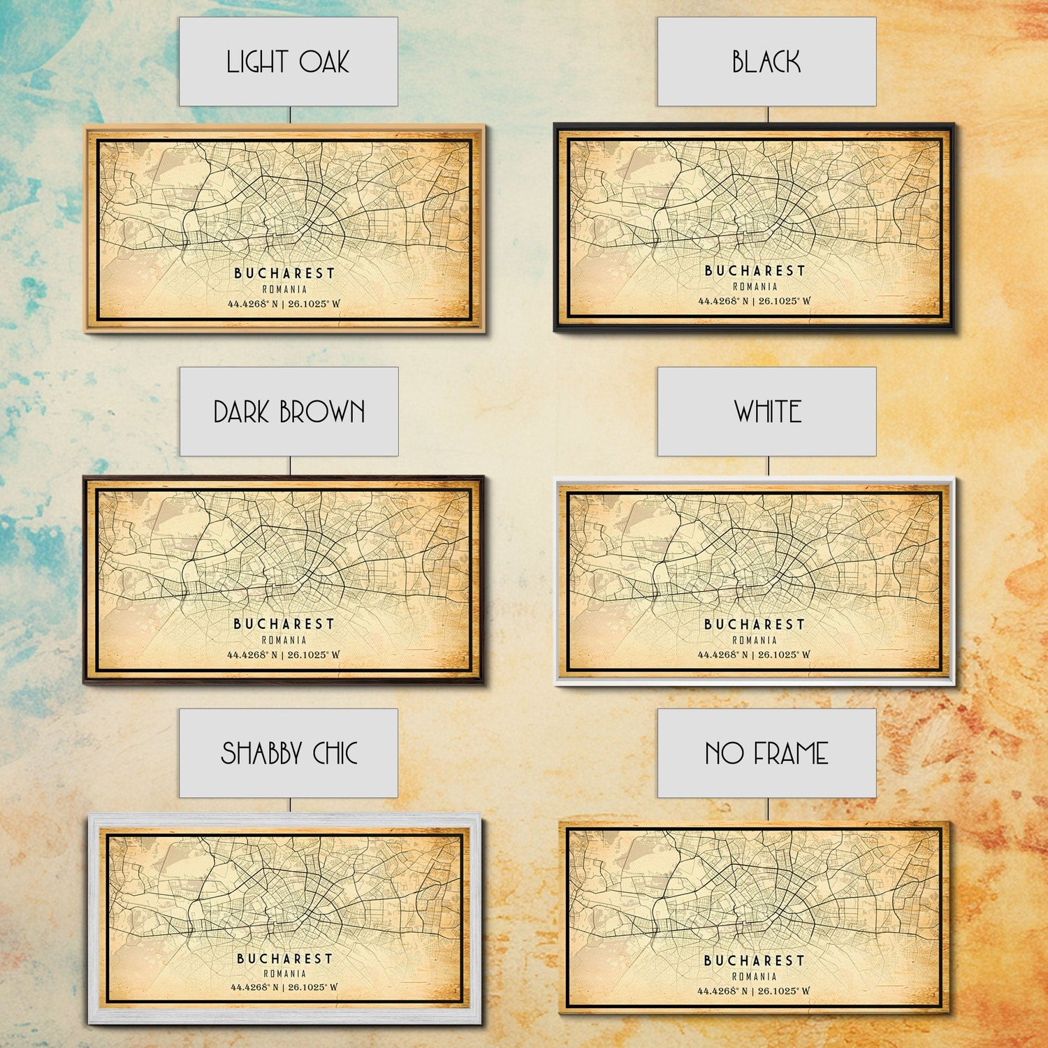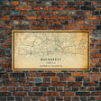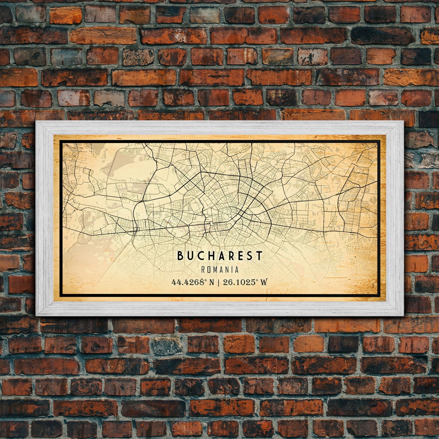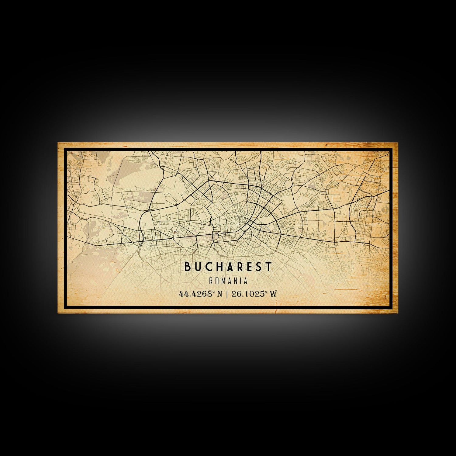 Panoramic Vintage Style Bucharest City Map Wall Art Canvas Print, Distressed Bucharest Map, Framed Art, Cool Travel Wall Art, Office Art