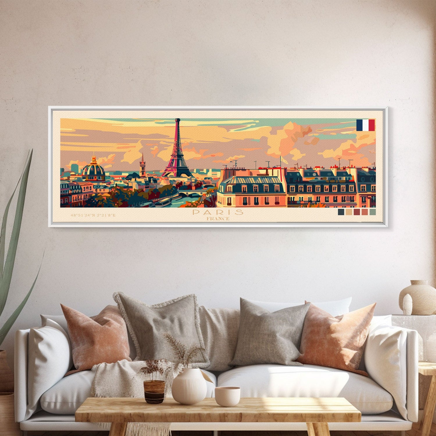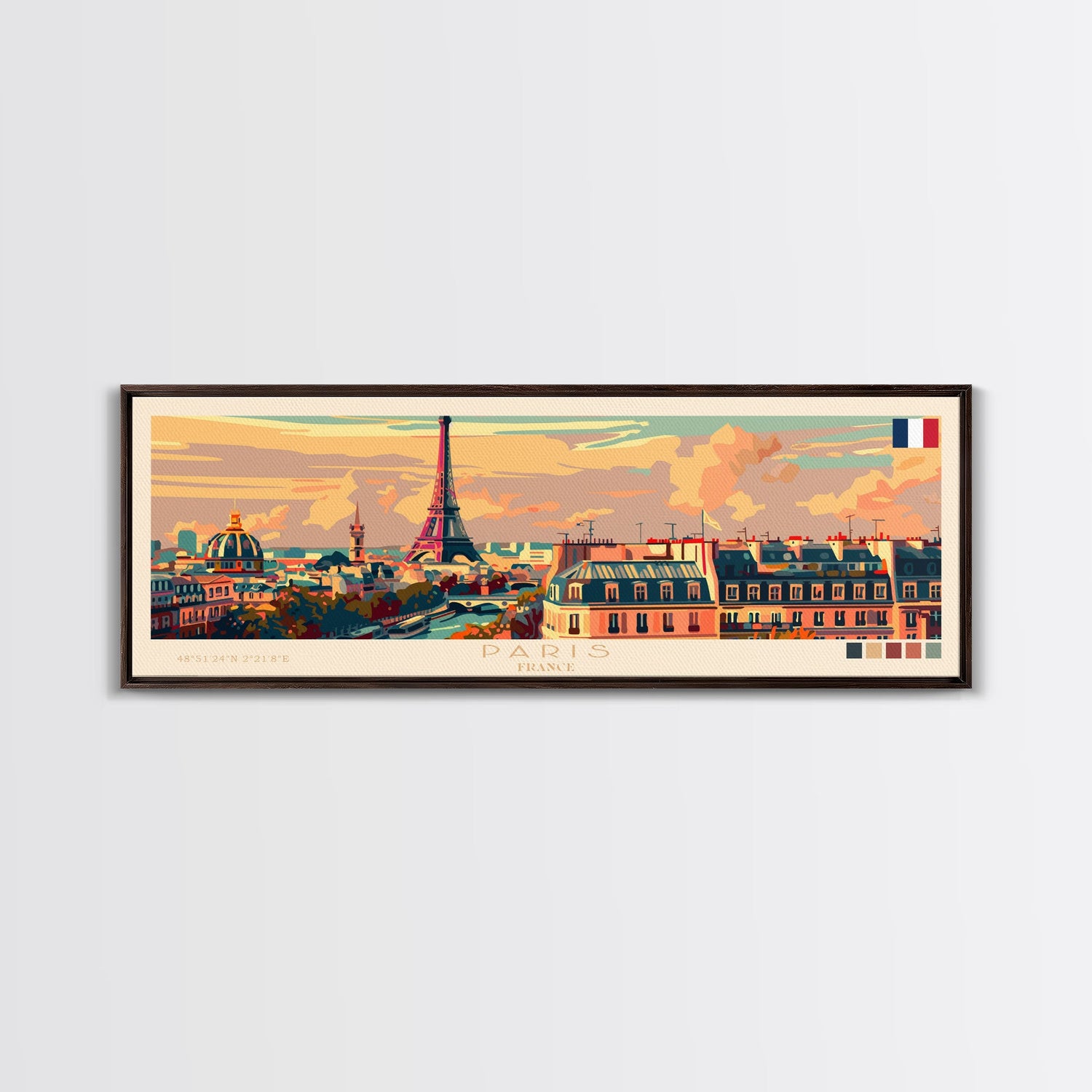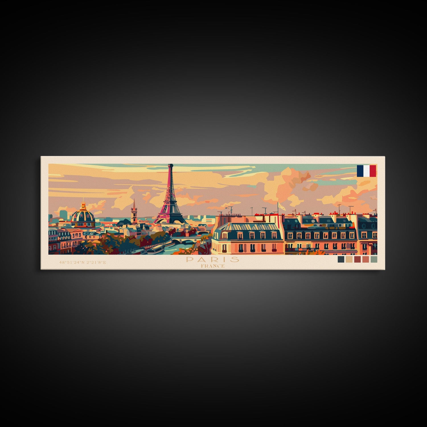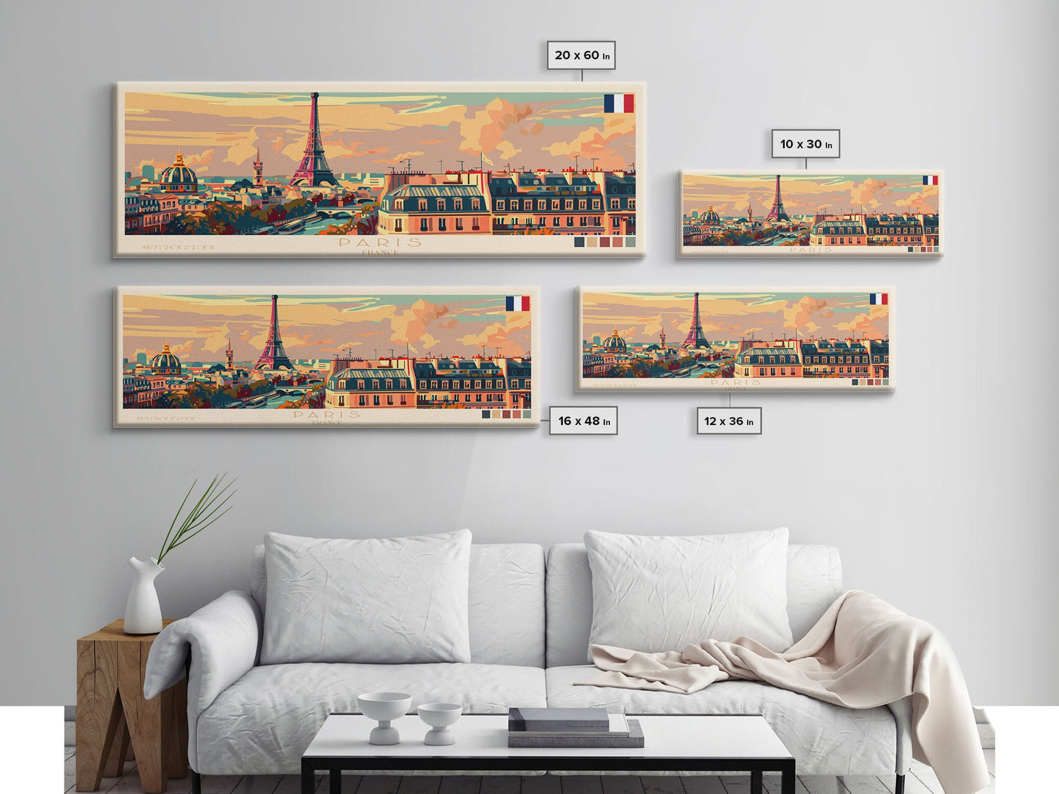 Paris France Panoramic Travel Poster, Framed Canvas Print or Metal Wall Art, Travel Art, Home Decor, Panoramic Painting, Midcentury Art