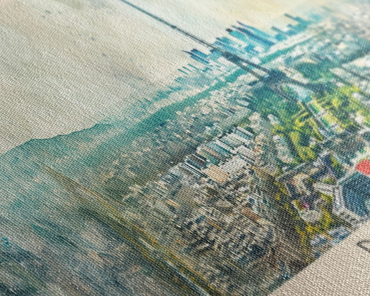 Most of our canvases are made in the USA, with the exception of canvases ordered with the light oak unstained frames, and any large canvases (24x48, 30x60, 16x48 and 20x60) ordered WITH a frame. These are temporarily made in and shipped from Europe, while we try to find a more consistent supplier in the USA.