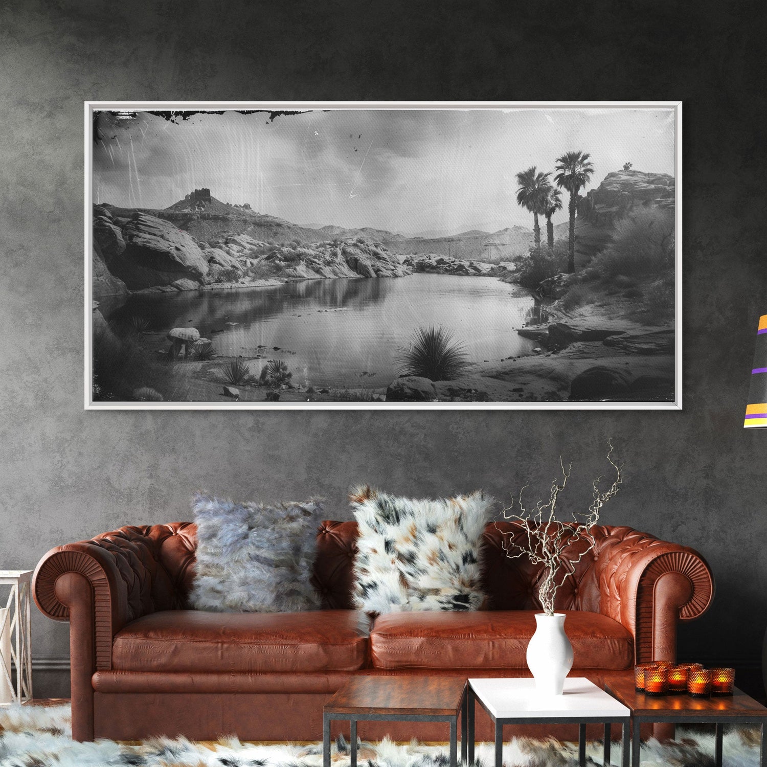 Peaceful Desert Oasis with Palm Trees, Framed Canvas Print for Living Room Decor, Ideal Bedroom Wall Art, Serene Western Scene - 10x20 Inches / No Frame - Stretched Canvas Only is backordered and will ship as soon as it is back in stock.