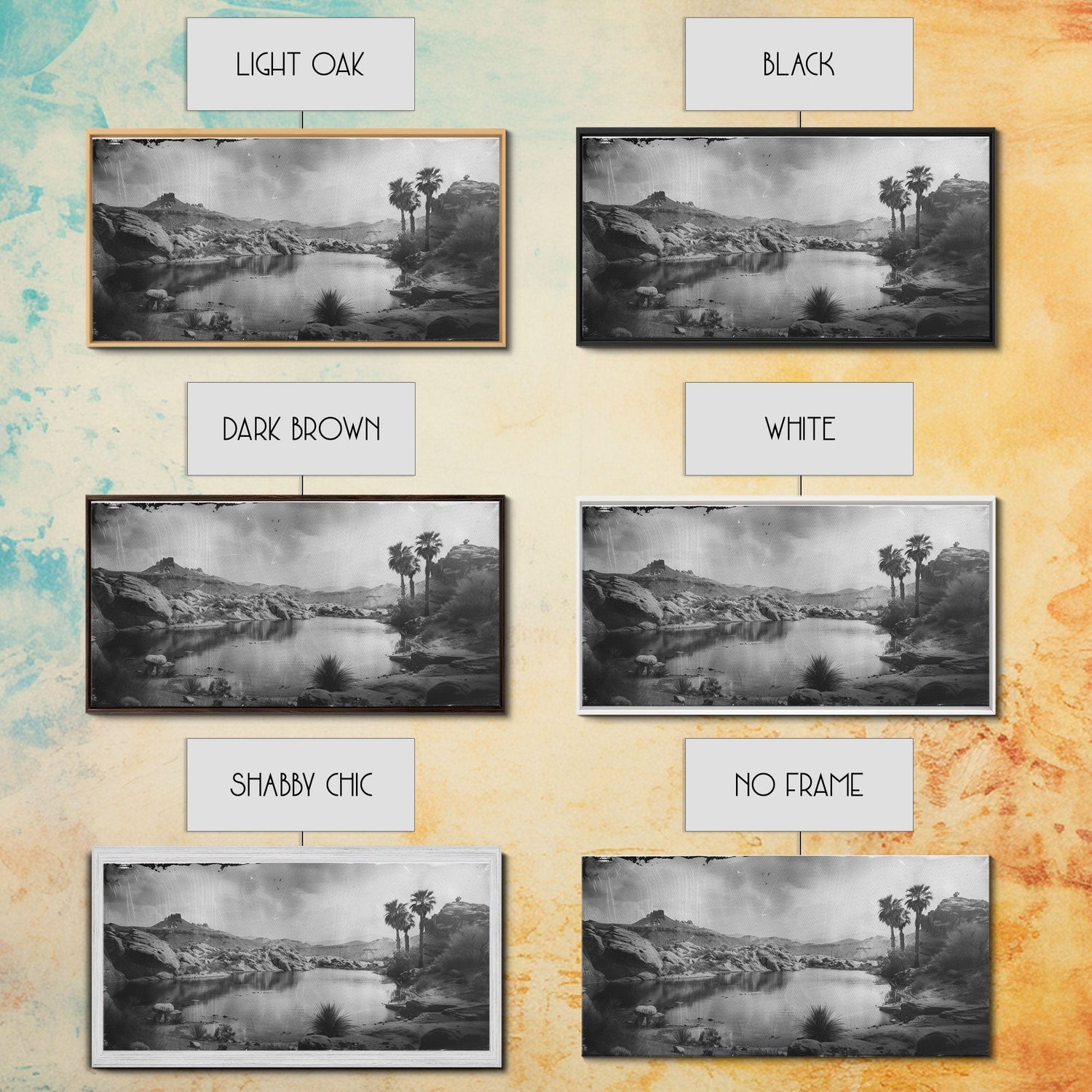 Peaceful Desert Oasis with Palm Trees, Framed Canvas Print for Living Room Decor, Ideal Bedroom Wall Art, Serene Western Scene