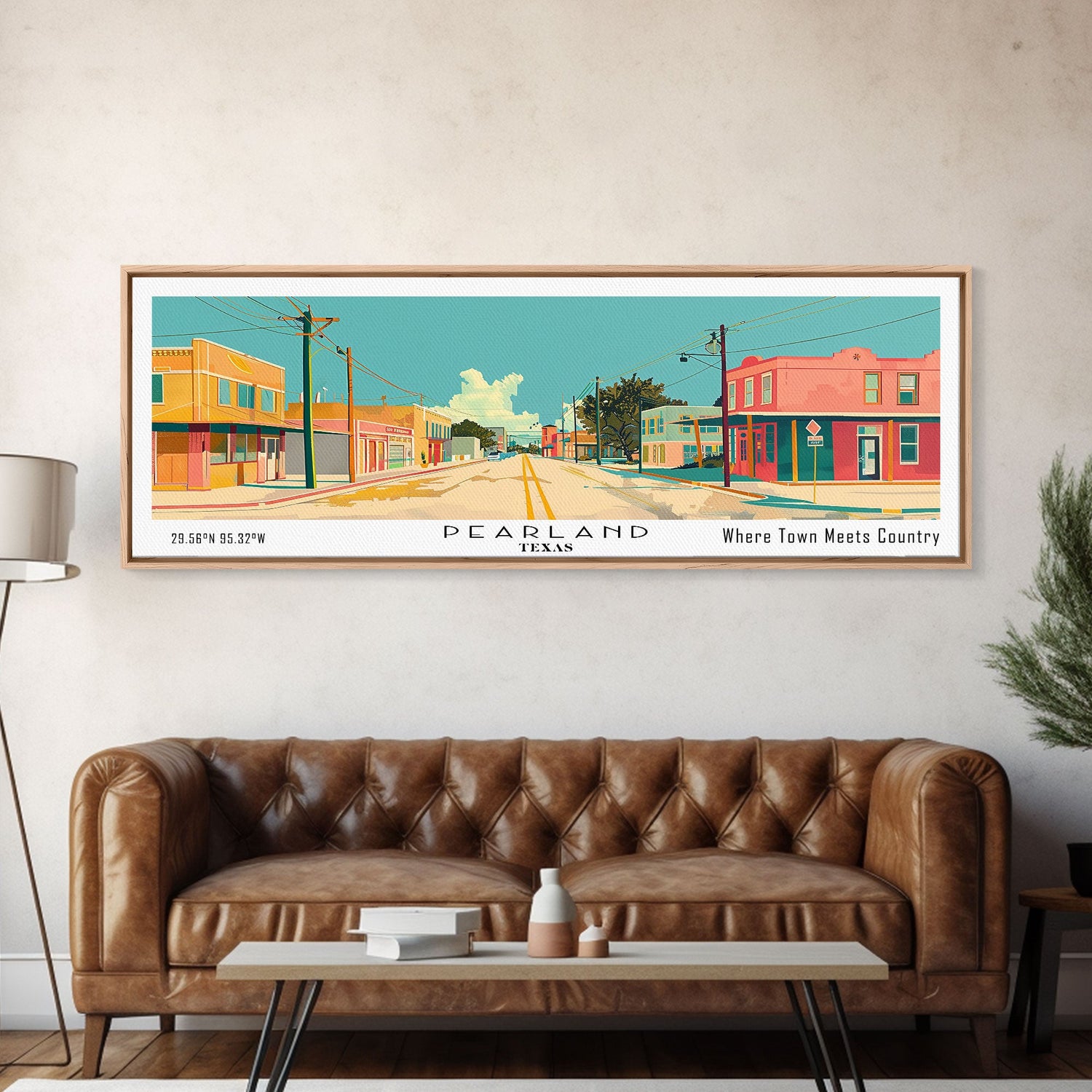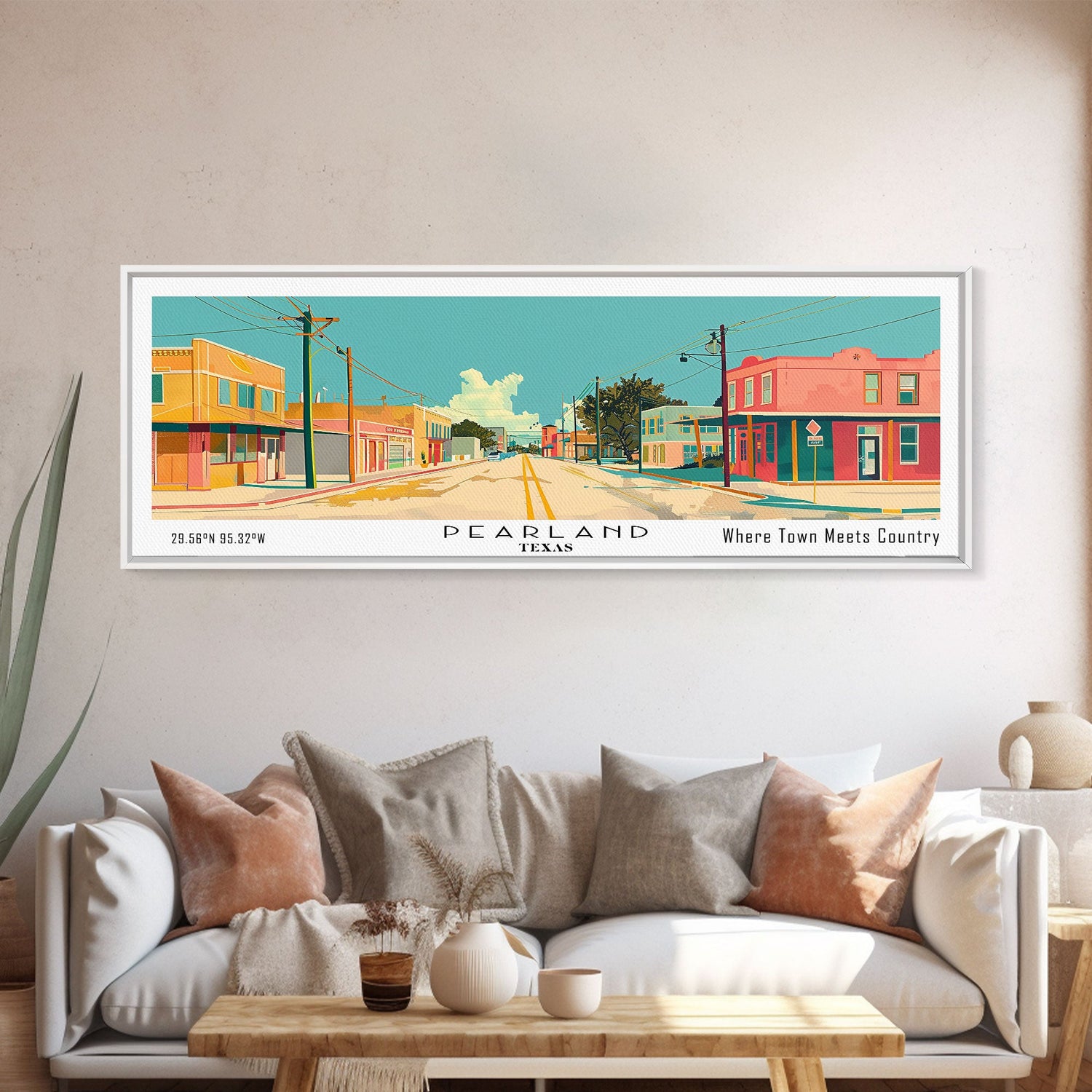 Pearland Texas Panoramic Painting, Mid Century Modern Framed Canvas Print, Retro Pop Art Travel Poster, City Art, Office Wall Decor, Living Room Art
