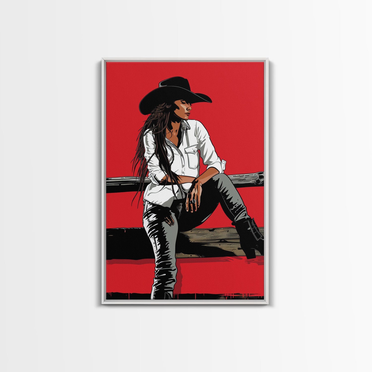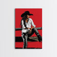 Pensive Cowgirl with Red Background Framed Canvas Print - Dramatic Western Decor, Stylish Wall Art for Living Room, Bedroom
