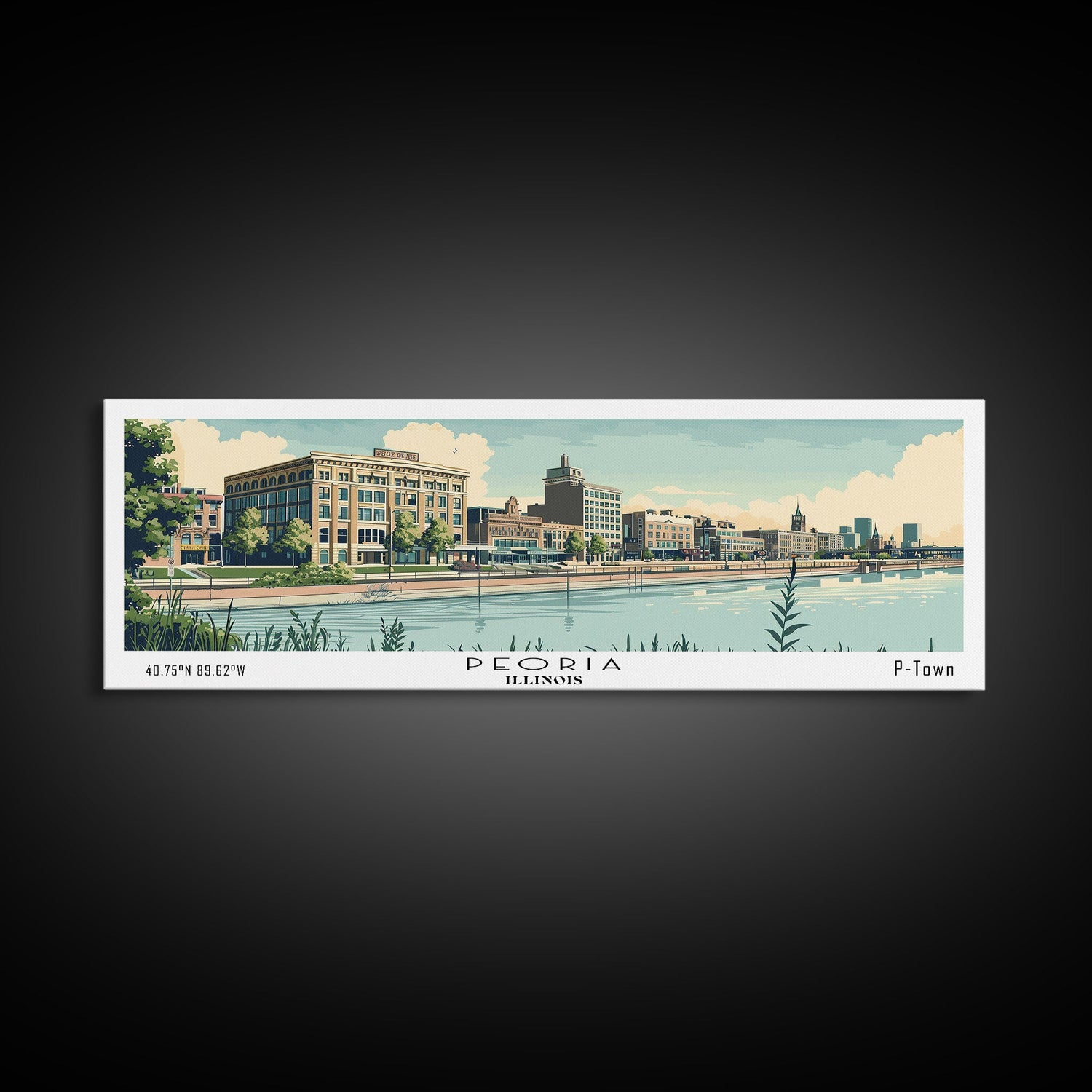 Peoria Illinois Panoramic Painting, Mid Century Modern Framed Canvas Print, Retro Pop Art Travel Poster, City Art, Office Wall Decor, Living Room Art - 10x30 Inches / No Frame - Stretched Canvas Only is backordered and will ship as soon as it is back in stock.