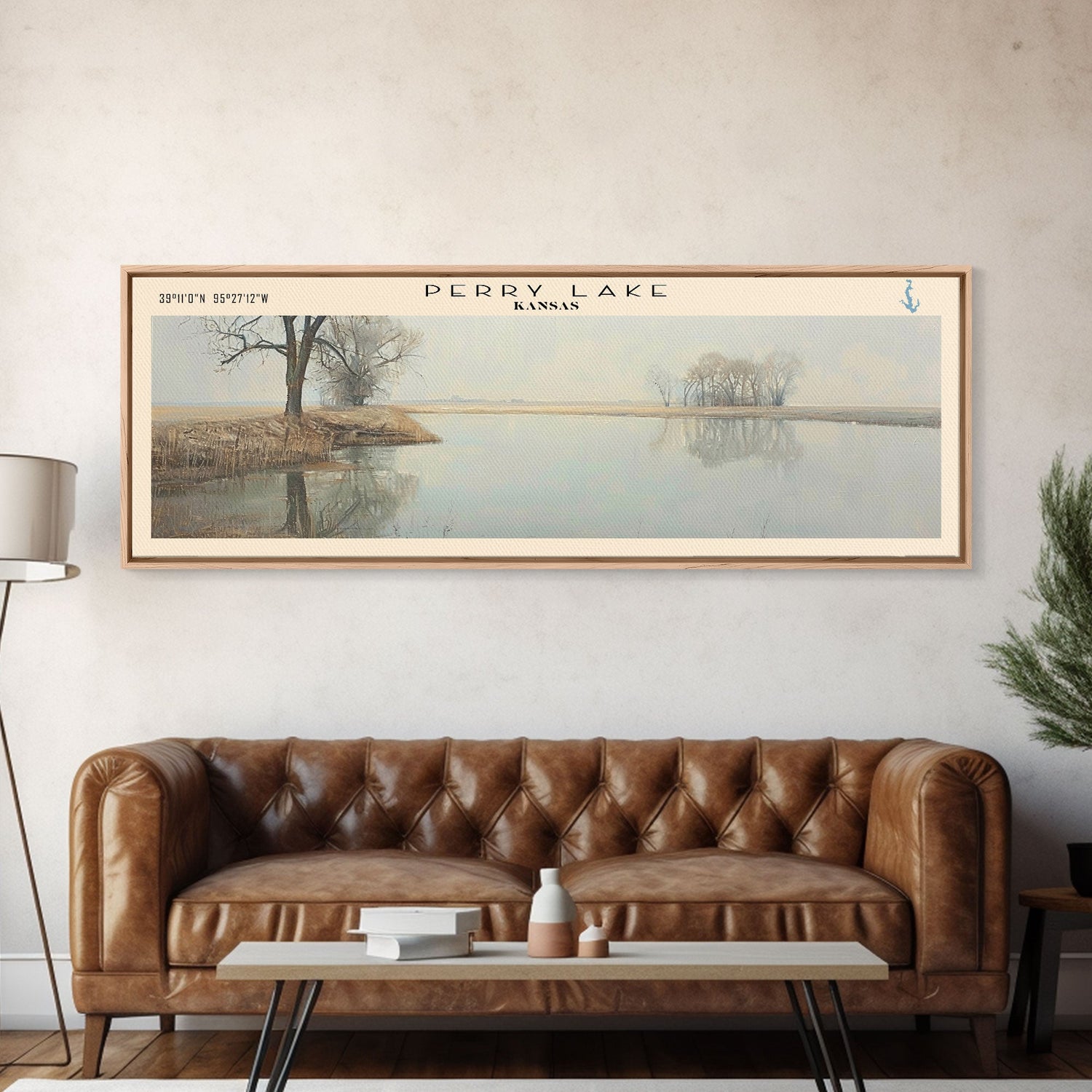 Perry Lake Kansas Framed Canvas Print, Lake House Decor, Panoramic Wall Art, Travel Poster, Beautiful Landscape Painting, Living Room Decor