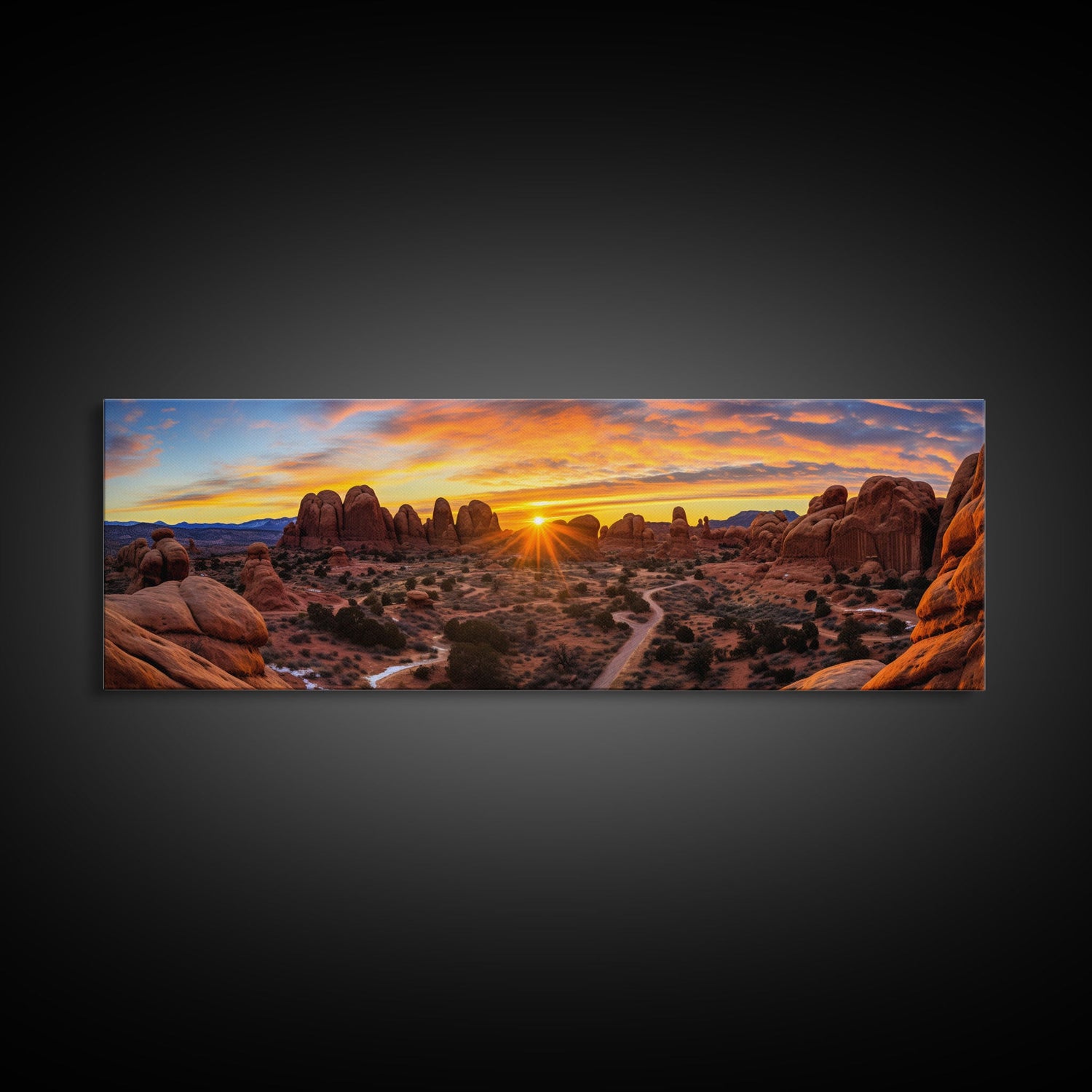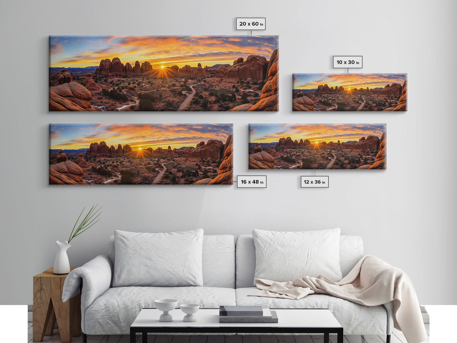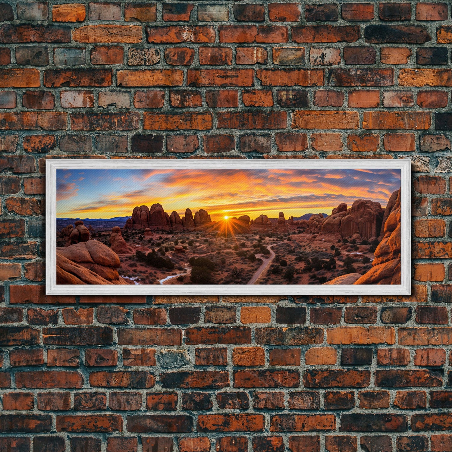 Photographic Panoramic of Arches National Park, Sunset Photography, National Park Art, Framed Canvas Print, Landscape Photography - 10x30 Inches / No Frame - Stretched Canvas Only is backordered and will ship as soon as it is back in stock.