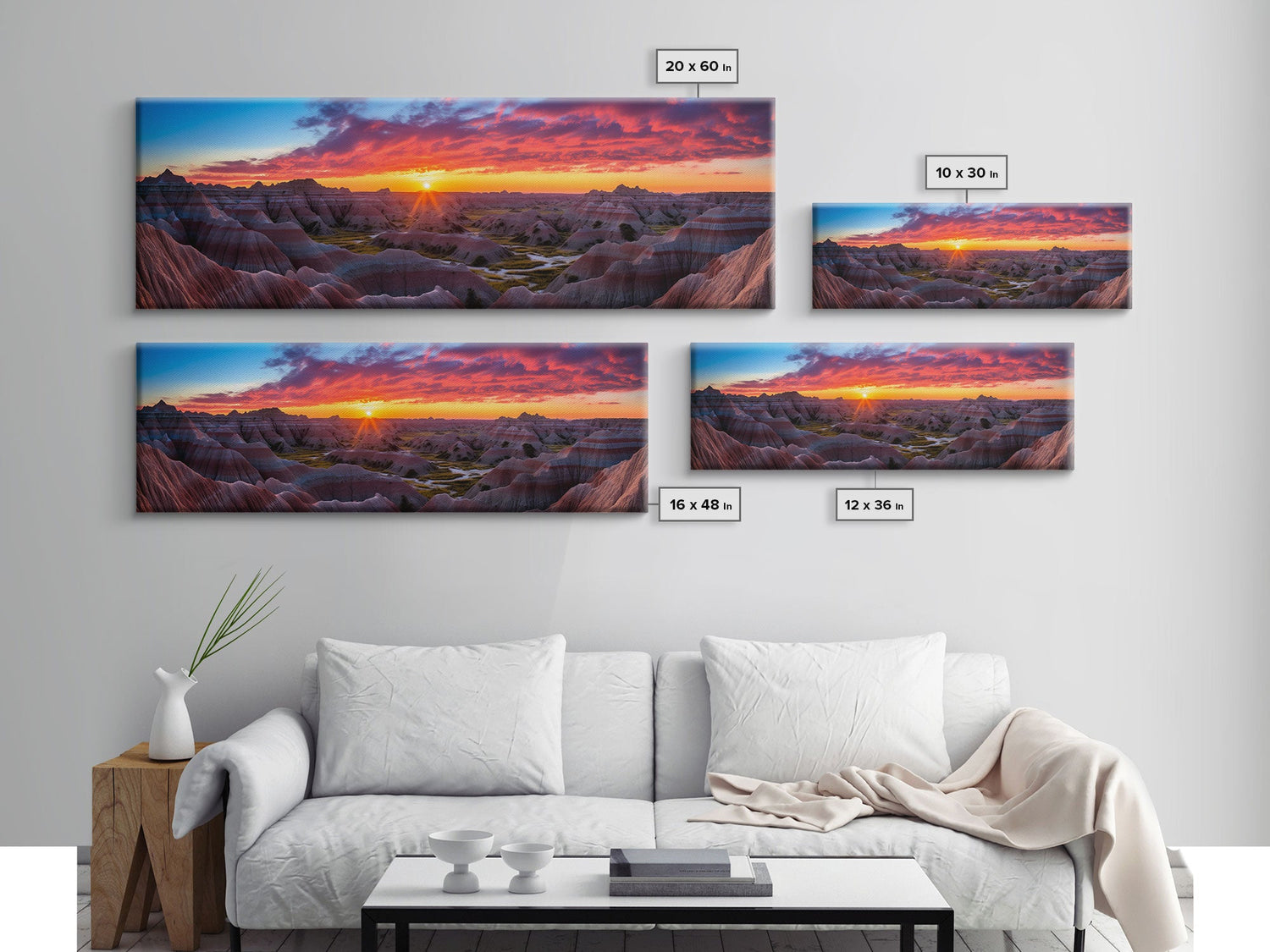 Photographic Panoramic of Badlands National Park, Sunset Photography, National Park Art, Framed Canvas Print, Landscape Photography - 10x30 Inches / No Frame - Stretched Canvas Only is backordered and will ship as soon as it is back in stock.