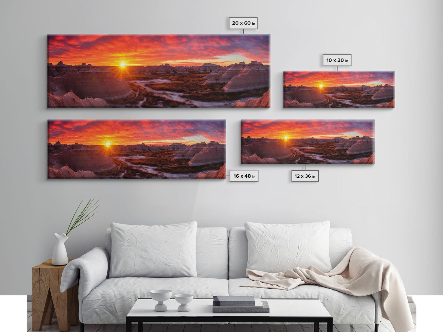 Photographic Panoramic of Badlands National Park, Sunset Photography, National Park Art, Framed Canvas Print, Landscape Photography - 10x30 Inches / No Frame - Stretched Canvas Only is backordered and will ship as soon as it is back in stock.
